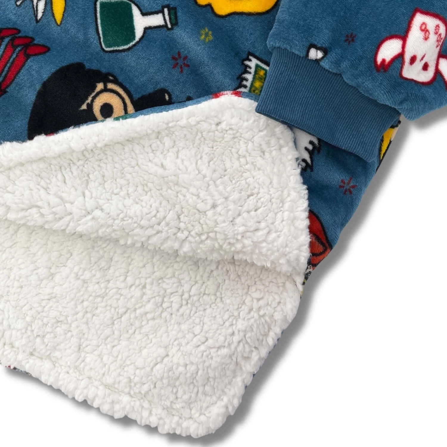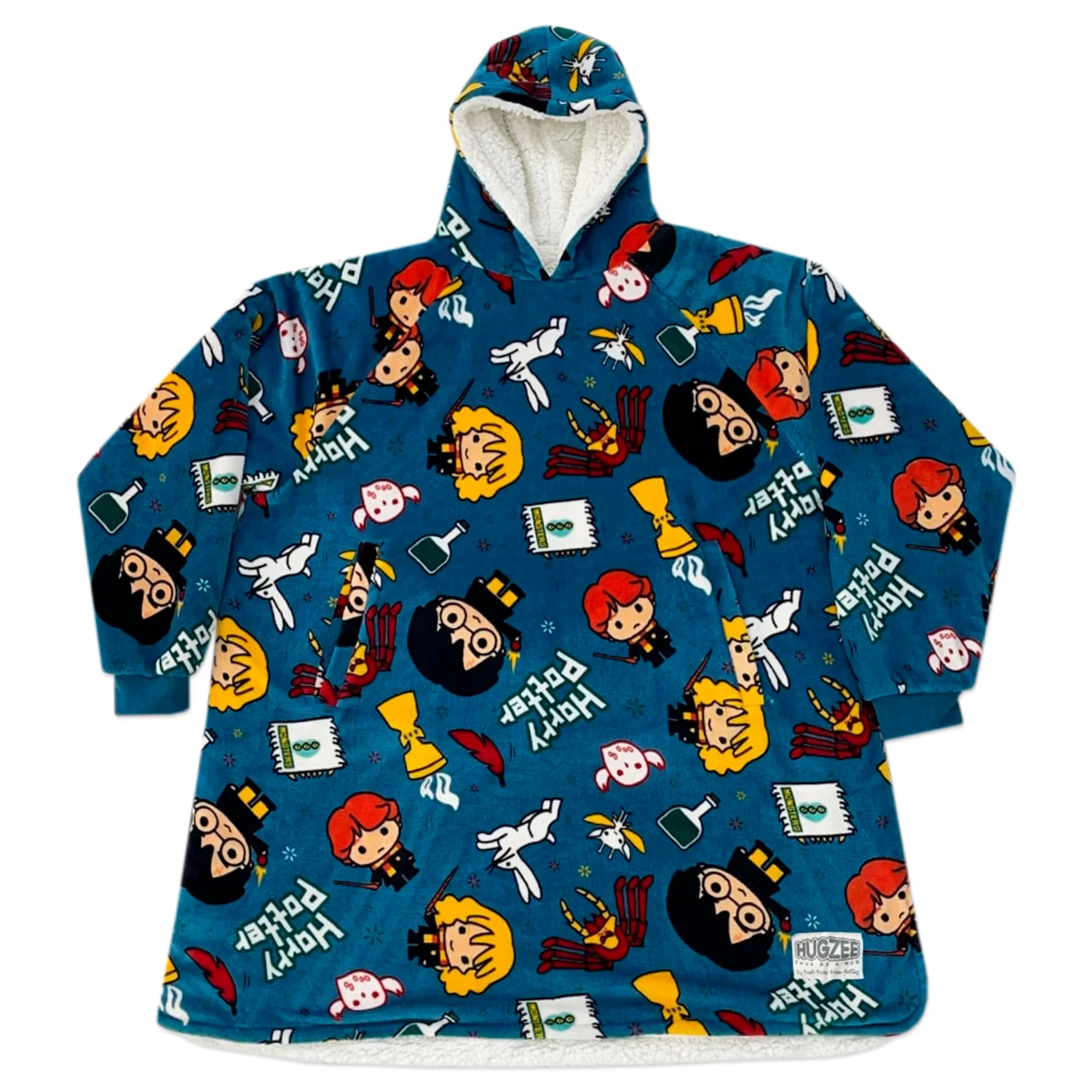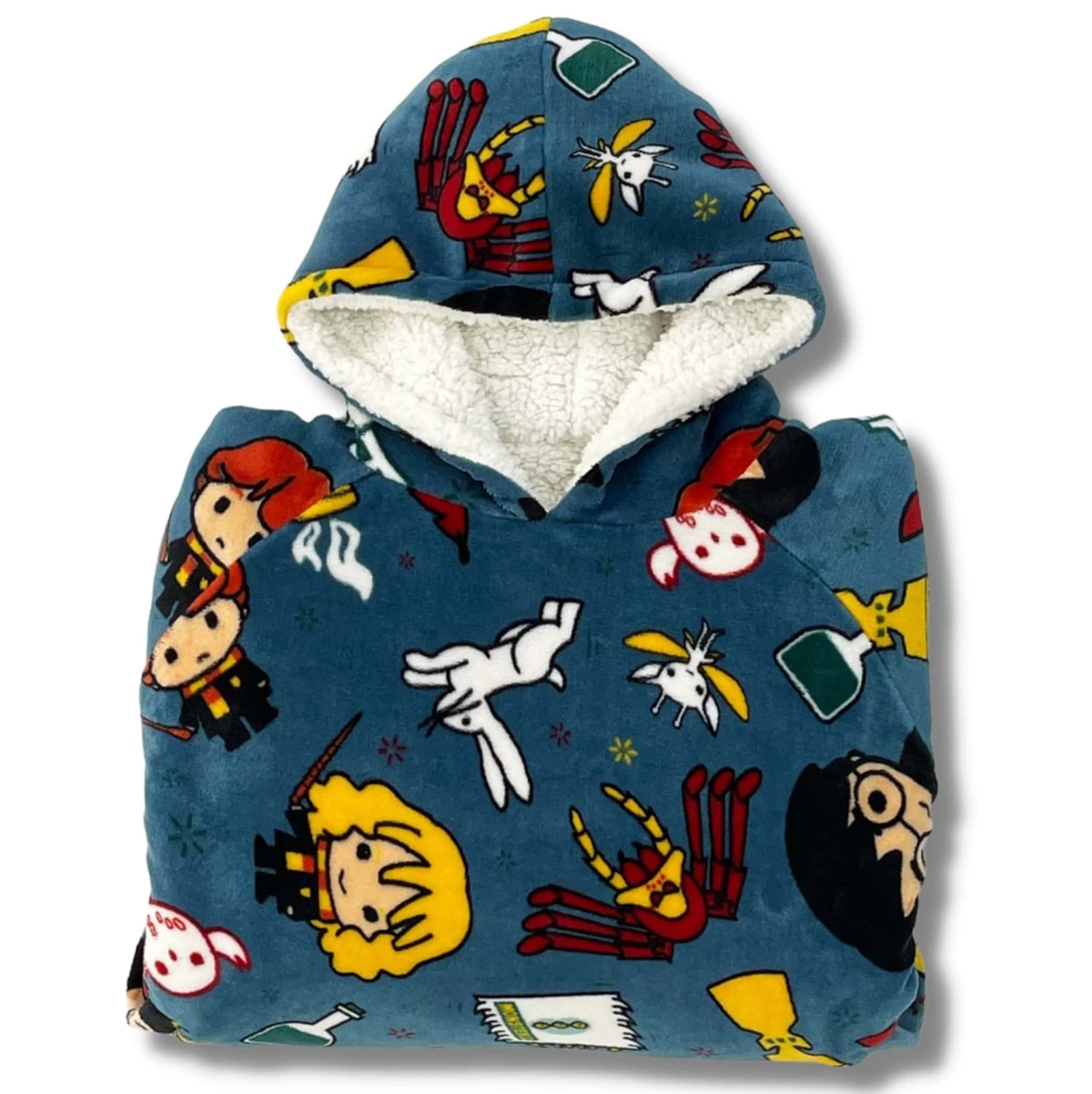 Cast spells in comfort in this Harry Potter fleece blanket hoodie and matching cushion cover set. Featuring an all over motif of Harry, Ron, and Hermione with potions, Pixies, The Goblet of Fire and many more! Complete with a hood and a large front pocket to store your wand and spellbooks. Perfect loungewear to explore Hogwarts in!