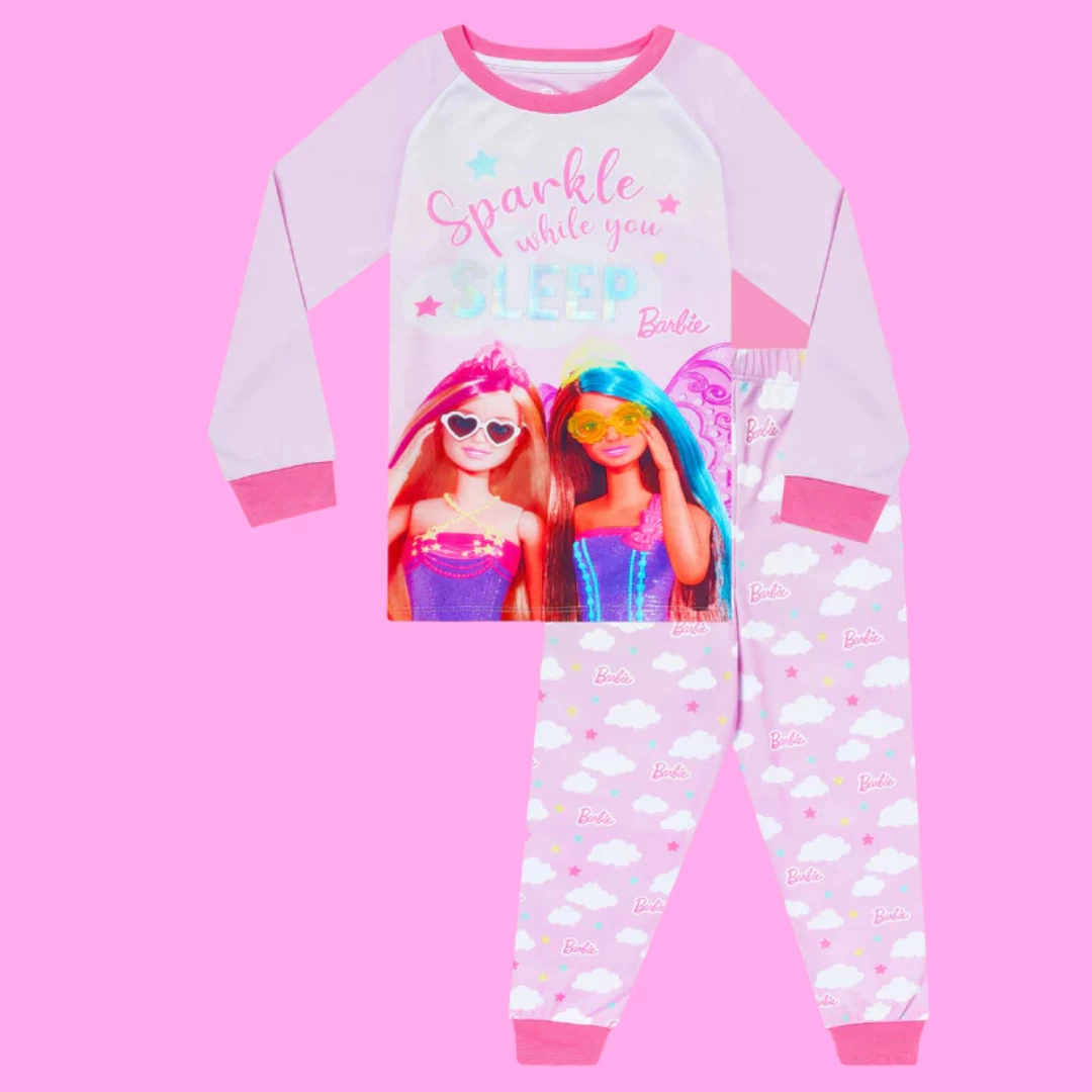 Your little one will be sparkling in their sleep in these adorable Barbie pyjamas. This fabulous pink long sleeve pyjama top features two Barbie dolls wearing crowns and sunglasses. Also featuring the wording ‘Sparkle While you Sleep’ which the word ‘Sleep’ is iridescent foil. Paired with cute pink elasticated waistband bottoms covered in a print of the wording ‘Barbie’, clouds and stars. This pj set will be irresistible to any upcoming fashionistas and will be a perfect addition to their jammie collection.
