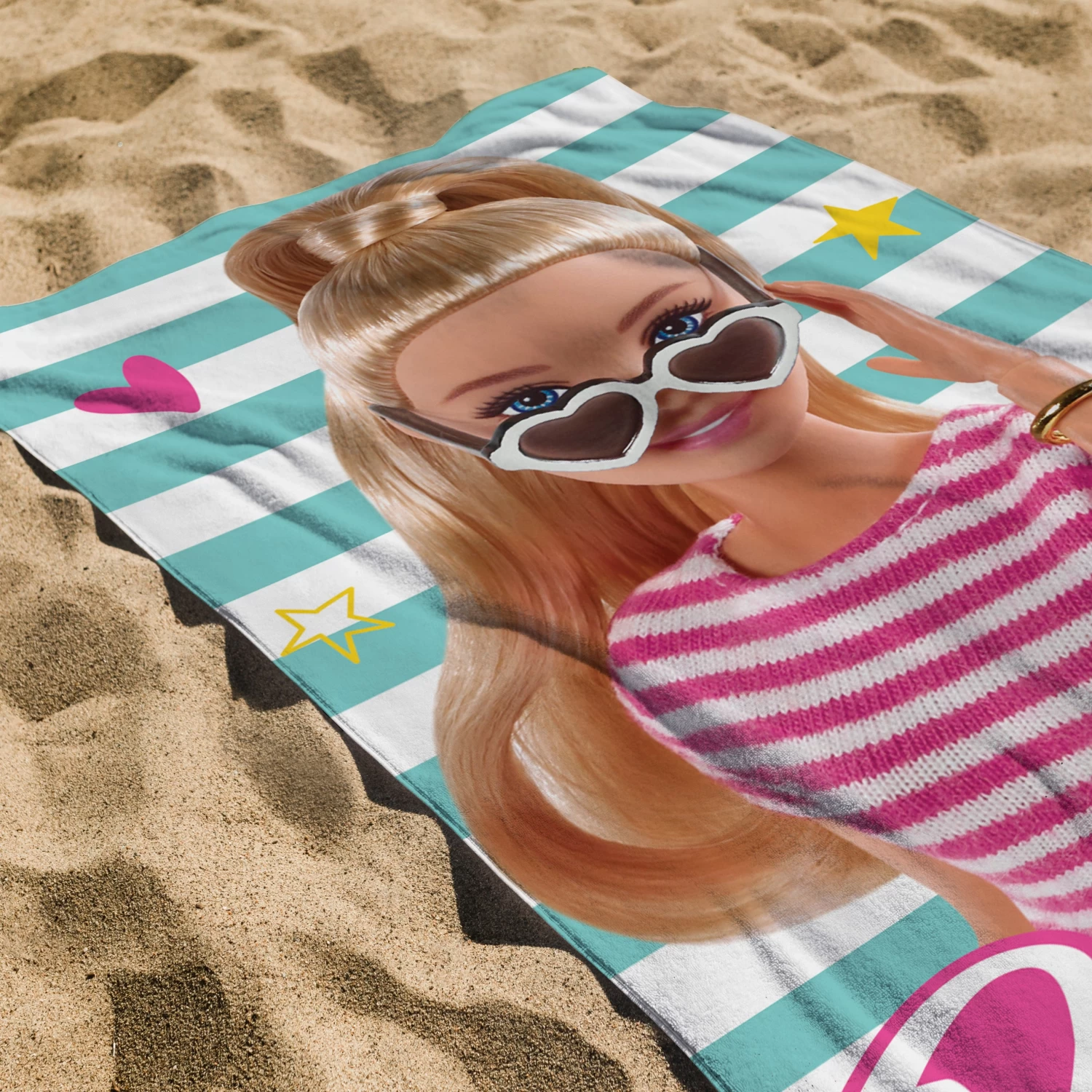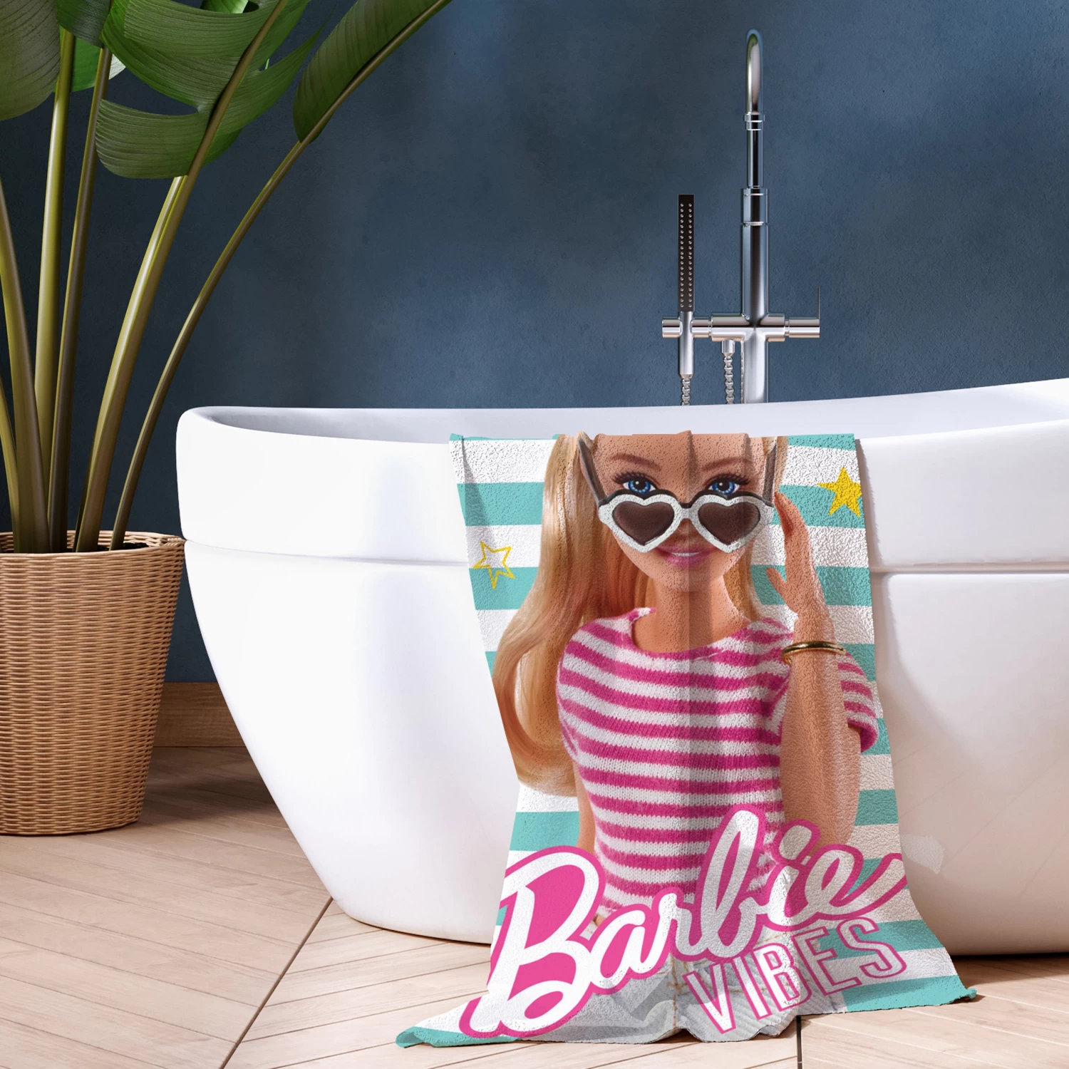 Get ready for a day at the beach with this fun Barbie towel. Featuring a print of Barbie wearing sunglasses over a vibrant blue and white striped background. Also showcases the wording “Barbie Vibes” in a pink and white font. This towel is perfect to dry off with at the beach or pool.