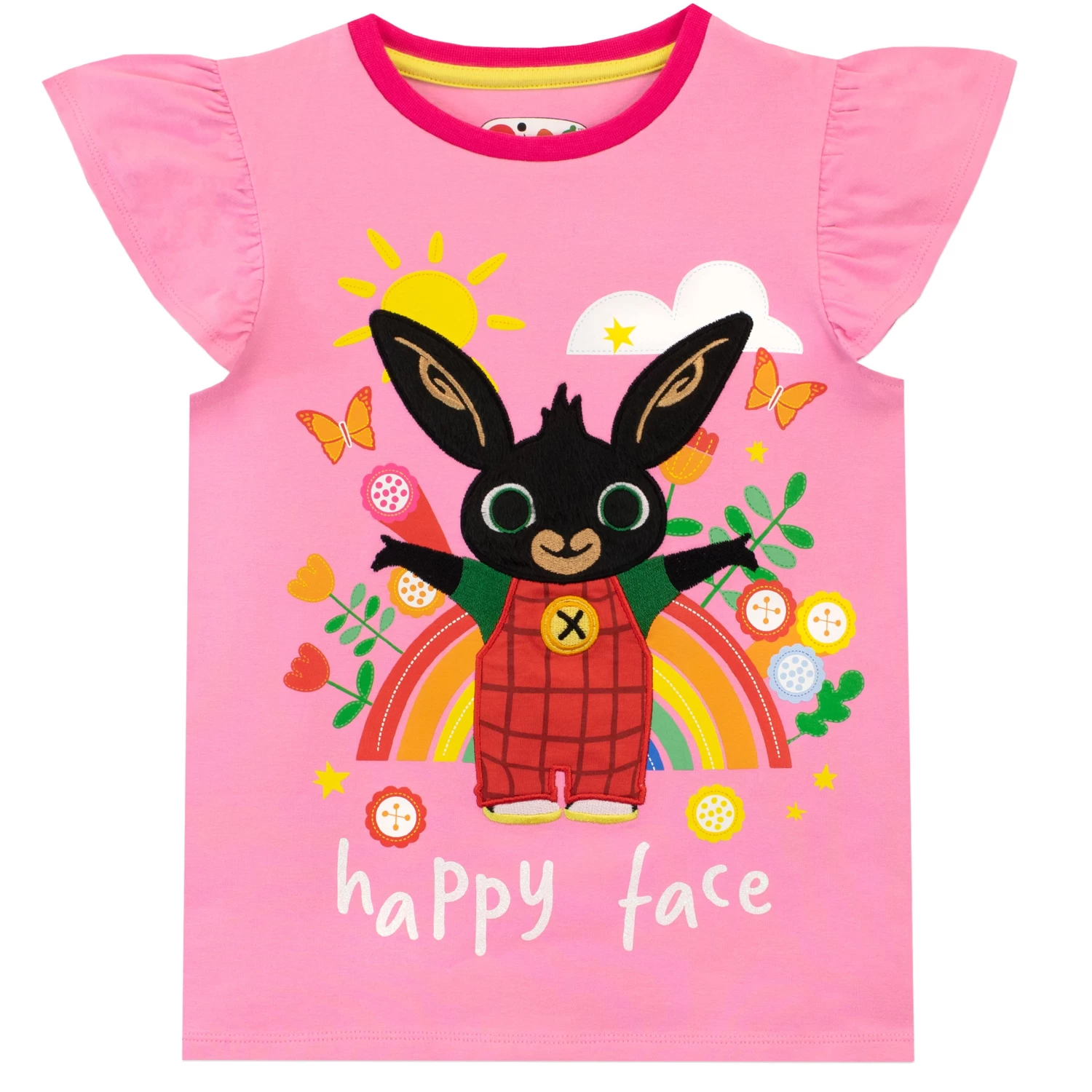 It’s a Bing thing! These fun and colourful jammies are sure to be a hit with little Bunny’s who love the popular Cbeebies show! This pretty pink short pyjama set features a faux fur print of the bunny Bing on the top surrounded by embroidered detailing and a summer themed print of flowers, rainbows and butterflies. Complete with a glitter print of the words ‘happy face’ and all over print pyjama short bottoms.
