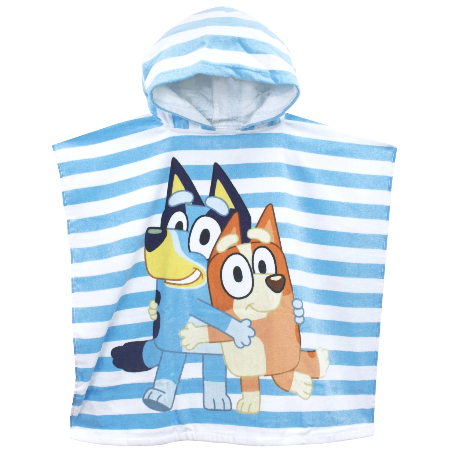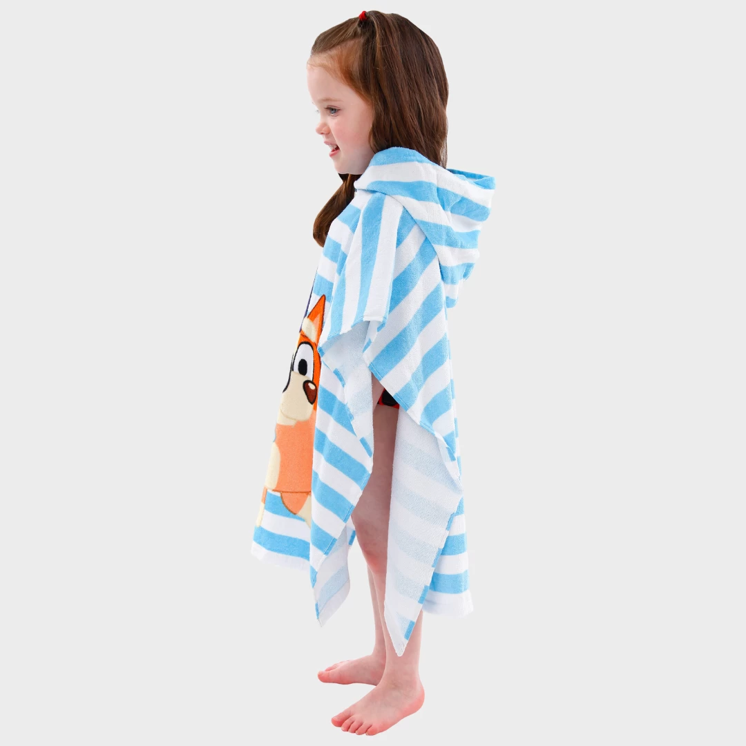 - Level up the excitement after a dip in the water with our Bluey Hooded Towel Poncho for Kids. Let your child channel their inner Bluey or Bingo while staying cozy and dry in this fun-filled, character-inspired poncho! Make bath time a blast with our Bluey Hooded Towel Poncho for Kids! This playful and vibrant blue and white striped poncho features the beloved characters Bluey and Bingo, adding a touch of fun to drying off. Keep your little one cozy and entertained with this character-inspired towel poncho, perfect for young fans of the popular animated series. Get ready for imagination-filled adventures with Bluey and Bingo at every bath!