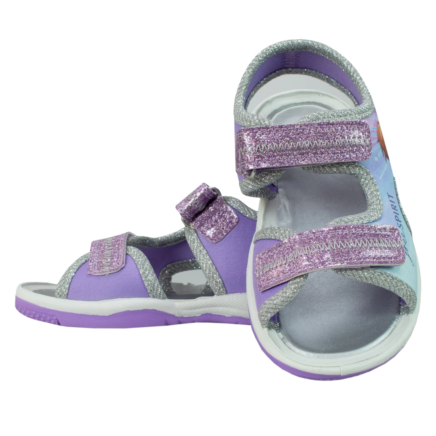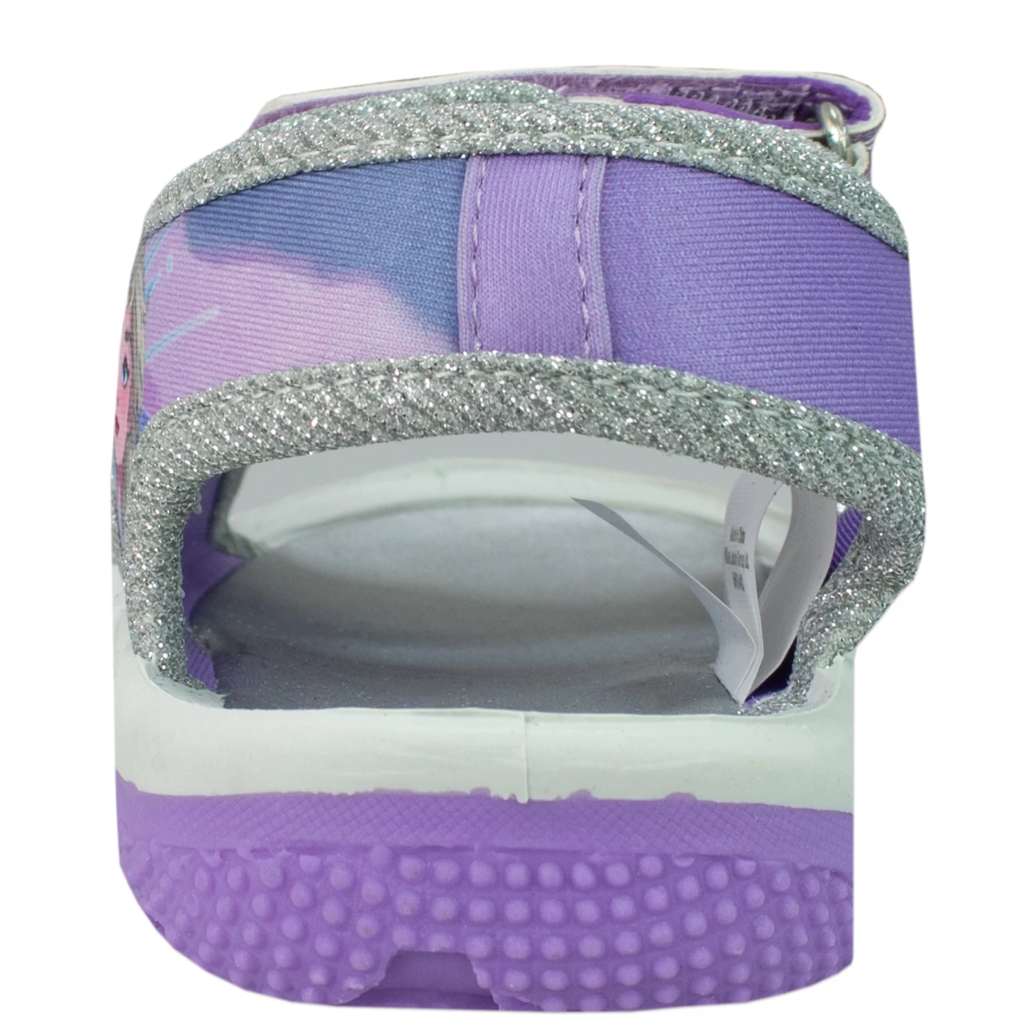 Stride into a world of magic with our Disney Frozen sandals! Be the talk of the playground with Elsa and Anna and the words “free spirit” over a beautiful blue and purple backdrop, and twinkle with every step thanks to our pretty pink and purple glitter straps. A special silver glitter trim makes these the prettiest shoes around! Plus, they’re super comfy and sturdy with our purple and white soles – perfect for all-day play and royal adventures!