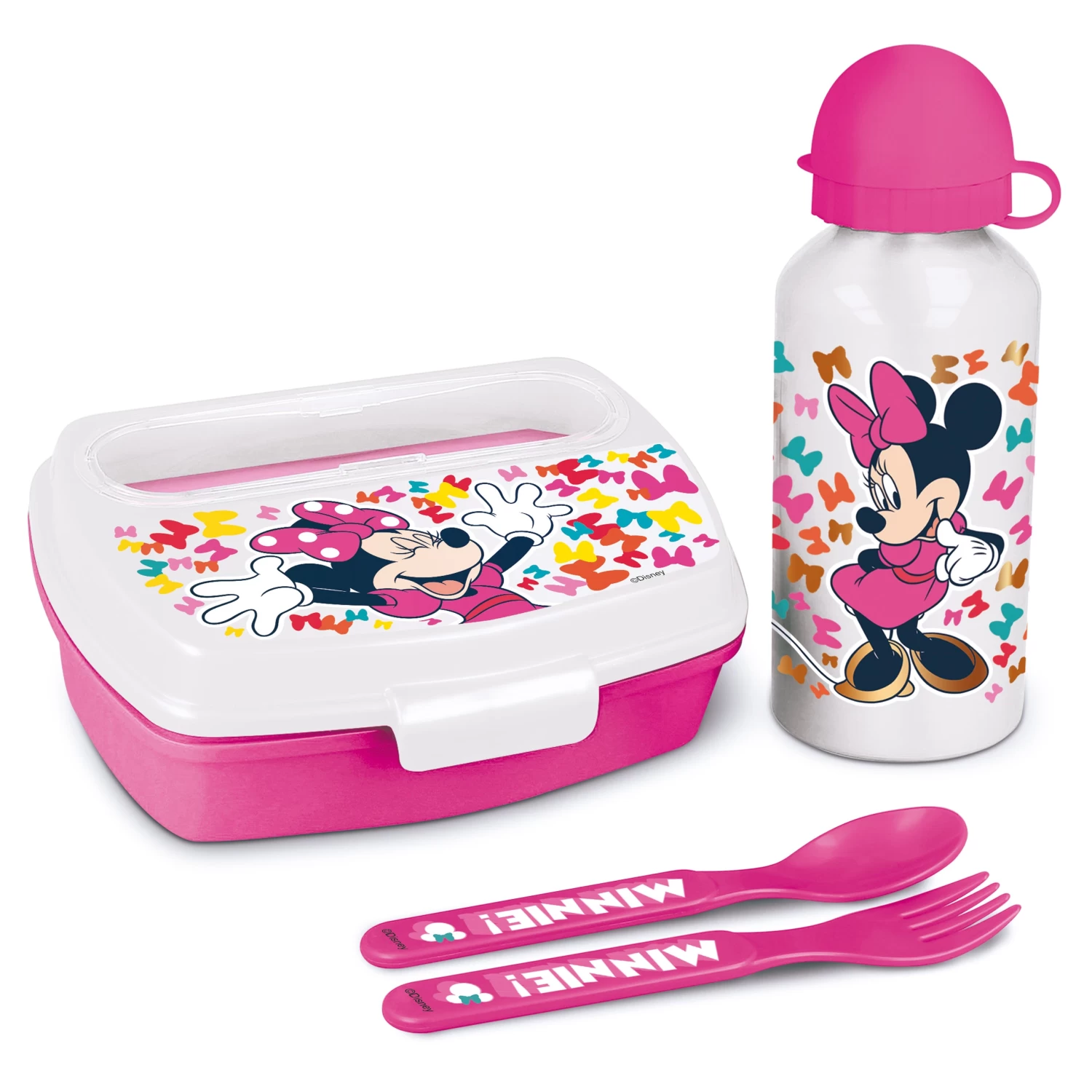 - Comes with a matching water bottle and a pink spoon and fork set, bearing ‘Minnie!’ across the handles.