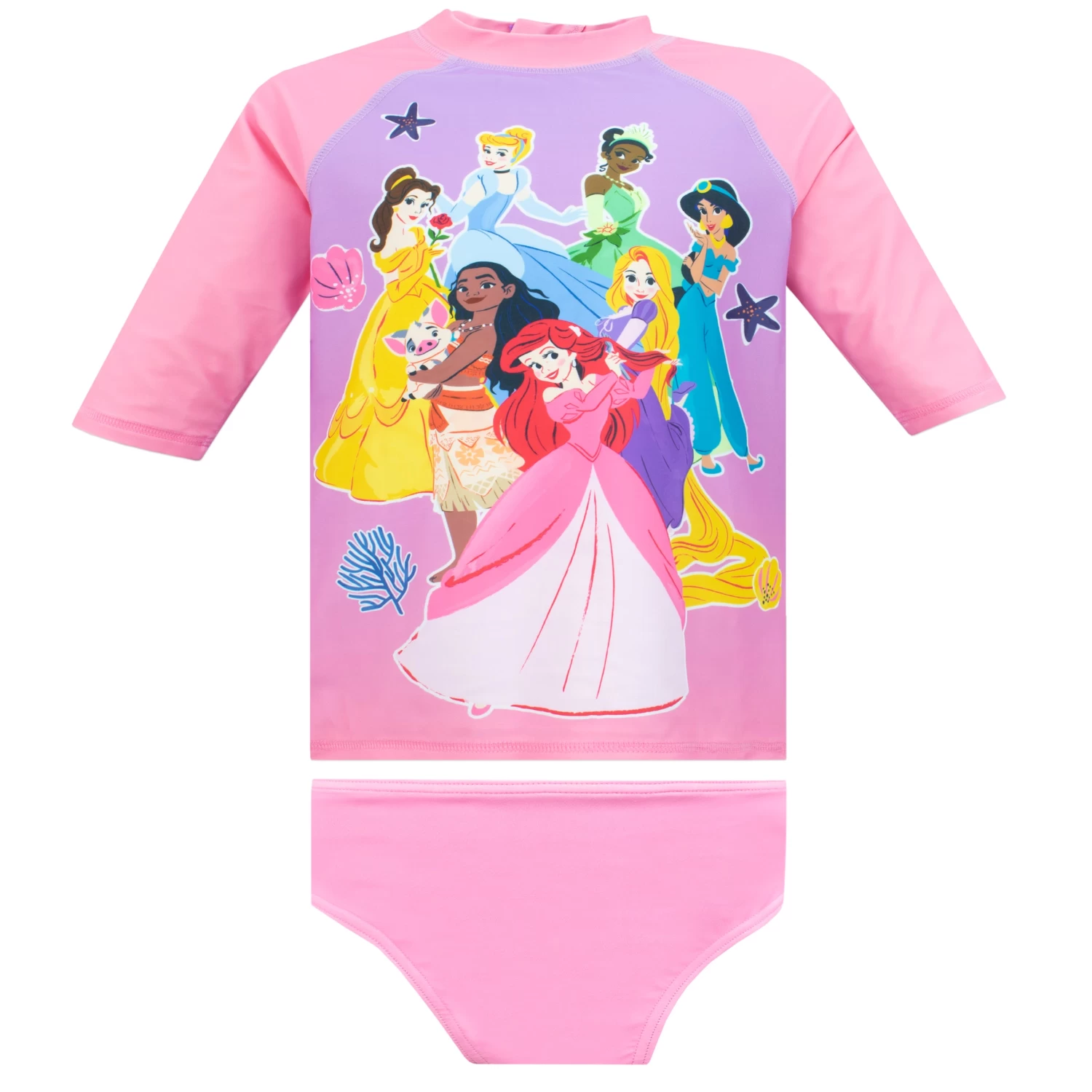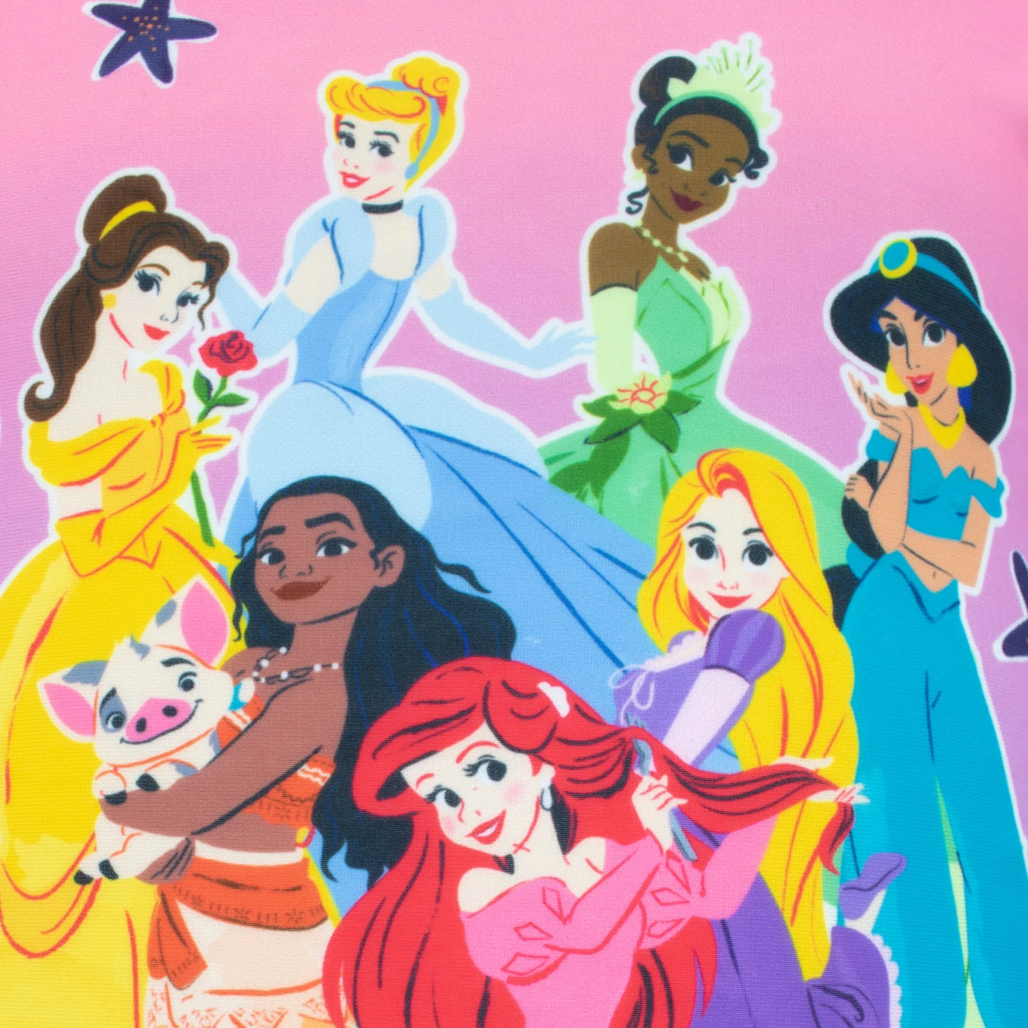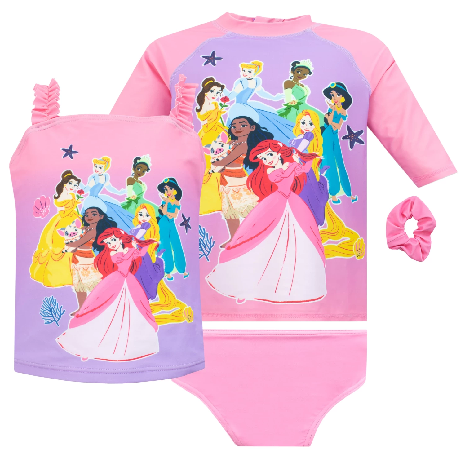 Make a splash in this cute Disney Princess Pack of 4 Swimset. This swimsuit features a pink rash guard set including two swim tops, one with short sleeves and the other with ruched straps with the same main image of the Disney princesses like, Rapunzel, Ariel, Belle, Cinderella, Tiana and Jasmine. Paired with matching pink swim bottoms and a cute pink scrunchie perfect for exploring a whole new world. This swimming costume is perfect for the beach or pool for any princess!