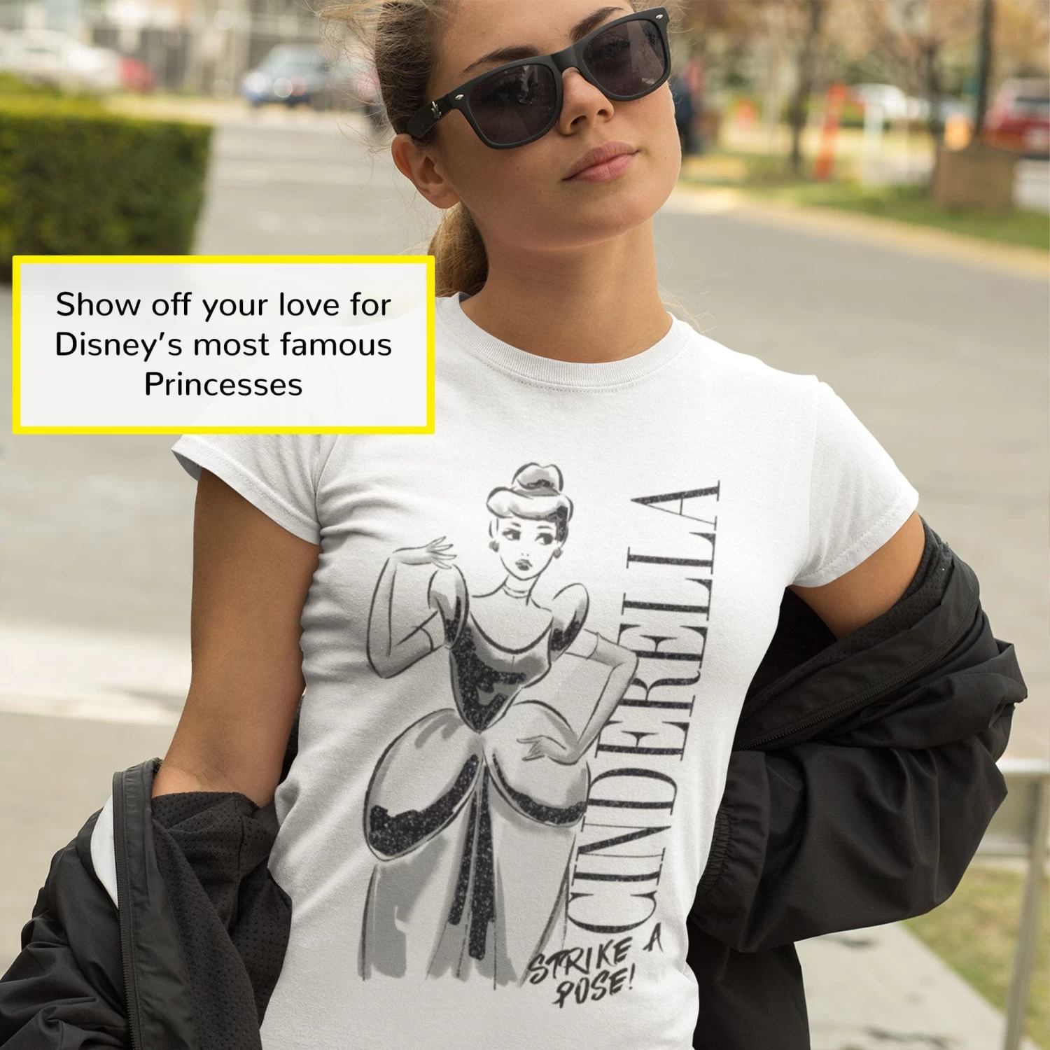 Your fashion game is strong even when it is casual and low-key, with this Women’s Cinderella t-shirt. This Ladies Disney Princess t-shirt features Cinderella striking a graceful pose, which when combined with a glitter detail gives you an abundant dose of good vibes as you dress up and step out. A souvenir for all things royal, the t-shirt is also a great gift for a fan of Disney movies.