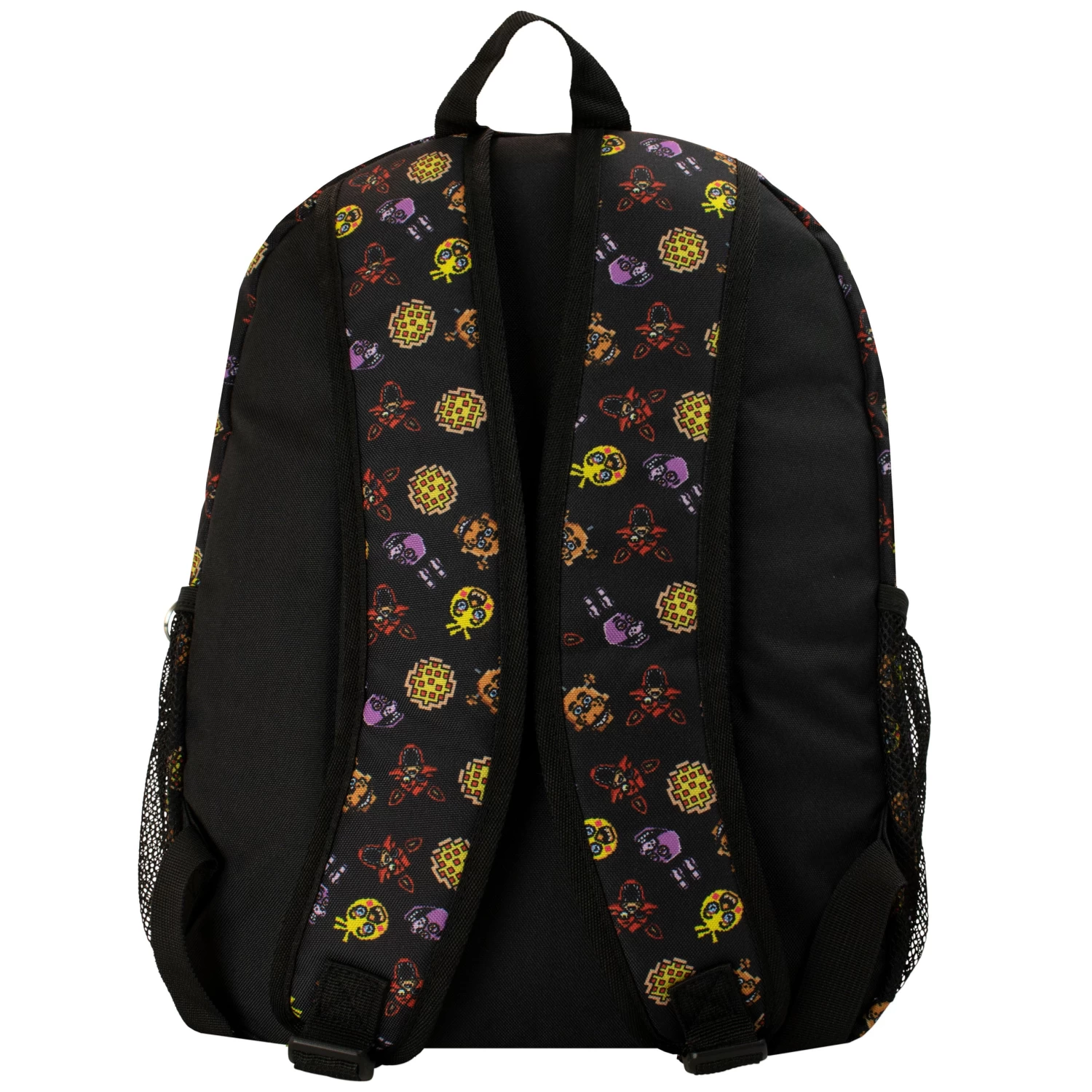 Get the true gamer look with this jaw dropping Five Nights at Freddy’s backpack. This cool black rucksack is sure to be a favourite with gaming fanatics as it features Freddy Fazbear, Bonnie, Chica and Foxy as an all over motif design! Also a rubberized image of Freddy by himself in the centre of the backpack. A zipped main compartment and front pocket allows you to carry all your gaming essentials, goodies and survival gear. A hanging loop, mesh side pockets, and adjustable padded straps finish off this awesome rucksack. This backpack is perfect for sleepovers but maybe avoid any pizzeria’s that you get invited too.