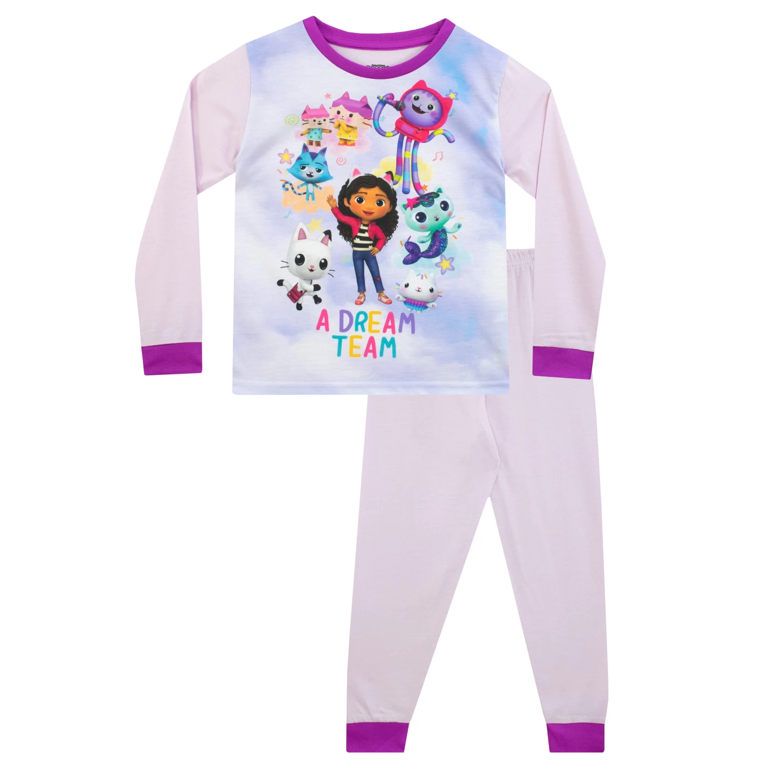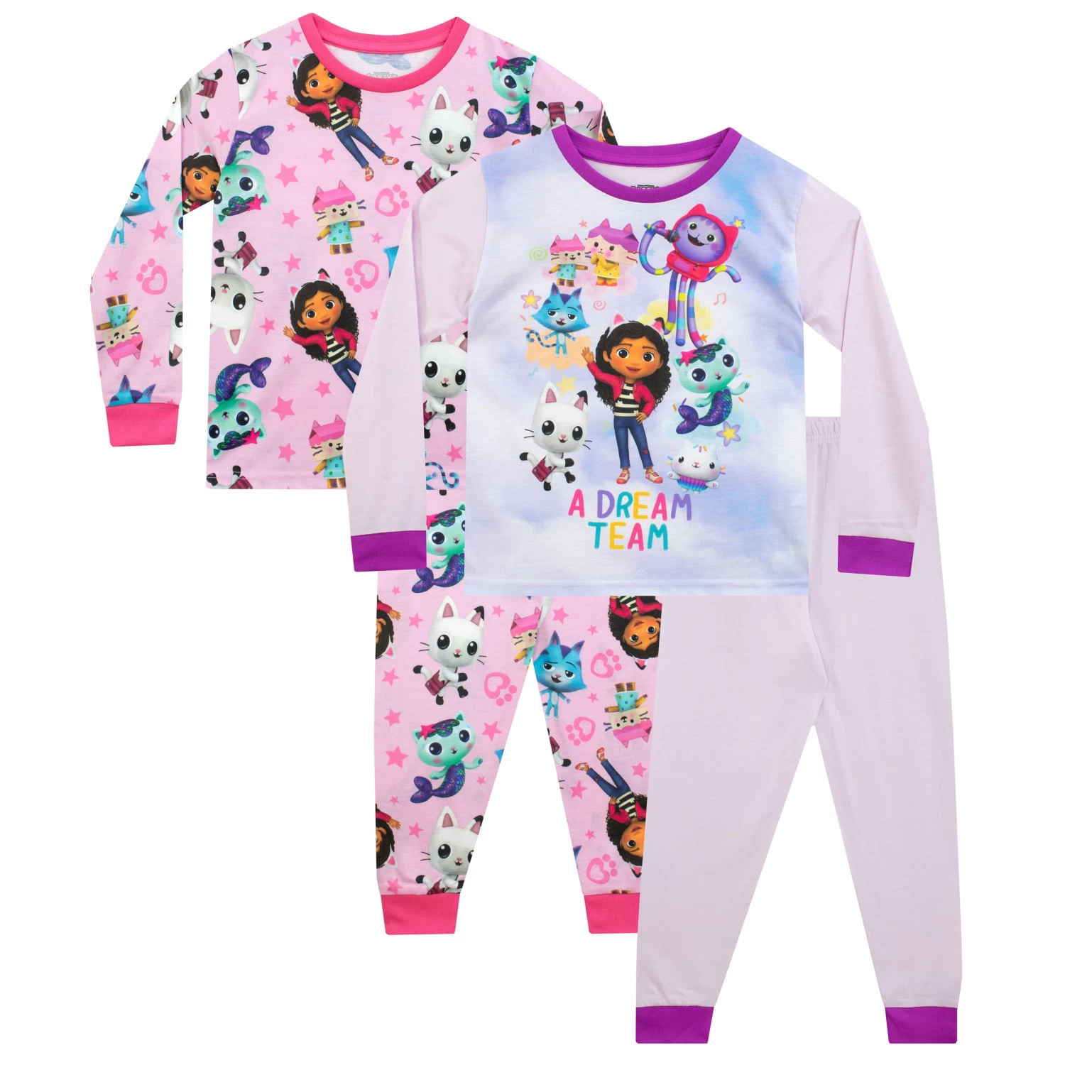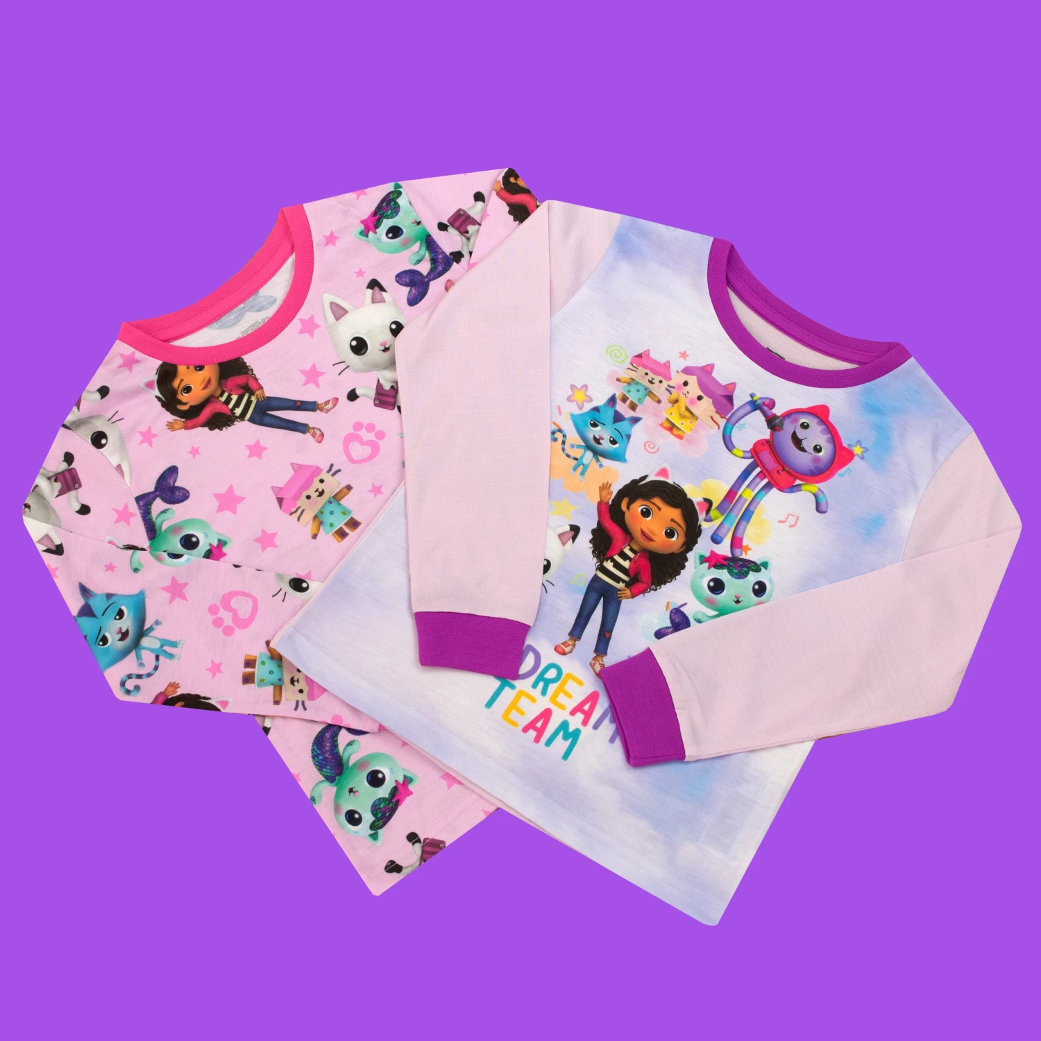 - 2-pack Gabby’s Dollhouse pyjamas: One showcases a “Dream Team” with Gabby & friends on a cloudy background, while the other dazzles with a repeating Gabby pattern against a starry pink backdrop.