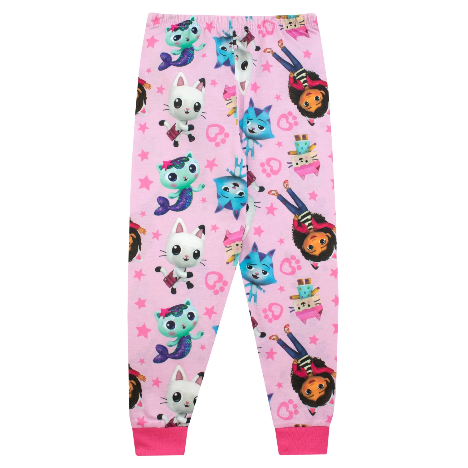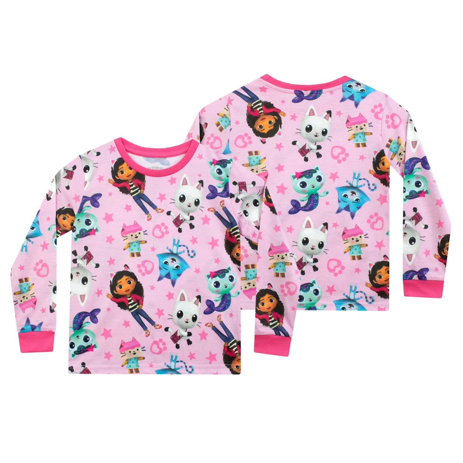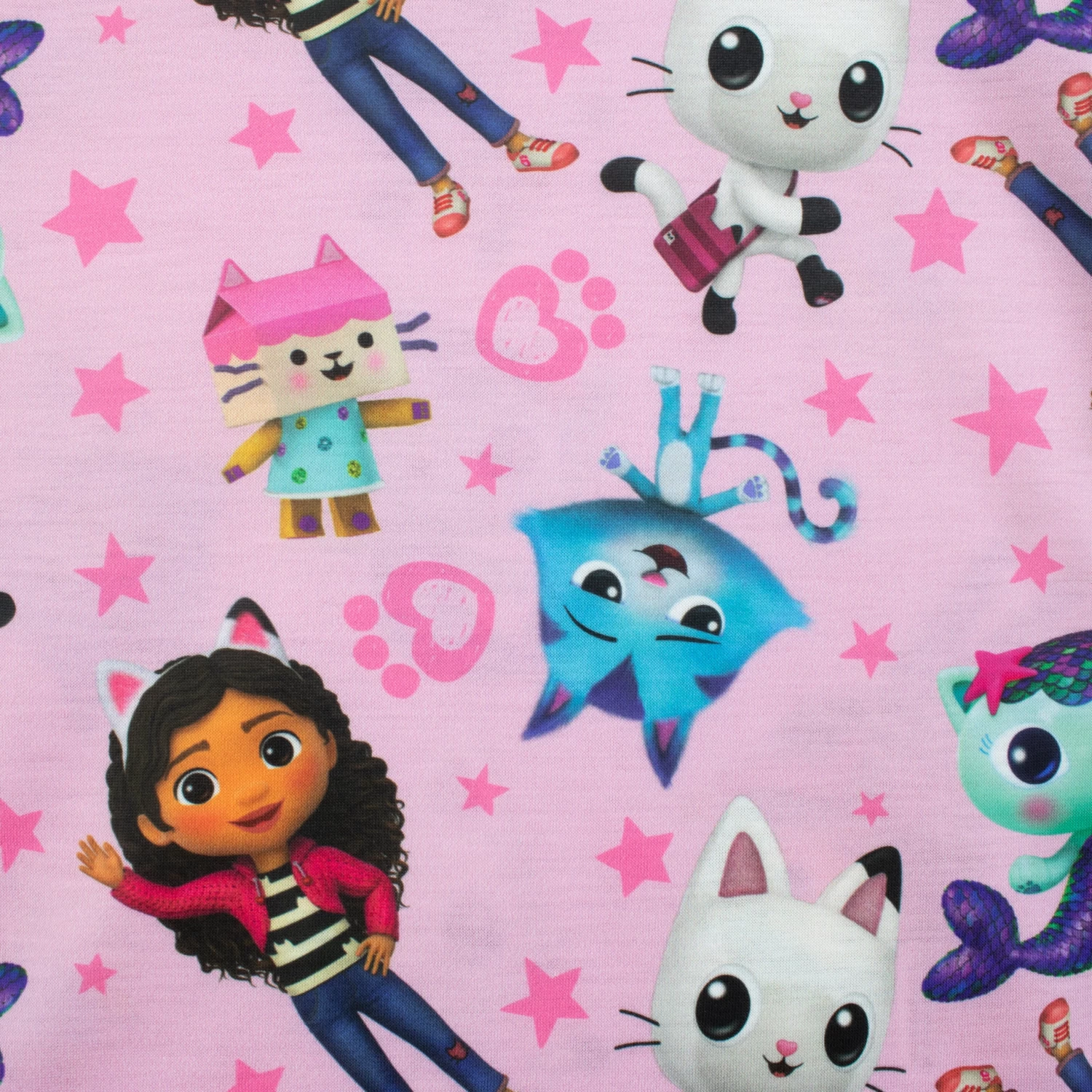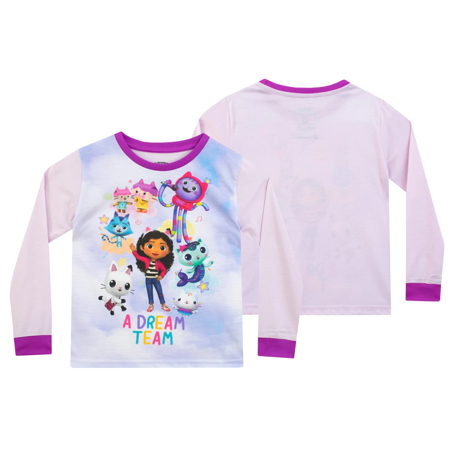 - 2-pack Gabby’s Dollhouse pyjamas: One showcases a “Dream Team” with Gabby & friends on a cloudy background, while the other dazzles with a repeating Gabby pattern against a starry pink backdrop.