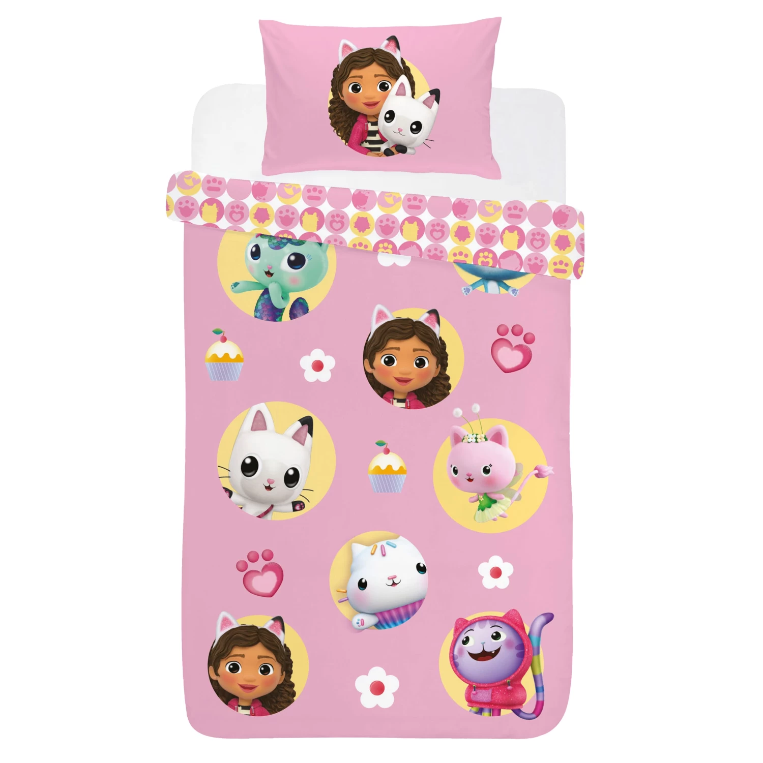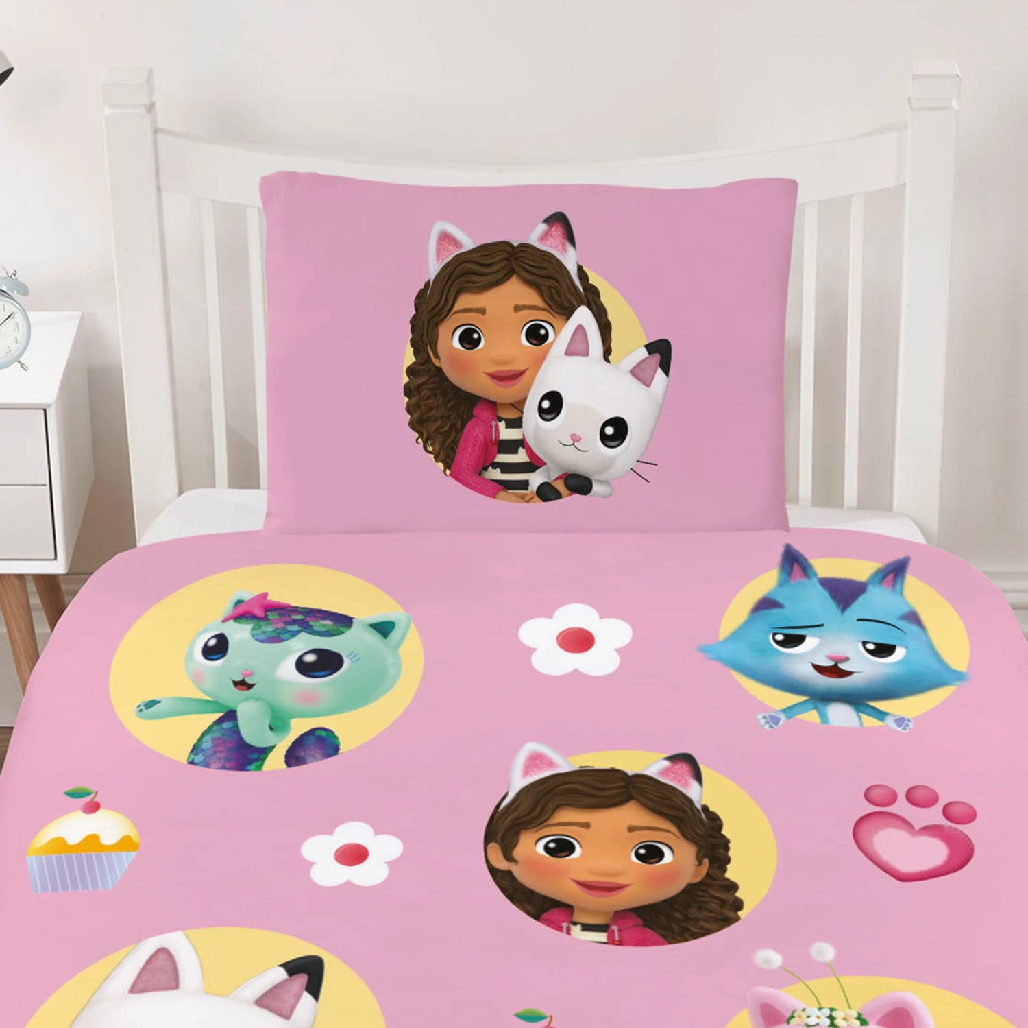 Transform your little one’s bedroom into a magical world with the Kids Gabbys Dollhouse single duvet set! In sweet shades of light pink, this delightful bedding ensemble stars Gabby and her furry friends – Pandy Paws, Mercat, Cakey Cat, Catrat, DJ Catnip, and Kitty Fairy – playfully surrounded by daisies, paw prints, and cupcakes! The set includes a single duvet cover and a matching pillowcase, both featuring Gabby and Pandy Paws, making bedtime an enchanting adventure. Pair it with our Gabby cushion and blanket to complete the themed bedroom that fans will absolutely adore! Let their imagination run wild in the world of Gabbys Dollhouse, where dreams come true with every snuggle!