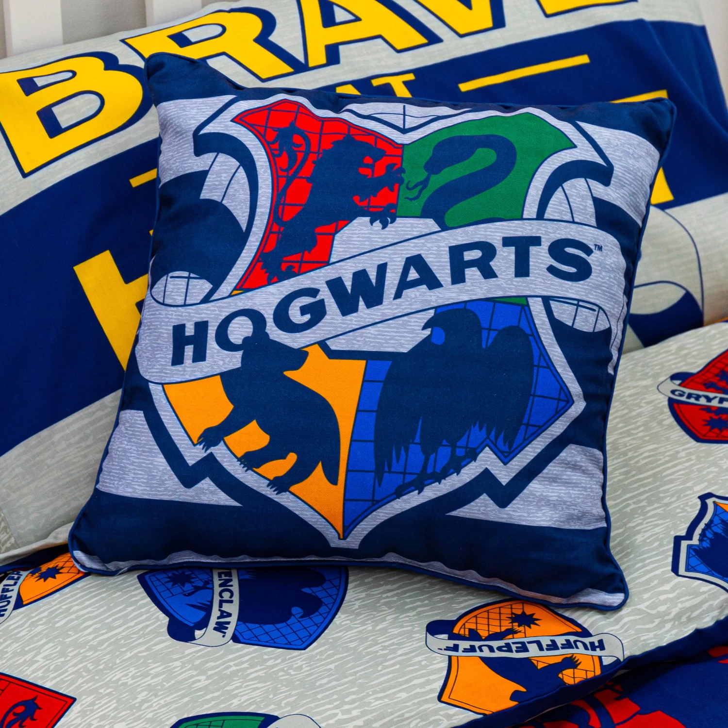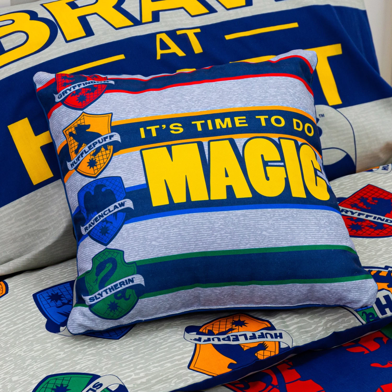 After a day of casting spells and riding brooms get super comfy with this Harry Potter cushion. One side of this fun pillow features a large Hogwarts crest over a blue and grey striped background. The reverse side shows the Gryffindor, Slytherin, Ravenclaw and Hufflepuff house crests and the wording “It’s time to do Magic” over a striped background.