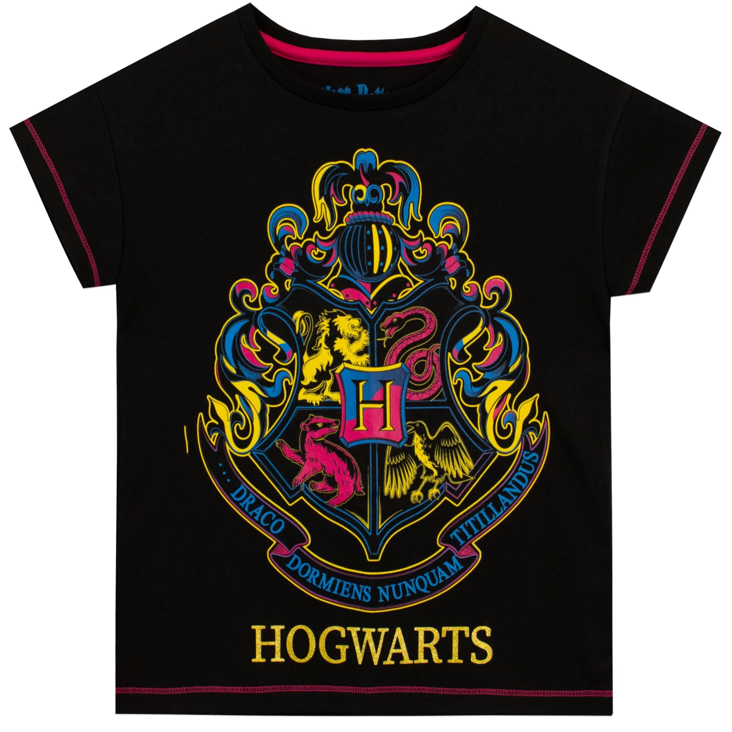 A spellbinding pair of PJs to add some magic to bedtime! The set includes a short sleeved t-shirt in black featuring the Hogwarts crest in a bold colourful print with the word ‘Hogwarts’ in gold glitter. Paired with contrast pink short pyjama bottoms with a star motif, this enchanting PJ set is a must have for any wannabe wizard!