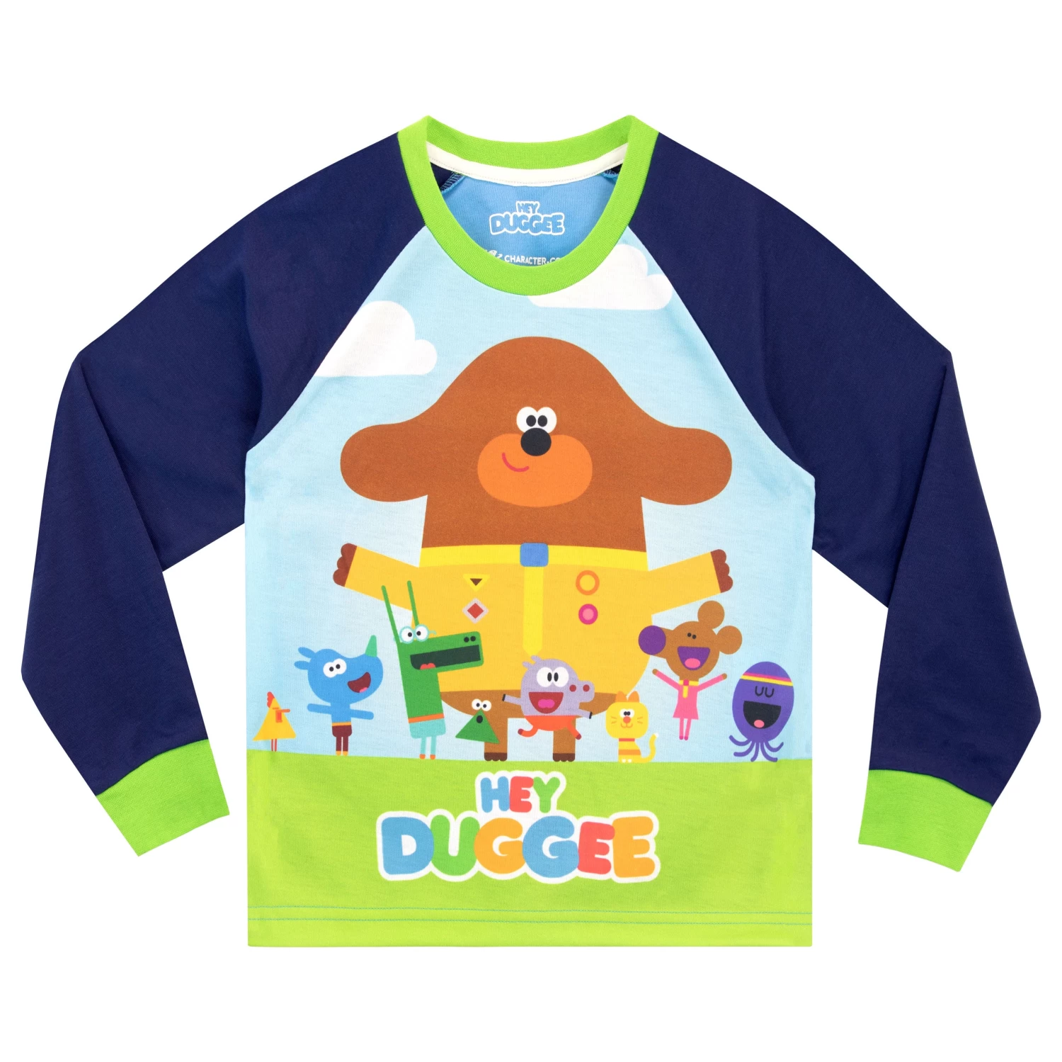 Earn a bedtime badge in these adorable Hey Duggee PJs! Featuring Squirrel Club favourites Duggee, Betty, Norrie, Enid, Roly, Happy, and Tag in a colourful print on the top with contrasting blue sleeves and green elasticated cuffs. Paired with matching blue bottoms with an all-over motif of the Hey Duggee logo and the members of the Squirrel Club, these jammies will have your little one dreaming of exciting adventures in the clubhouse with all their squirrel friends!