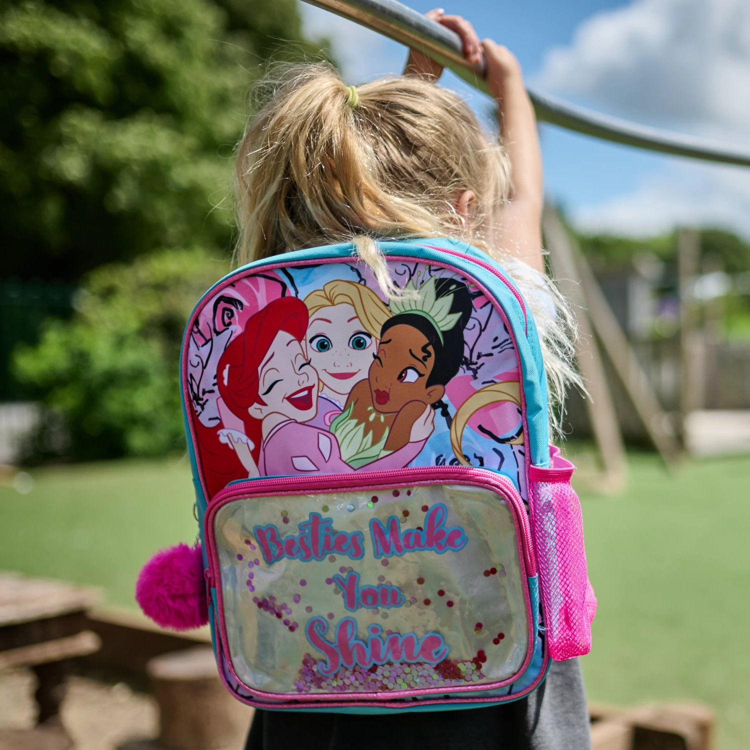 Celebrate the magic of friendship with this adorable Disney Princess backpack! Featuring princesses from The Little Mermaid, Tangled and The Princess and The Frog, this colourful rucksack has a pink pompom zip pull, a mesh side pocket and a front pocket which features the slogan ‘Besties Make Your Shine’ as well as an iridescent layer containing sequins to give the bag some extra sparkle. This magical bag is perfect for school or for exploring fairytale kingdoms with friends! Approximate Dimensions: H:36 x W:28 x D:12 cm