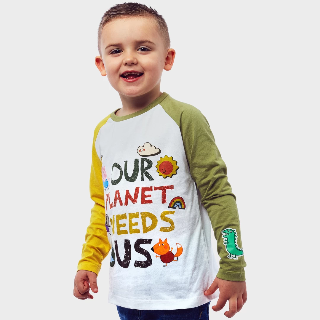 Inspire your little piglet to love and care for the planet with this adorable long sleeved George Pig tee! This white tee has contrasting yellow and green raglan sleeves and showcases the slogan ‘Our Planet Needs Us’ surrounded by nature-themed imagery as well as George Pig and friends, and Mr Dinosaur printed on the left sleeve. If your little piggy loves to play in the mud, then get them ready for a day out in nature with this cute eco-conscious top!