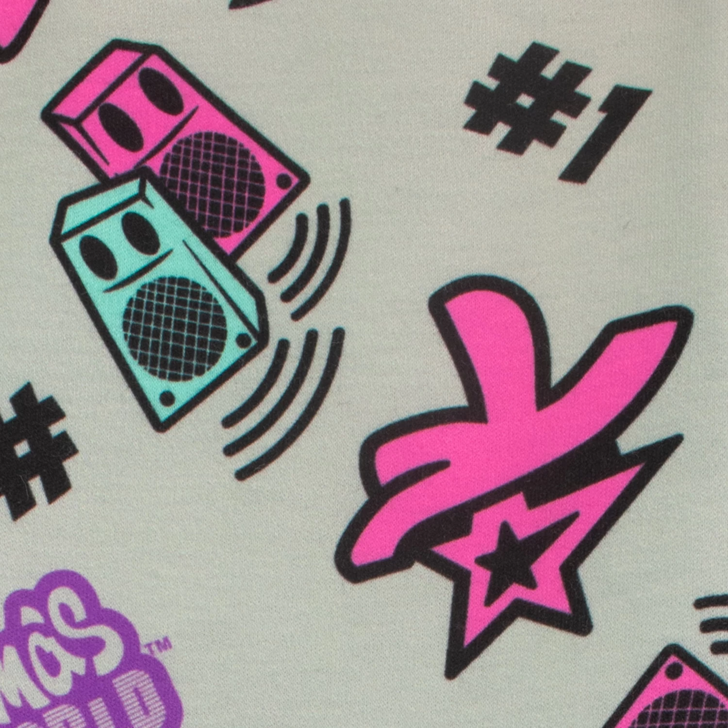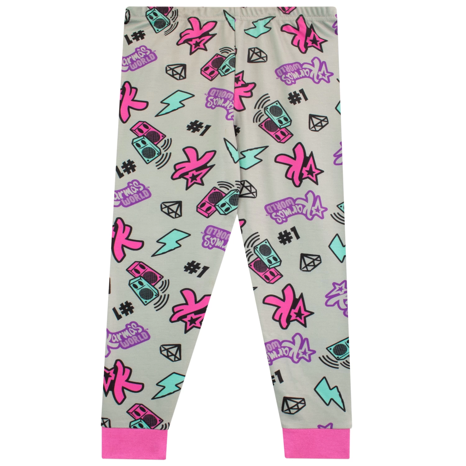 Get ready to follow your dreams in this cute Karma’s World pyjama set. Featuring Karma centre stage surrounded by cute motifs and music symbols. This pink and blue long sleeve top also has the words ‘Road to Greatness’ and ‘Follow Your Dreams’ in bold yellow font. Paired with grey bottoms with a bold colourful print all over of Karma’s World motif and music symbols. This funky set will get your little music inspired fan ready for bed and ready for a musical night of dreams.