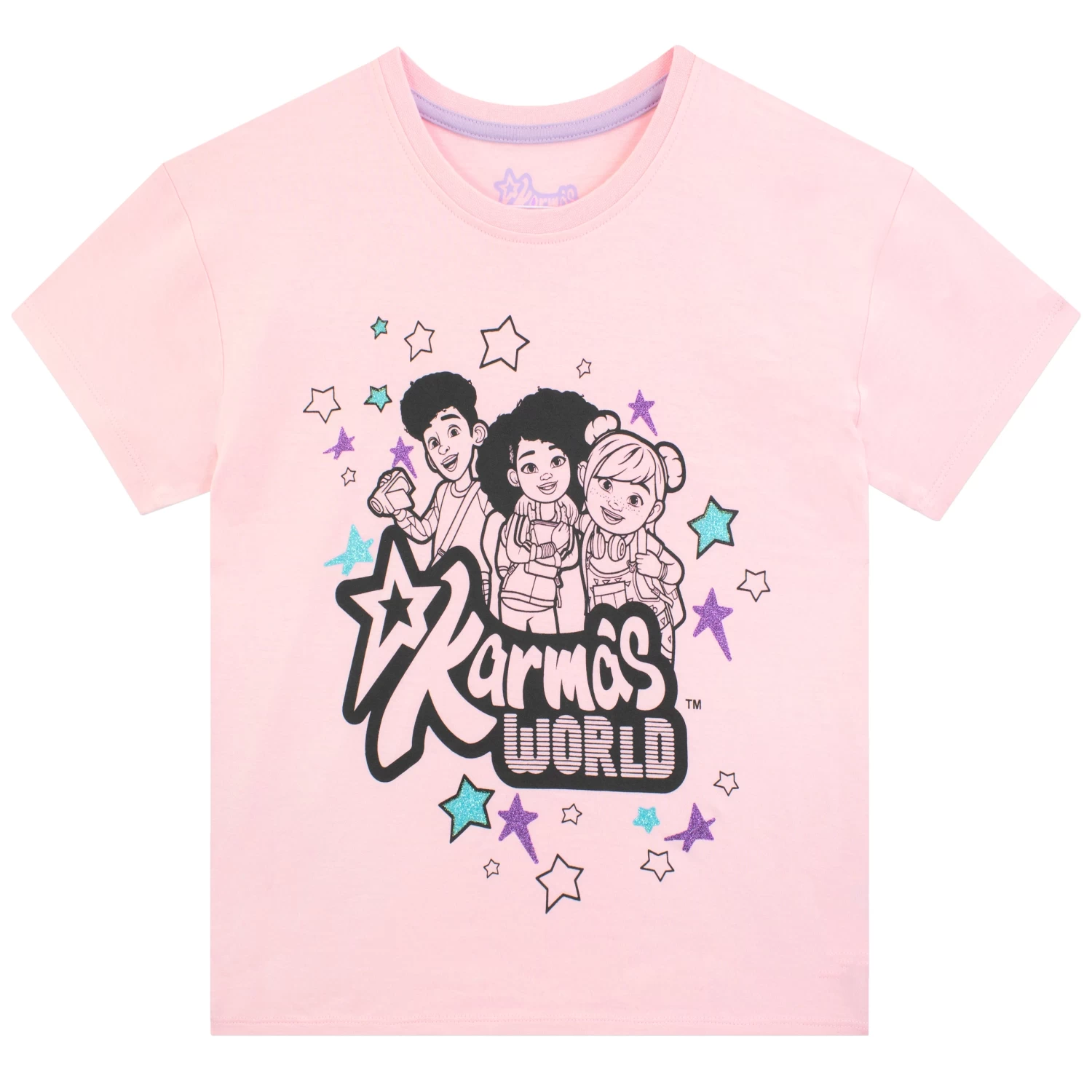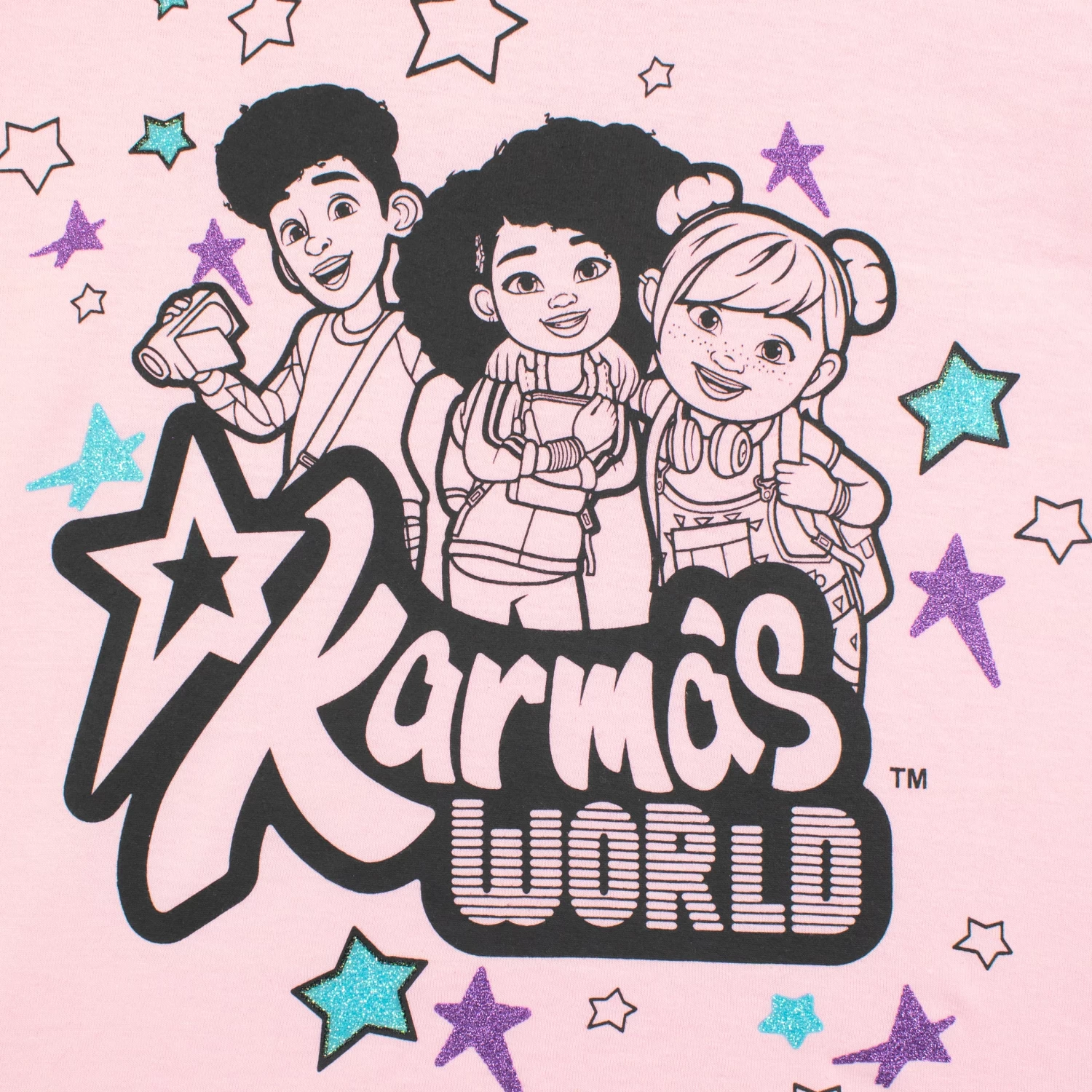 Watch them rock the mic with Karma and friends in this awesome Karma’s World t-shirt! This pink short sleeve tee showcases Karma and friends Switch and Winston with the title ‘Karma’s World’, surrounded by blue and purple glittery stars. Your aspiring rap star will shine on the stage in this cute sparkly top!