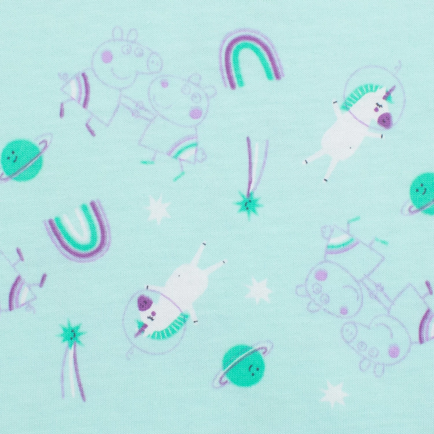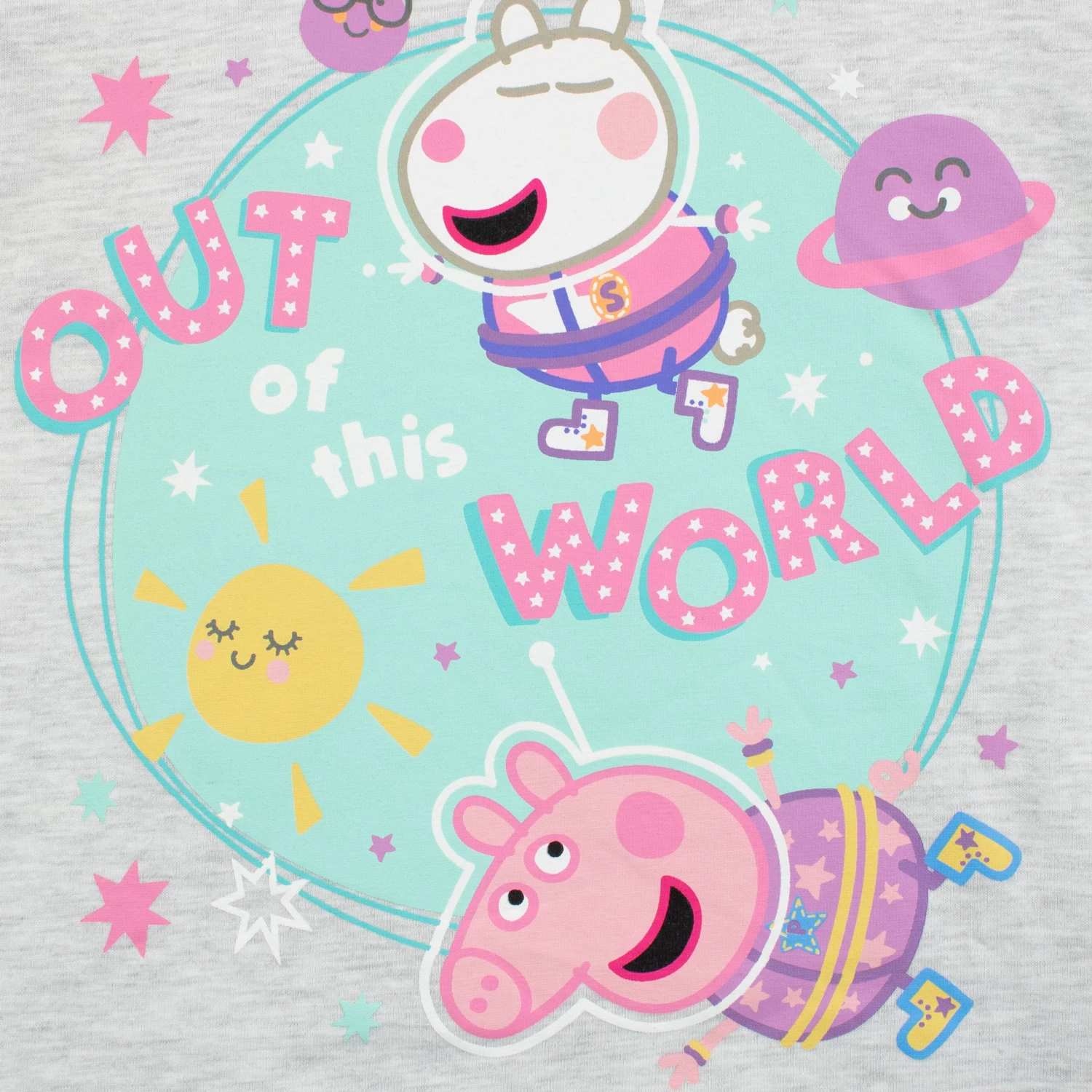 Your piglet will be ready to zoom off through the galaxy with Peppa Pig for out of this world adventures in these adorable PJs! The long sleeve grey pyjama top showcases Peppa and Suzy Sheep floating around in space. Paired with pink pj bottoms with a comfy elastic waistband. The short sleeve blue pyjama top has an all-over print showing Peppa and Suzy Sheep holding hands surrounded by smiling planets, shooting stars and space unicorns. Paired with matching bottoms with a comfy elastic waistband. This sleepwear set is out of this world!