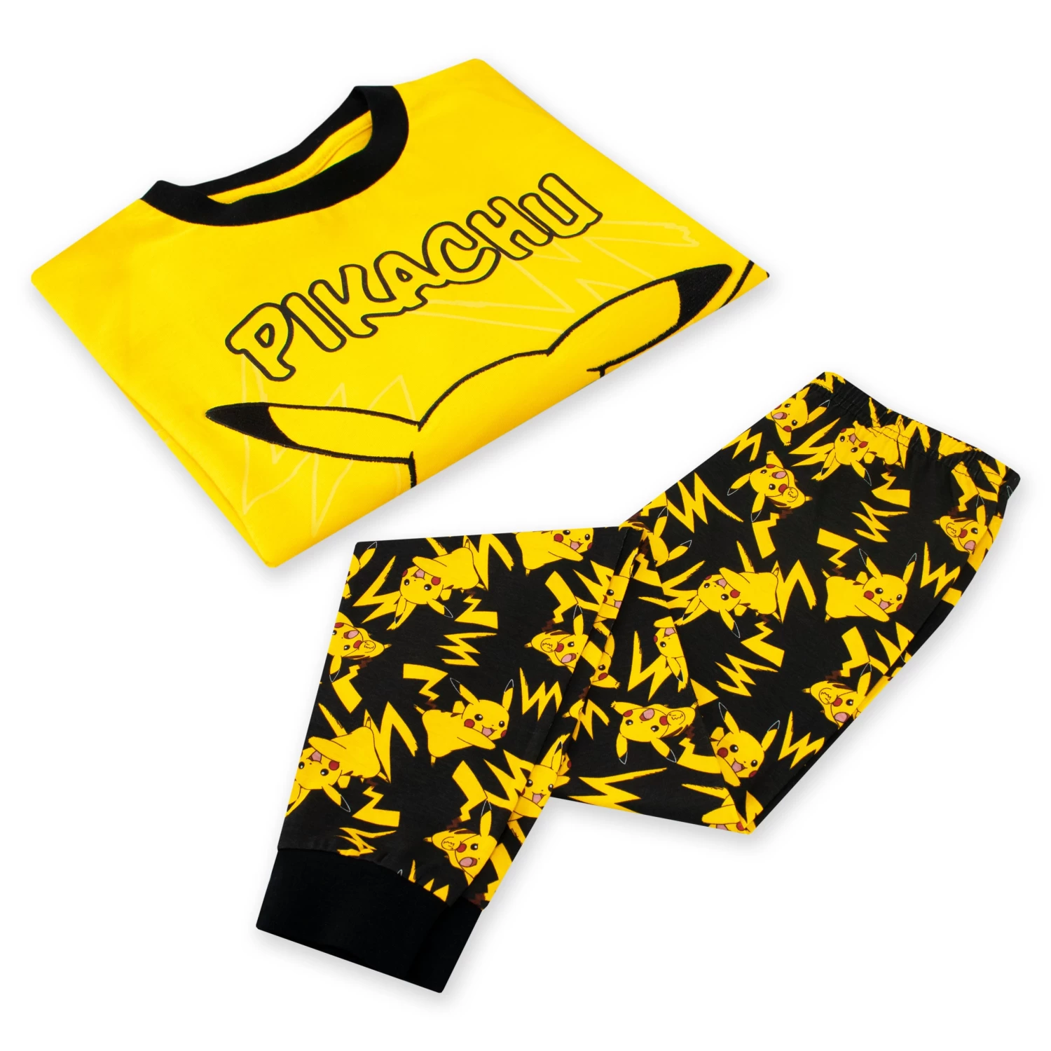 Are you ready to catch some Z’s in style? Look no further than our electrifying Pikachu Pyjama Set! Featuring a bright yellow long sleeve top with Pikachu front and center, surrounded by lightning bolts and the word “Pikachu” in bold black bubble font. This top will have you feeling like the ultimate Pokémon trainer, ready to take on any dreamland challenge. But wait, there’s more! The black all-over print of Pikachu and lightning bolts on the pants is the perfect complement to the top, giving you a head-to-toe look that screams “I choose you, Pikachu!” Plus, with a cuffed hem for maximum comfort, you’ll never want to take these pajamas off