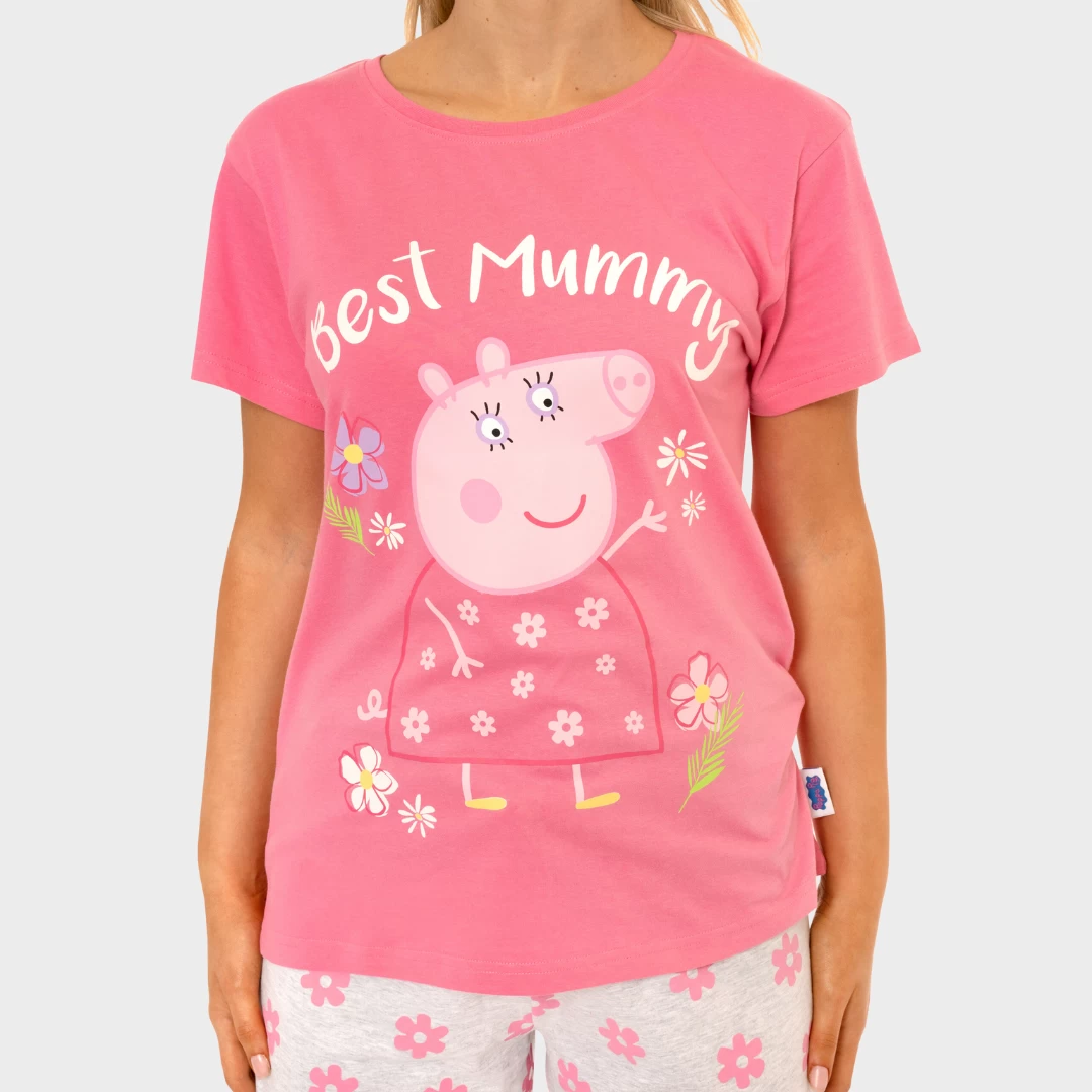 Mums, get ready for comfort and relaxation in this bright and fun Mummy Pig Pyjama set! A pink short sleeve PJ top features a print of Mummy Pig surrounded by flowers with the text ‘Best Mummy’ in white and a cute Peppa Pig logo hem-tag. Complete with grey pyjama bottoms which have an all over print of vibrant pink flowers. These oink-tastic jammies are perfect for any Mummy to relax in after a long day!