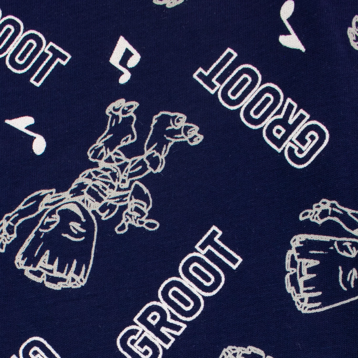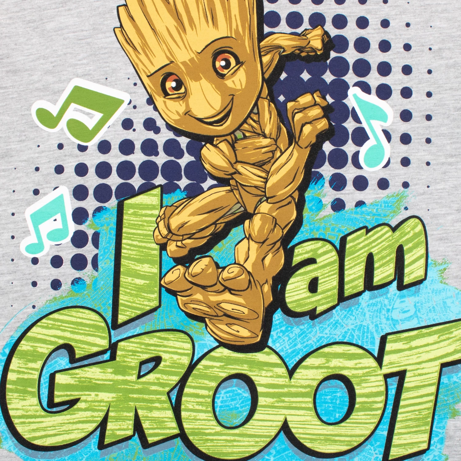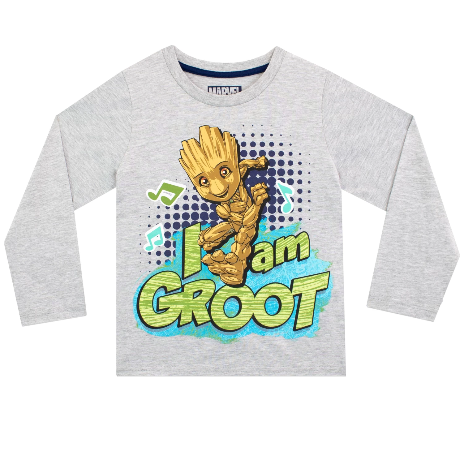 I am Groot. Get ready to be running alongside Groot and the Guardians in this Marvelous Pyjama set. This PJ set has a grey long sleeve top featuring Groot in the center surround by the graffiti style wording ‘I am Groot’ in green and musical notes. Complete with contrasting blue cuffed bottoms with an all over pattern of Groot dancing, music notes and the wording ‘Groot’ in white. Your little Starlord will be all set to board The Milano for any Marvlous adventures in theses jammies.