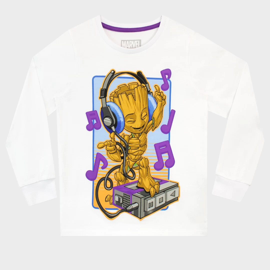 I am Groot! Get ready to for your little space star to be having a dance off in these amazing Groot jammies. This pyjama set includes a long sleeve white top featuring Groot with a pair of headphones on listening to a portable cassette player surrounded by purple music notes. Complete with elasticated grey cuffed bottoms with an all over print of purple, blue and yellow music notes. Out of this world Marvellous pjs for any Guardians Of The Galaxy fans!