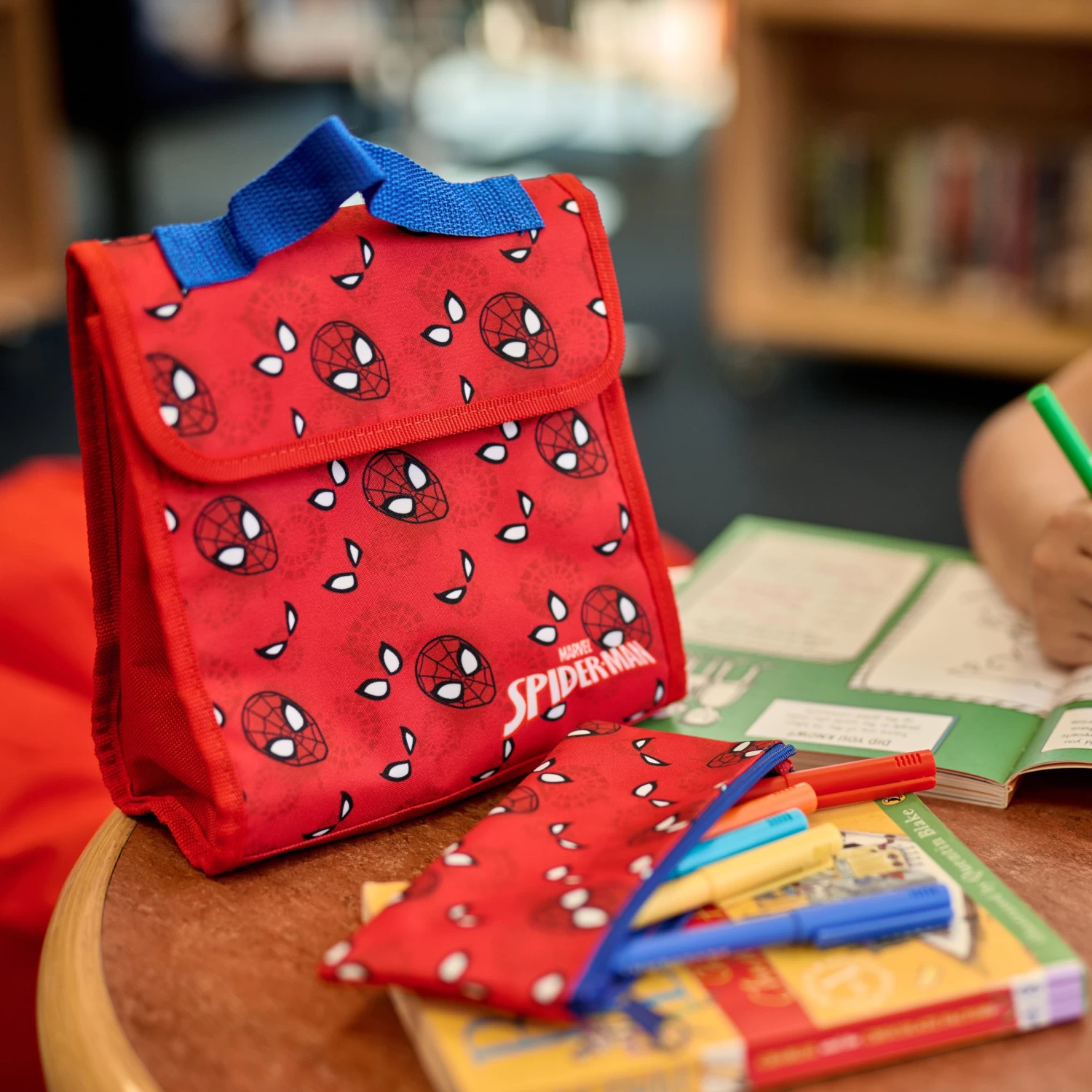 - Supercharge your school days with our colourful, Spiderman-themed gear. A lunch bag with a vibrant blue handle, a pencil case echoing the repeating Spiderman pattern, and a thirst-quenching water bottle makes this set the perfect companion for your academic adventures!