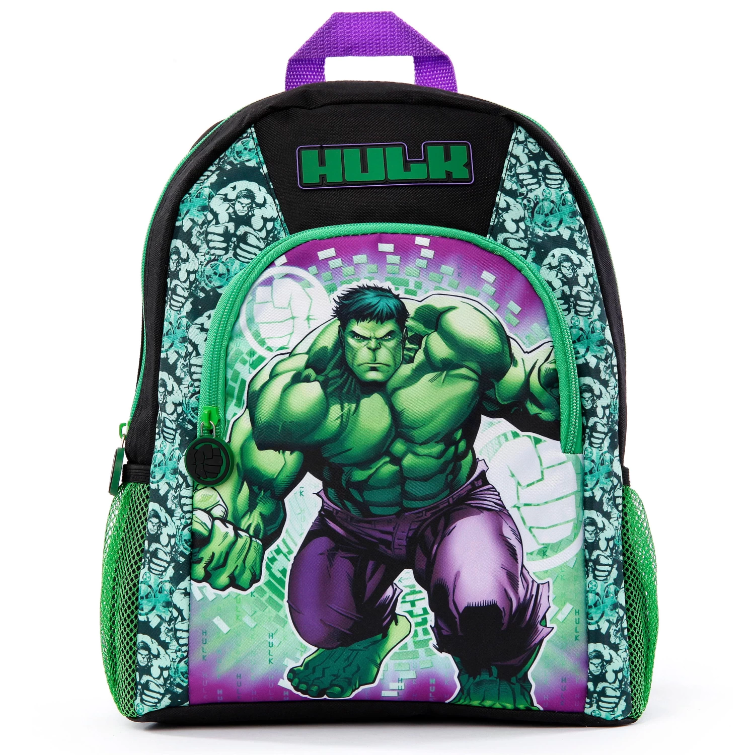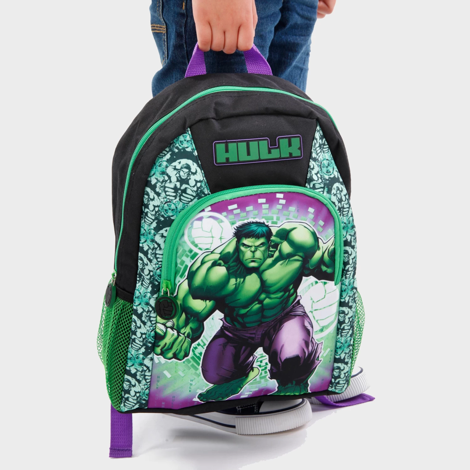 Your superhero could never be angry with this awesome Hulk backpack! This rucksack features iconic Hulk colours black, purple, and green and featuring a cartoon Hulk on the front pocket surrounded by a green Incredible Hulk motif. Complete with rubberised ‘Hulk’ wording on the front and matching Hulk logo zip pulls, this bag will have your Bruce Banner totally ‘smashing it’!
