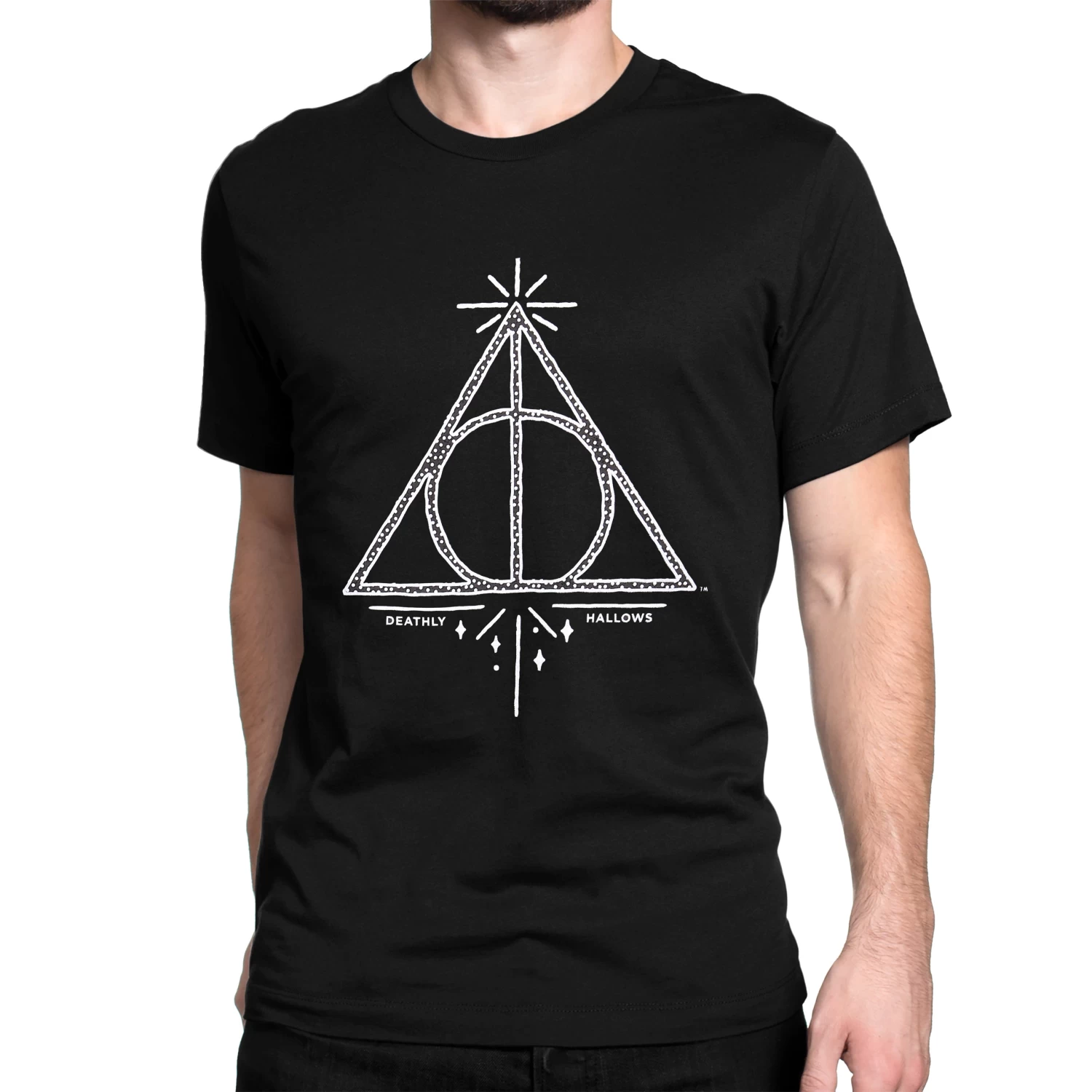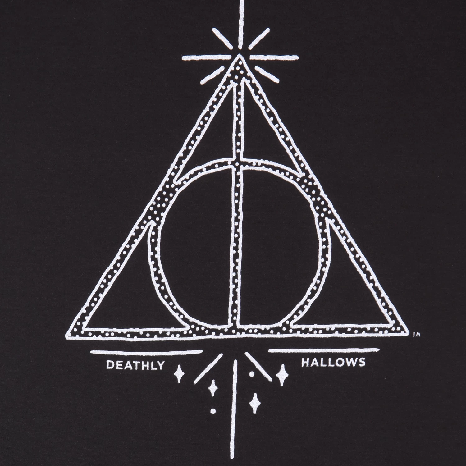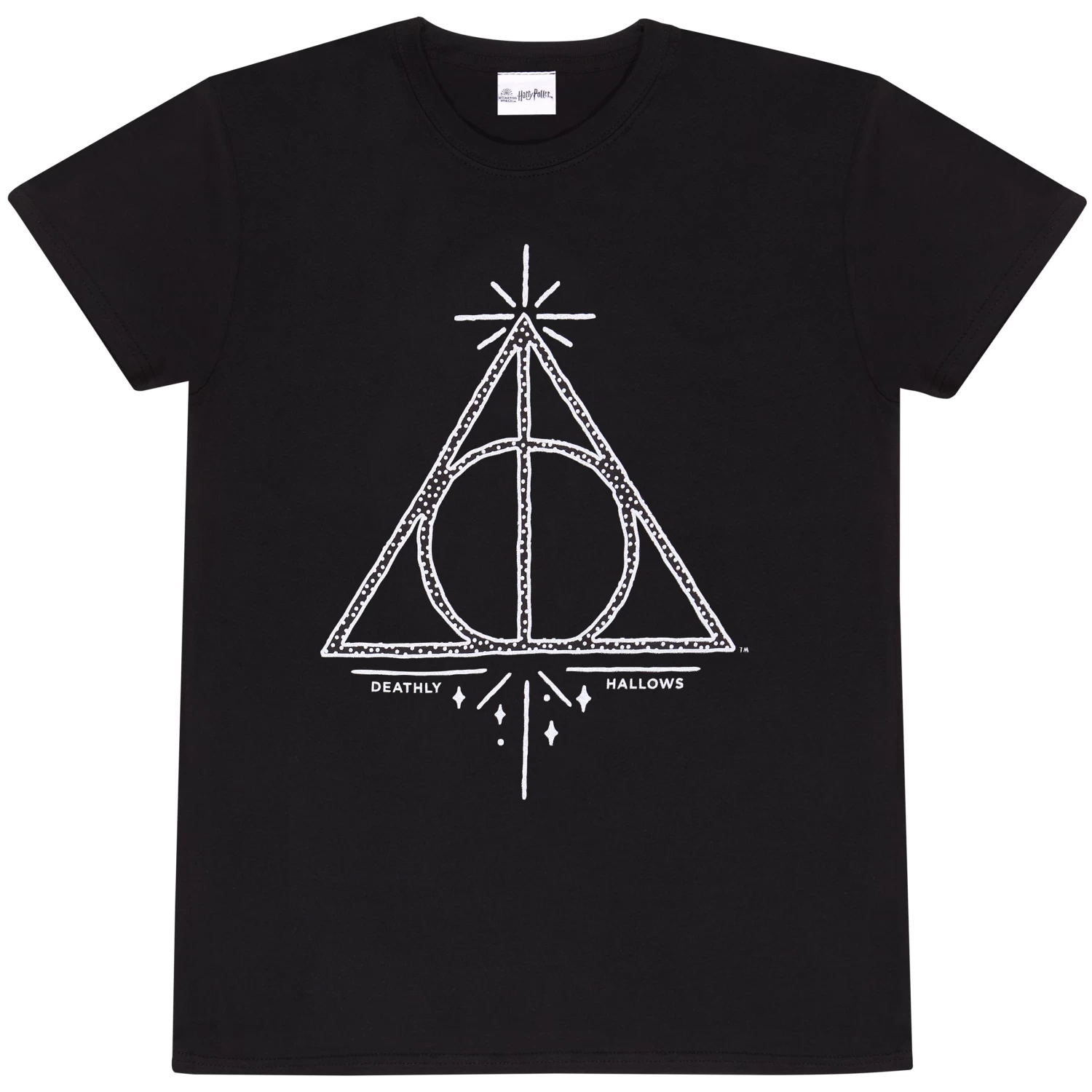 - Magical Harry Potter Menswear: Get your wizard on with this black, short-sleeved Harry Potter tee featuring the white iconic Deathly Hallows symbol.