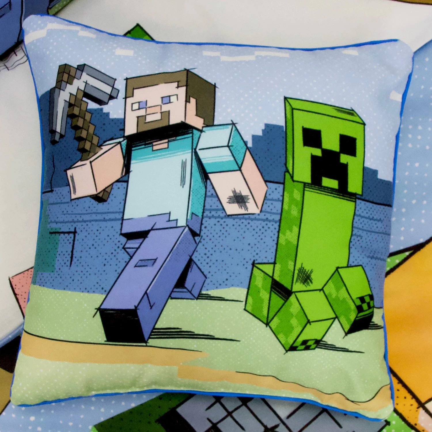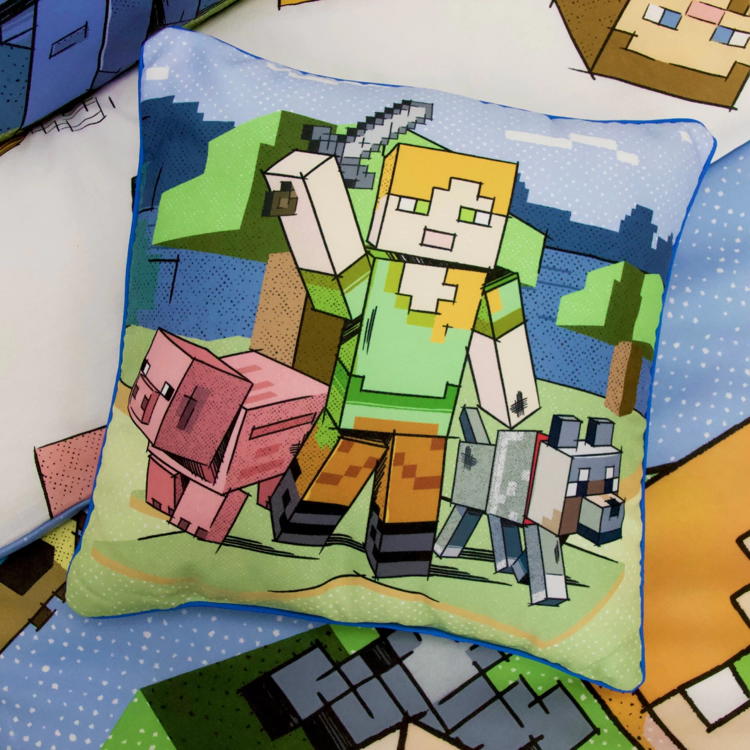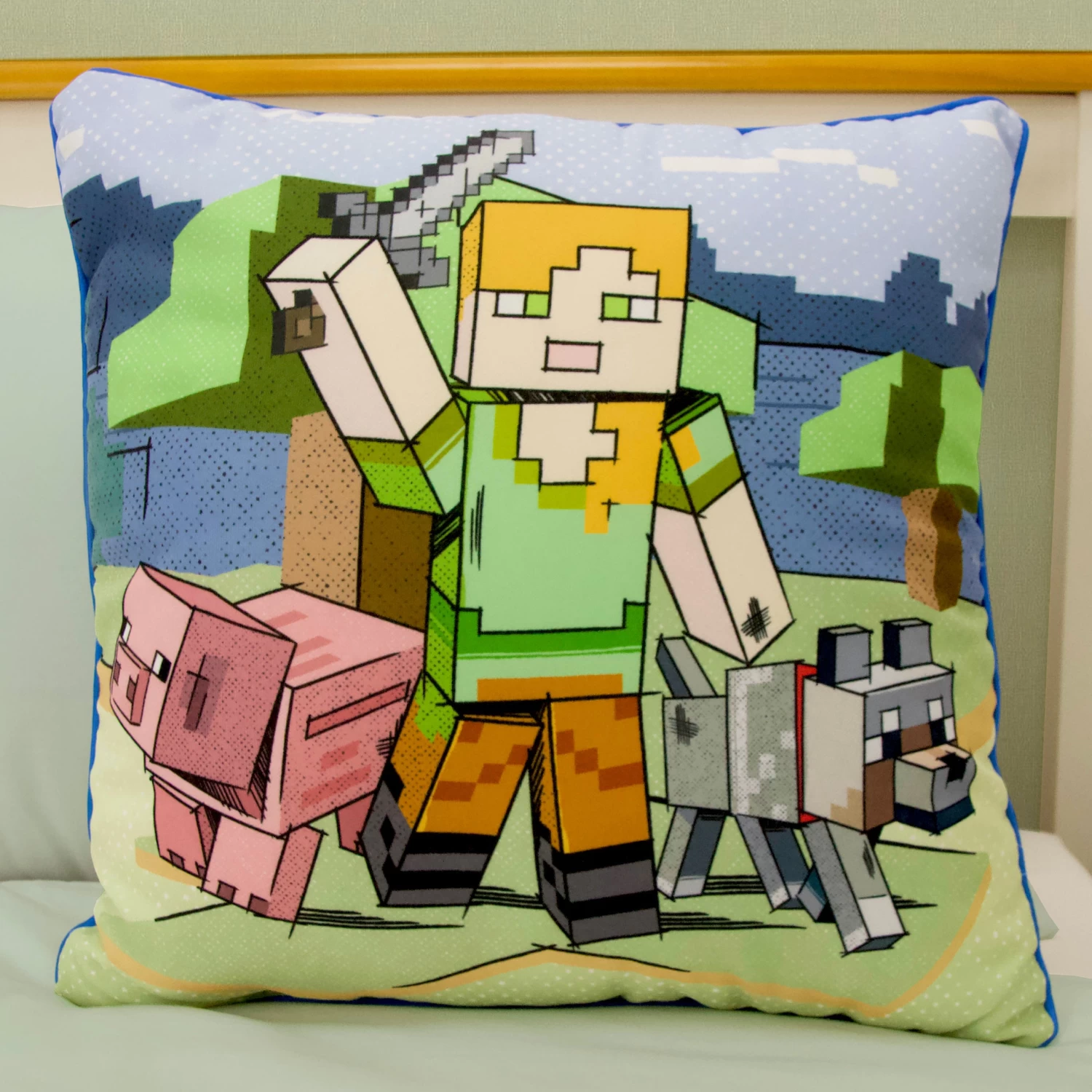 Get your little adventurers bedroom for an exciting gaming adventure with this amazing Minecraft reversible cushion! One side of this colourful features Steve and a Creeper against a pixelated background. The reverse side features Alex surrounded by a wolf and a pig. This adorable homewear will make any bed the perfect paradise to be mining some gold or defeating the Ender dragon on!