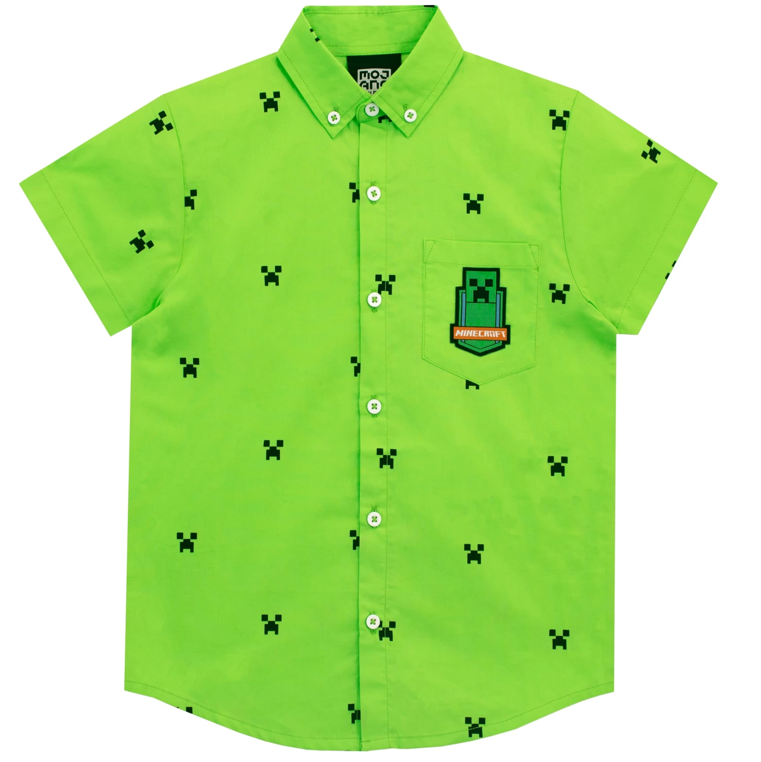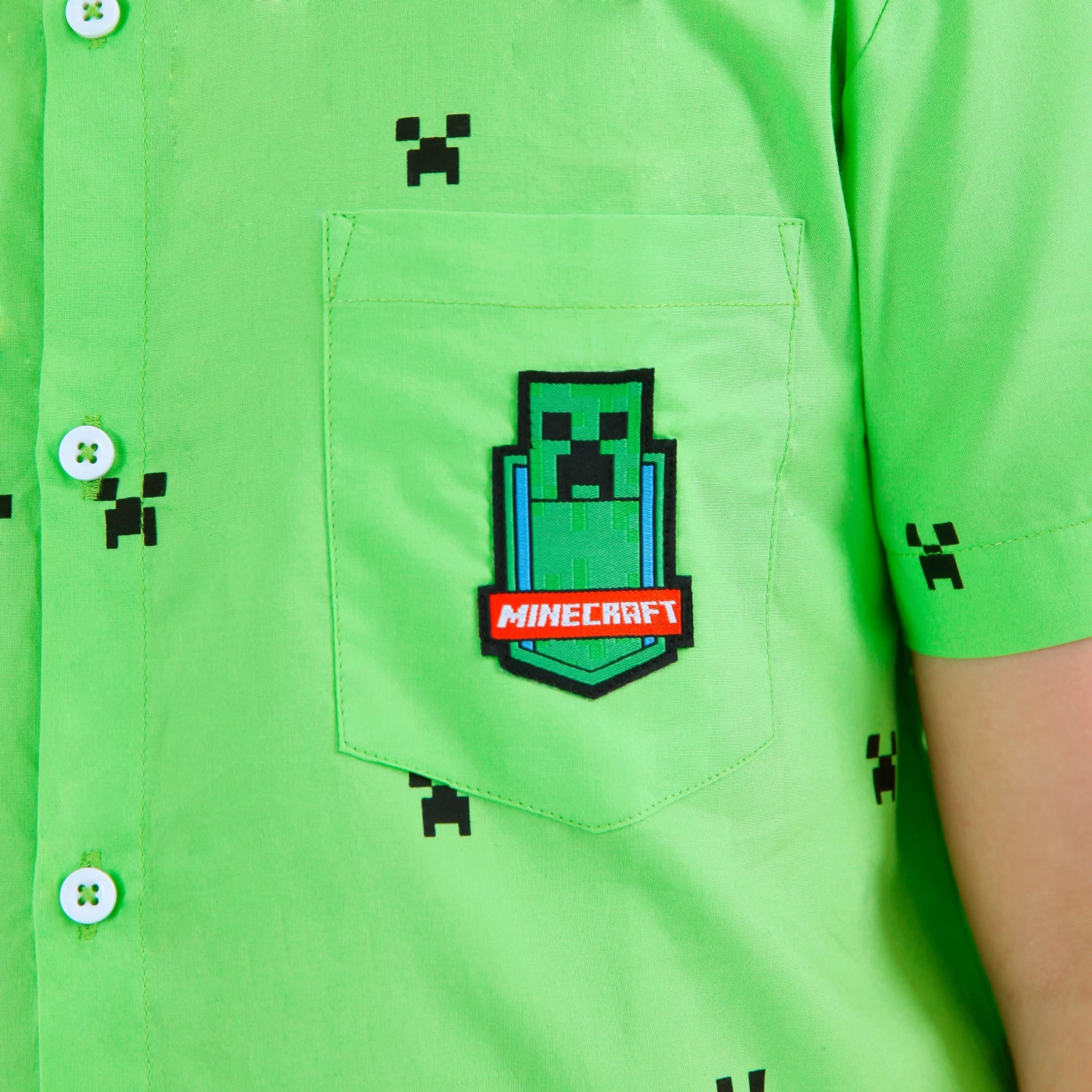 Add something exceptional to your little builder’s wardrobe with this button down Minecraft shirt! A vibrant green tee every Minecraft fan will want as part of their arsenal, it features a striking motif of the Creeper’s face as well as a super handy chest pocket with the Minecraft logo on it and a Creeper’s face. This Minecraft T-Shirt gives a super stylish look when paired with jeans and will guarantee they are ready to build a world of adventures!