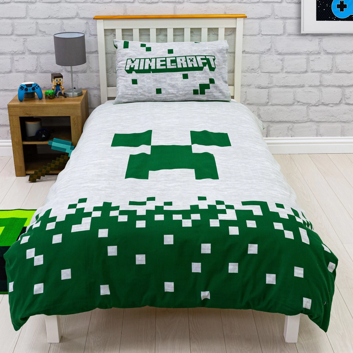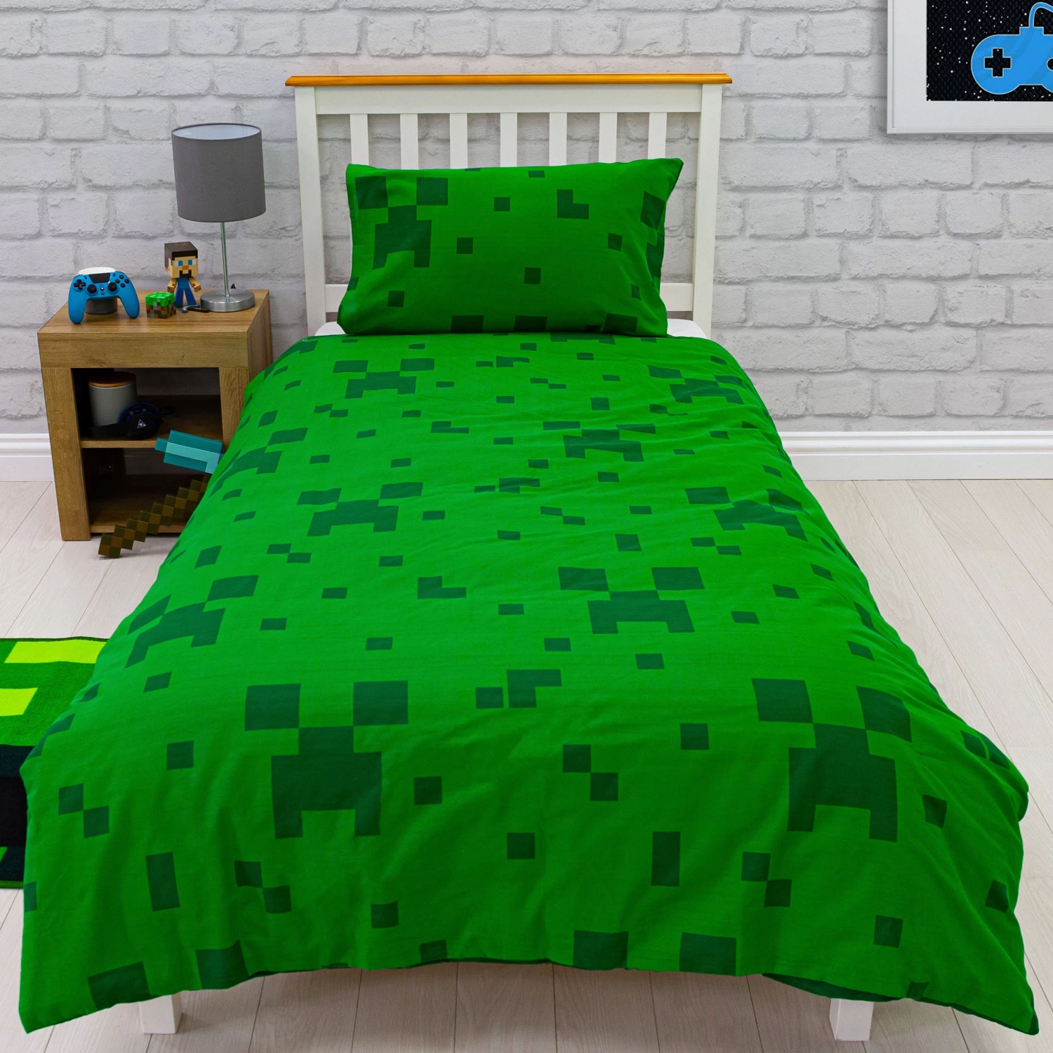 Get your little gamer ready for bed in these super cool Minecraft Pixel single duvet set! This set is reversible, with one size all green with an all over print of a creeper in a darker green. Then flip over to a white back drop with a big green creeper in the center of the duvet. With matching pillow too, your little Minecraft lover will be all cozy and ready for a game night!