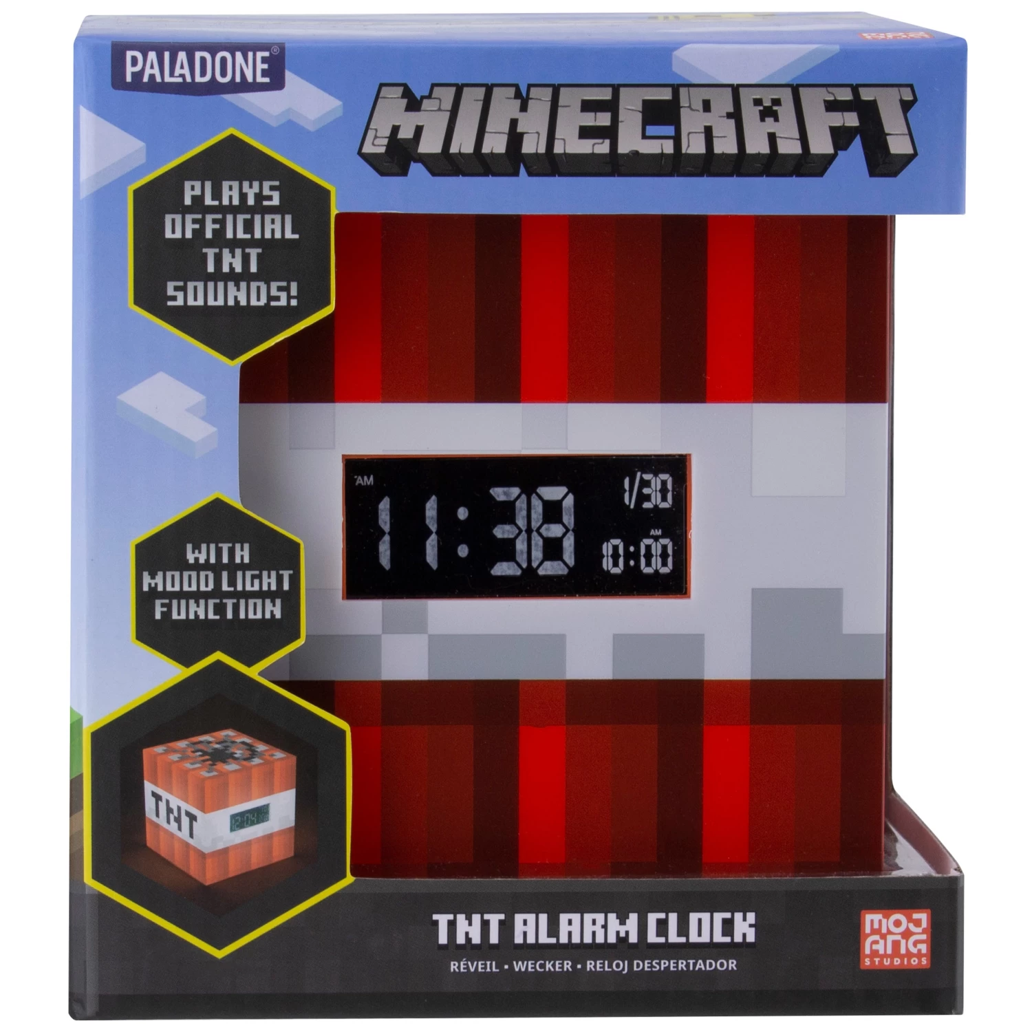 The alarm will wake you with the TNT sounds as featured in this awesome game. The large reverse LED white on black display is also easy to read even with those blurry early morning eyes.