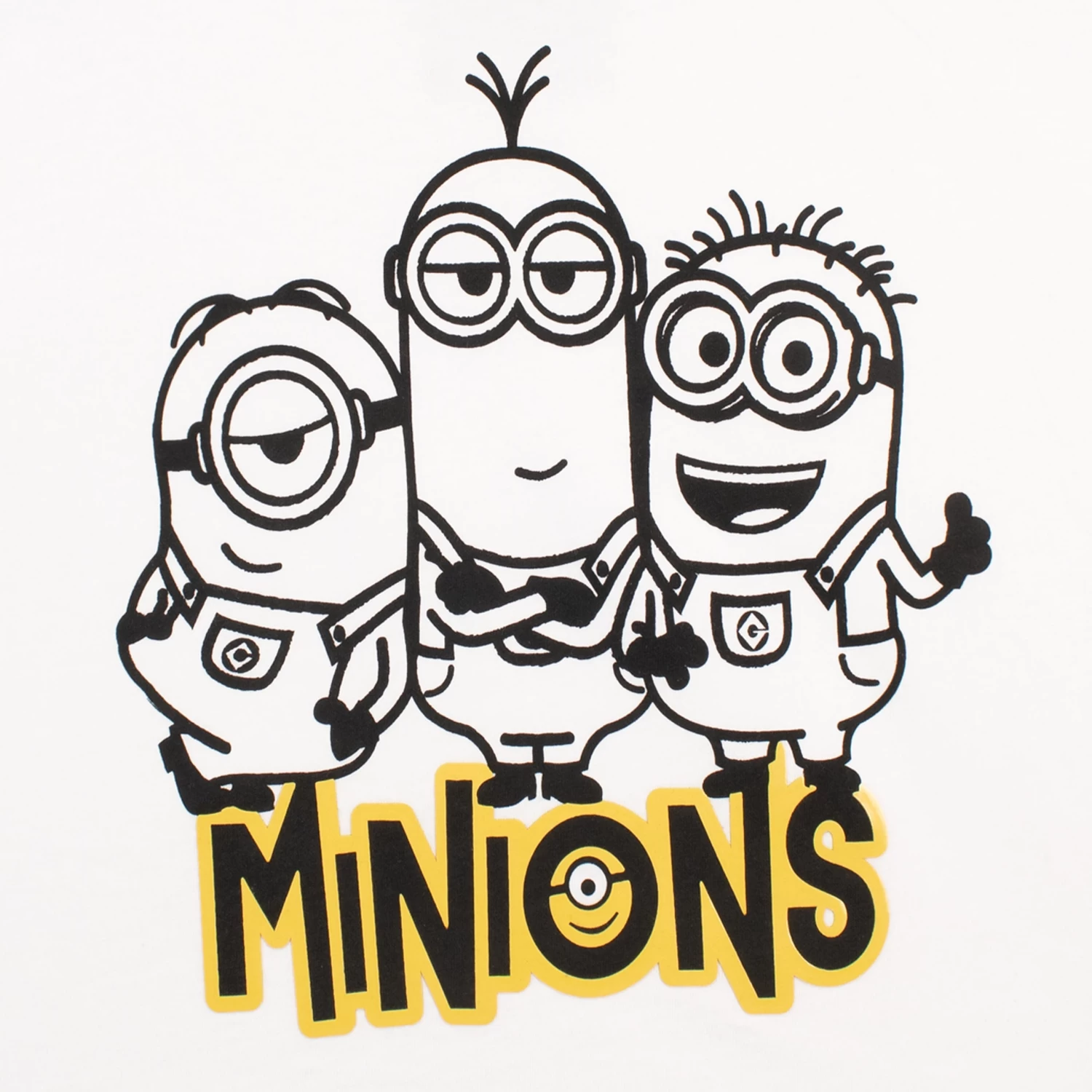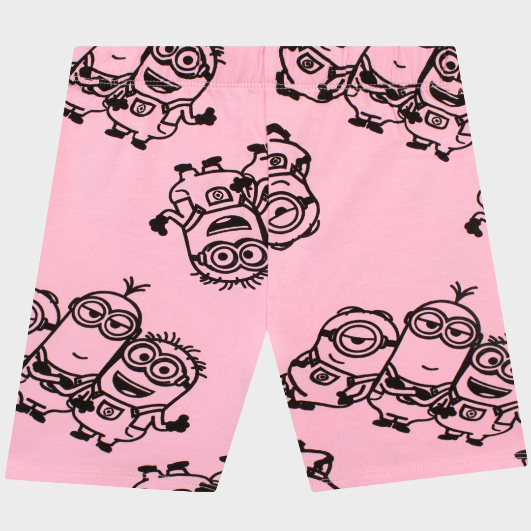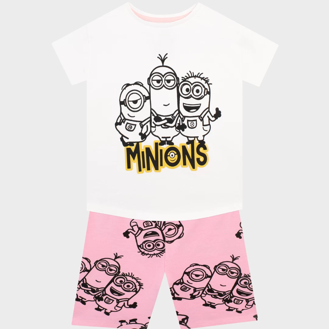 Bello! Kit out your little mischief-maker with the perfect two piece outfit for their next silly prank with this fun Minions top and shorts set! The short sleeve white tee showcases an outline of Kevin, Stuart and Bob with ‘Minions’ printed below in a glossy yellow font. The matching elasticated shorts are pink with an all-over motif of the same three minions. The best daywear for your cheeky minion to plot against supervillains and get up to mischief!