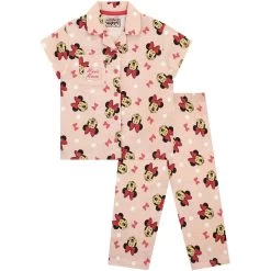 Girls Minnie Mouse Button-Up Pyjamas. Yoo-hoo! It’s time to join Disney’s cutest mascot for dreamland adventures with these pink Minnie Mouse PJs! This set includes a short sleeve button-up pyjama top featuring an all-over print of Minnie, bows and white dots, with a pocket on the chest that has a ‘Minnie Mouse’ patch. Paired with matching pj bottoms that have an elastic waistband to keep your little mouse comfy all night long! With these stylish jammies, your little Disney fan is sure to have dreams as sweet as Minnie Mouse!