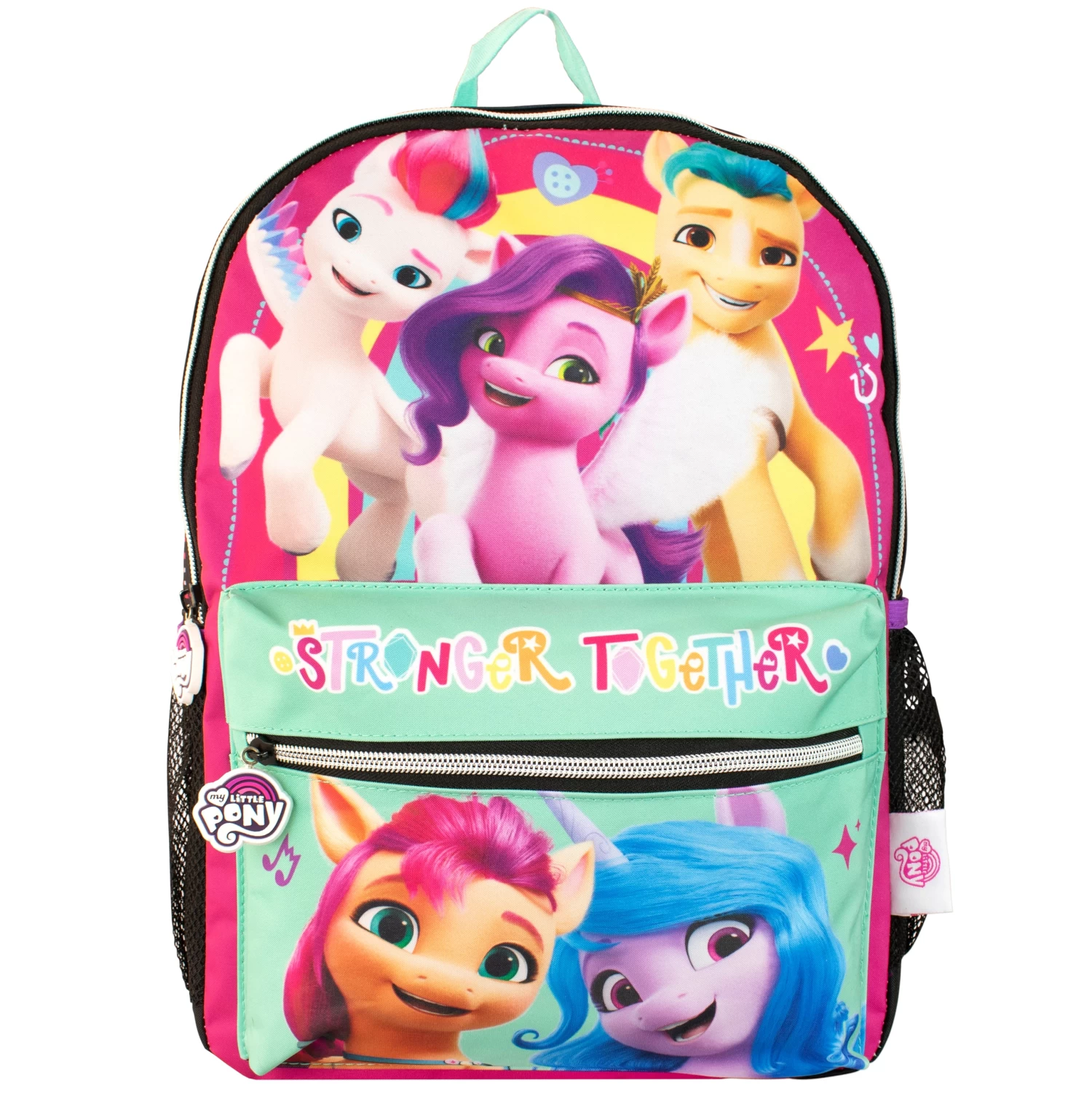 Be a part of bringing the magic back to Equestria with this amazing My Little Pony rucksack. This bright colourful backpack features Sunny Starscout, Hitch Trailblazer, Izzy Moonbow, Zipp Storm and Pipp Petals which is perfect for any My Little Pony fans! With a zipped main compartment, front pocket, side mesh pockets and adjustable shoulder straps perfect for keeping all your magical items safe! A rubberised My Little Pony logo zip pull completes the magical vibe of this backpack. This bag is ideal for school, day trips and any magical adventures!