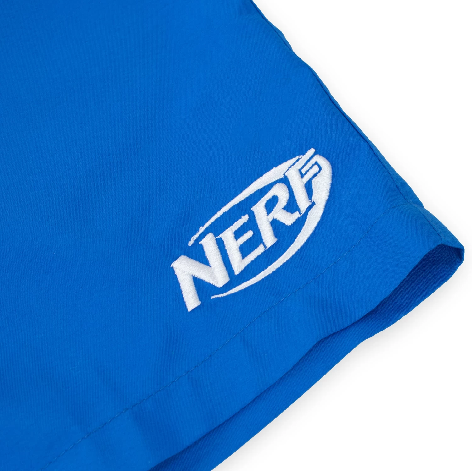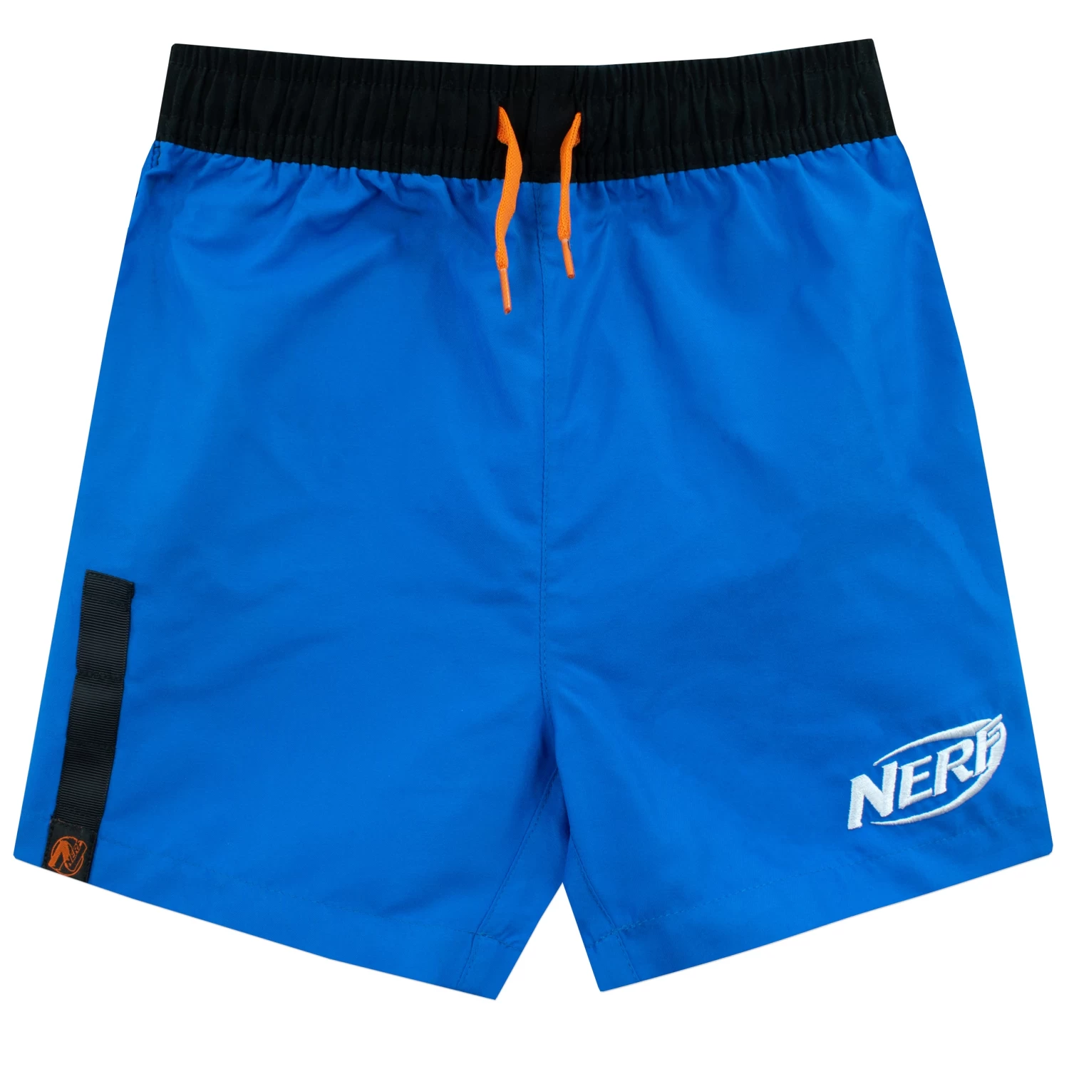 Get your Nerf fan ready to battle in these blue Nerf swim shorts. Showcasing a water reactive print of the multiple navy Nerf logos. Also featuring the Nerf logo embroidered in contrasting white and a nerf dart holder to keep their spare ammo on the right leg, these swimming trunks are perfect for any Nerf fan.