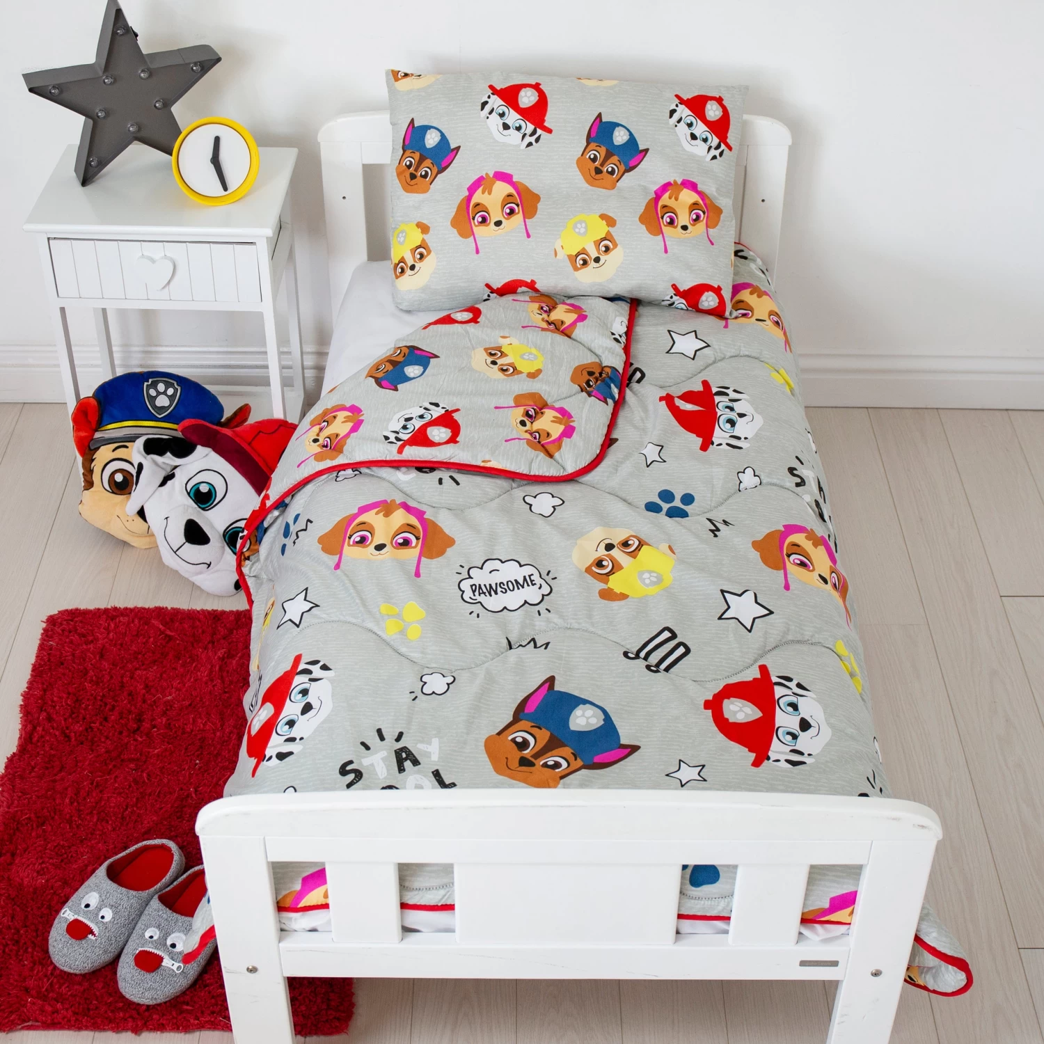 Get your pups ready for a night of fun in Adventure Bay with this Paw Patrol coverless duvet and pillowcase set for a single bed. Featuring an all over motif of Skye, Rubble, Marshall and Chase on a grey background. Complete with a matching pillow case this bedding set goes great with our wide range of Paw Patrol Pyjama sets!