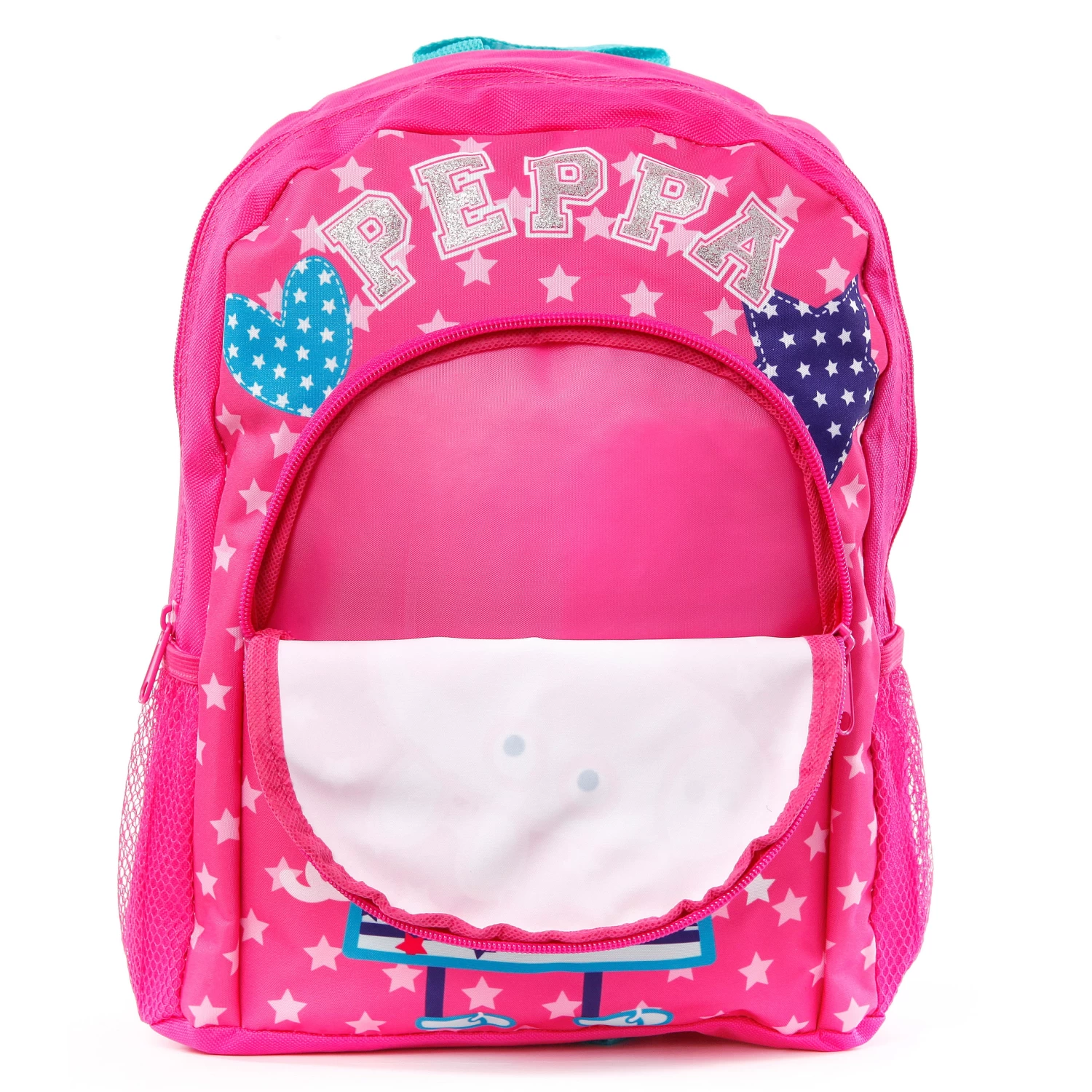Skip to school and days out with a smile when kitted with this adorable Peppa Pig backpack! This pretty pink rucksack comes with a super sweet design of everyone’s favourite piggy Peppa Pig on the front pocket, which is surrounded by hearts and stars and her name above in sparkly glitter! Prepped with a large zipped main compartment, a handy front pocket and two mesh side pockets this versatile bag is perfect for their adventures in muddy puddles and more!