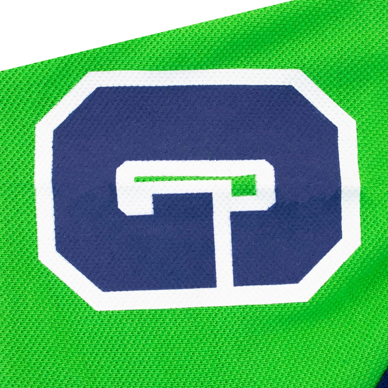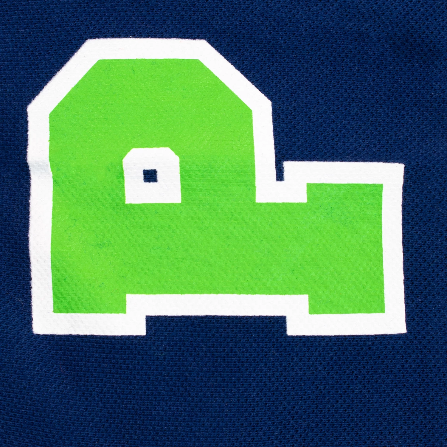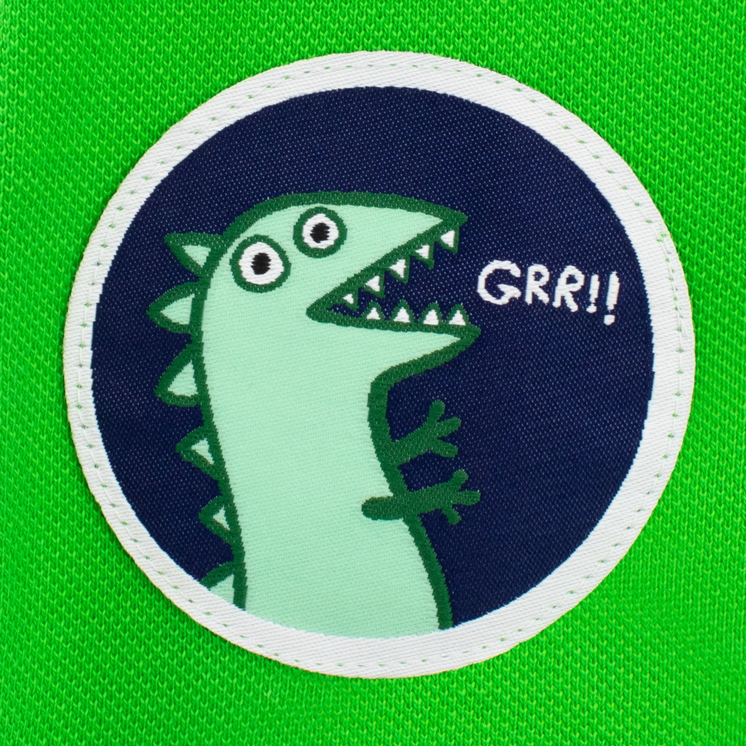 Dine-saw! Grrrrrr! Your little piglet will love this fun George Pig polo shirt. Textured with cool patches and prints of George and Mr. Dinosaur. The right sleeve features a print of the letter ‘G’, and the letter ‘P’ is featured on the left sleeve. A vibrant print of George in a starburst feature on the left side of the chest and a patch or Mr. Dinosaur can be found on the bottom right. This shirt is perfect for any fan of the hit TV show