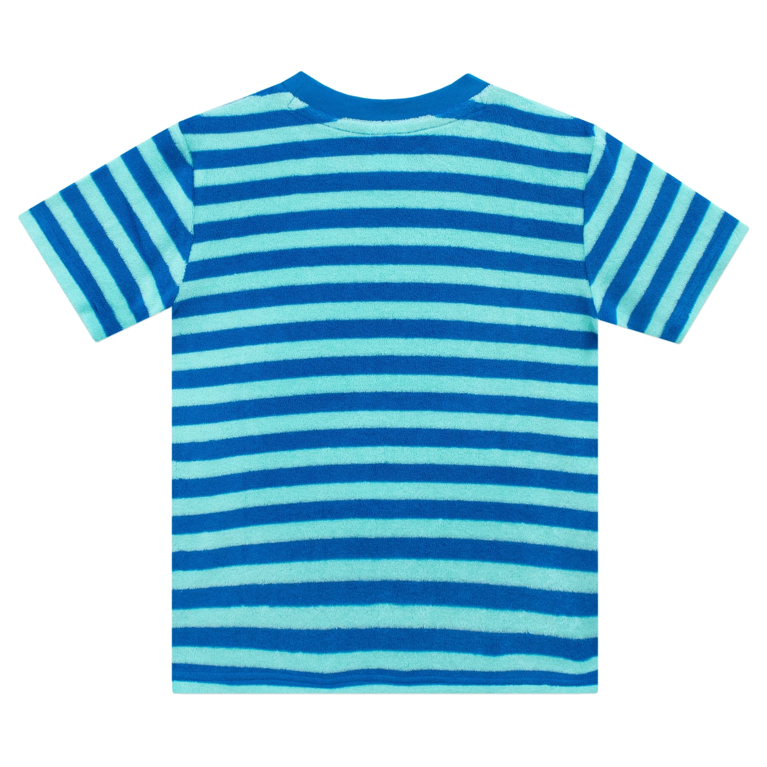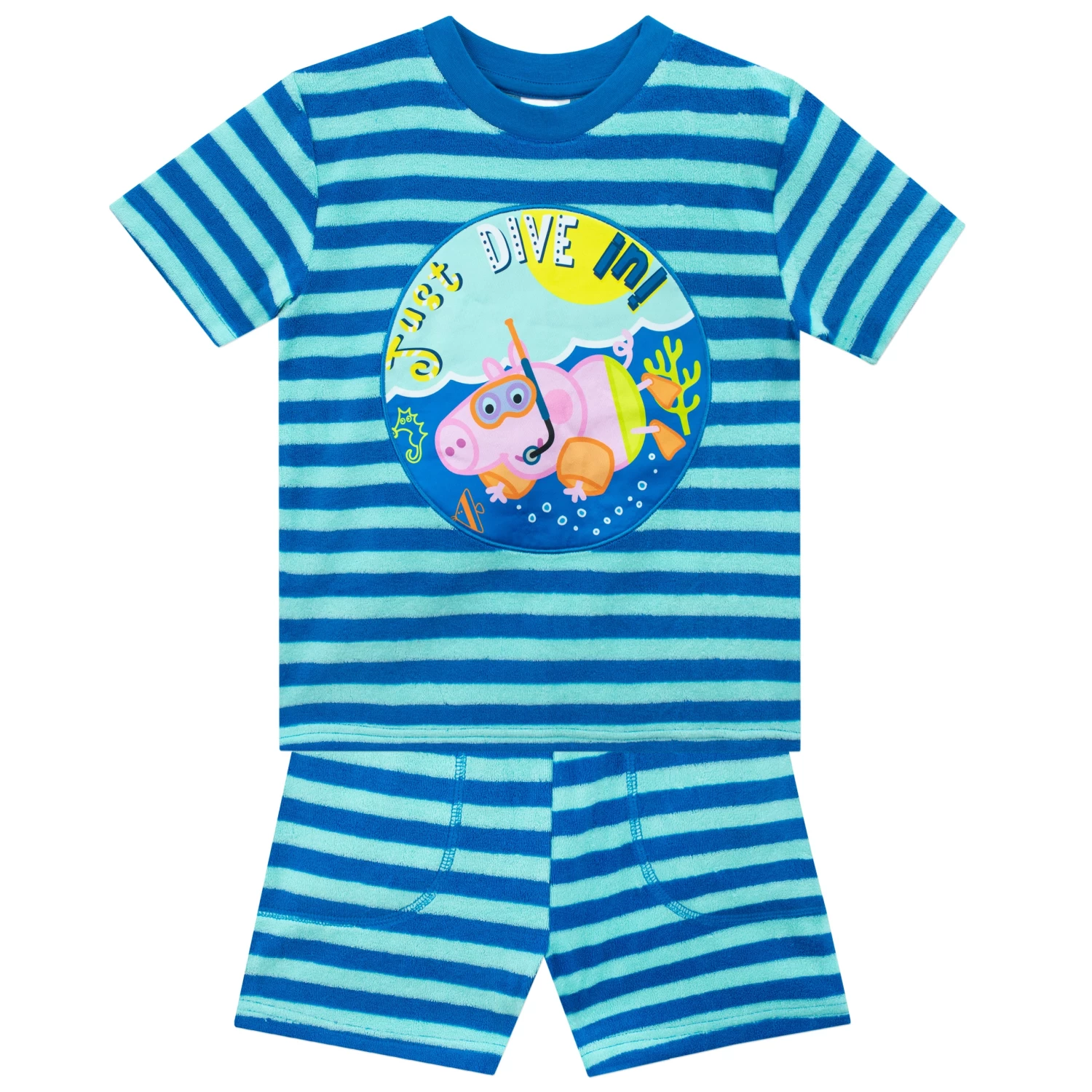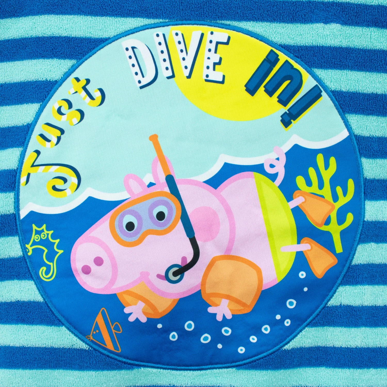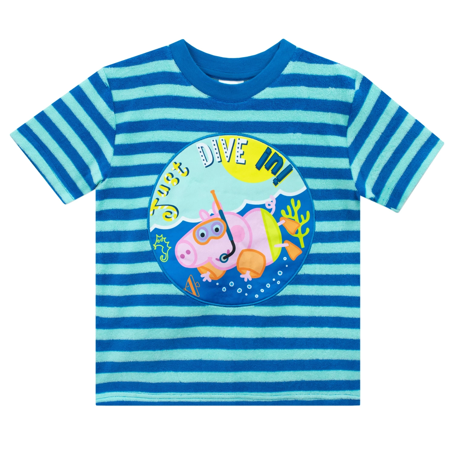 Prepare your little piglet for a splashing day out at the pool or beach with this oink-tastic George Pig towelling set! Made of soft towel material, this outfit set includes a blue stripy t-shirt that features a cute print of George Pig snorkeling in the sea along with the slogan ‘Just Dive In’, and matching towel shorts that have an elasticated waistband and two handy pockets. Wear with their favourite Peppa Pig swimwear for a great day of swimming activities with George Pig and friends!