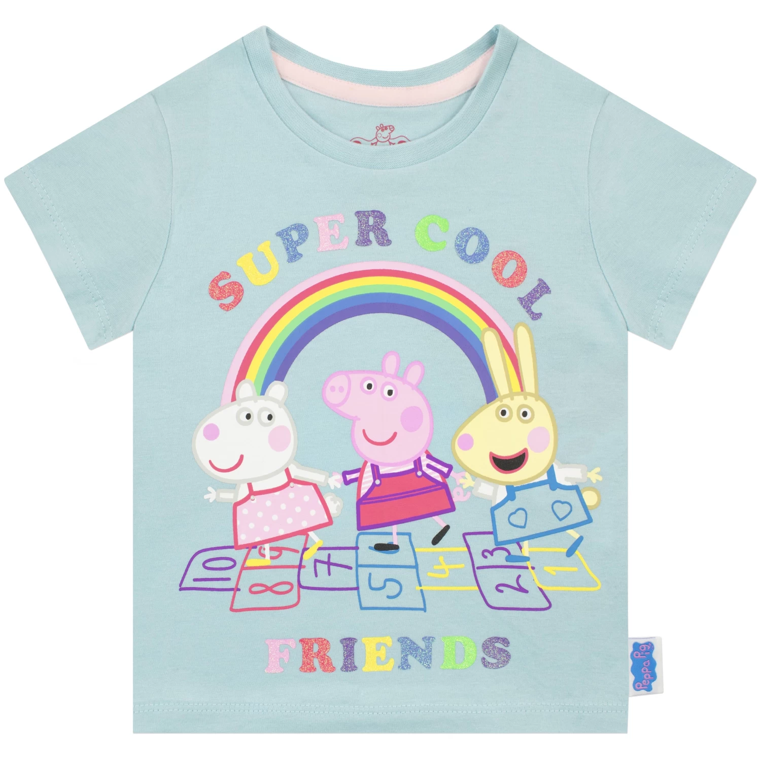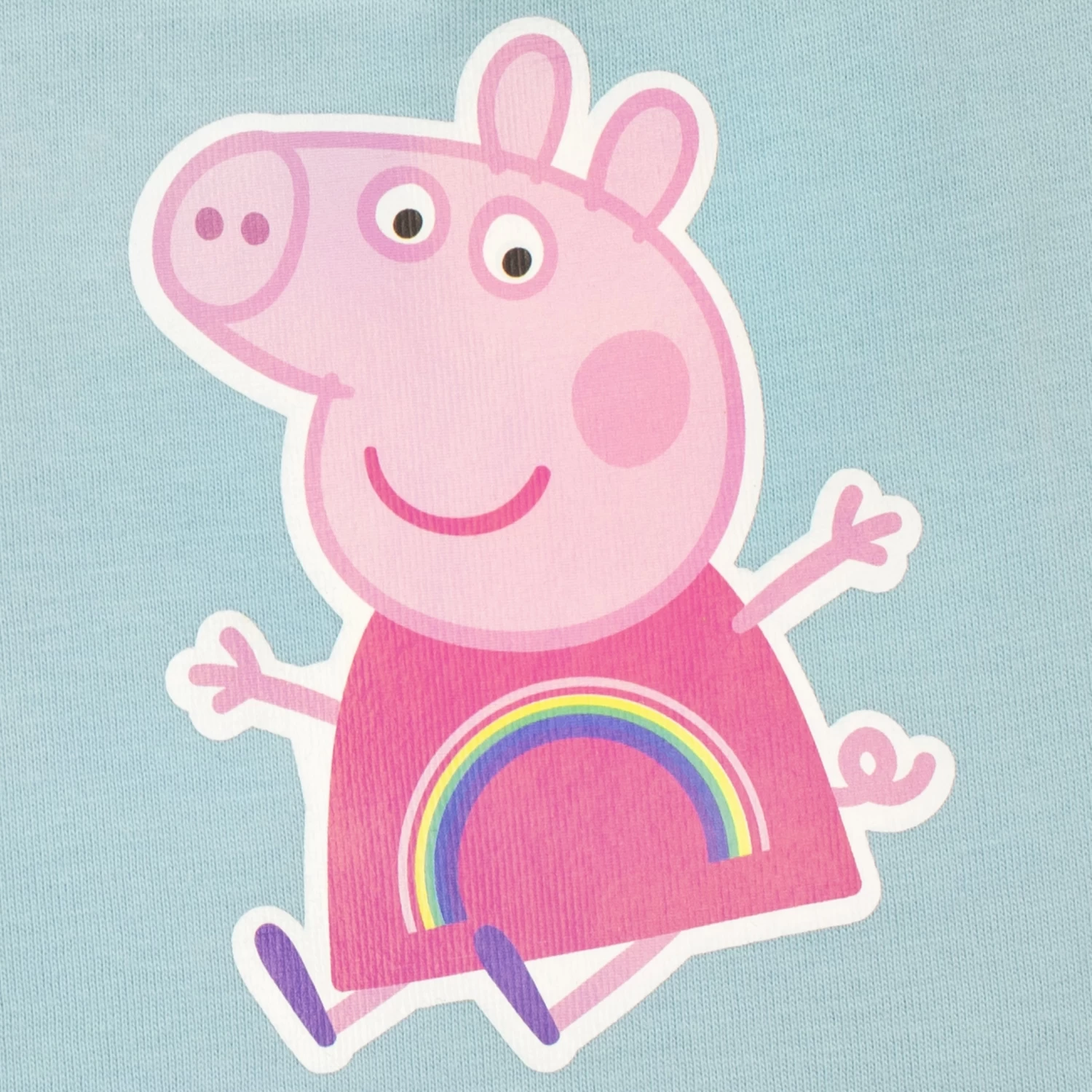 Celebrate friendship with this twin pack of super cute Peppa Pig short pyjamas! The first in the set includes a light blue short sleeve top showcasing a colourful print of Peppa Pig, Suzy Sheep and Rebecca Rabbit playing hopscotch against a rainbow, framed by the slogan ‘Super Cool Friends’ in multicoloured glitter print. Paired with pink pyjama shorts with an elasticated waistband and an all-over polka dot pattern. The second in the set includes a pink tee with the same polkadot pattern, and features a rainbow pocket on the chest with ‘Peppa Pig’ written in pink glittery font, with a print of Peppa behind the pocket. The matching shorts are pale blue with an elastic waist and feature a print of Peppa on the left leg. Perfect for warmer nights, these sparkly jammies will keep your Peppa fan feeling cool and stylish all summer long!