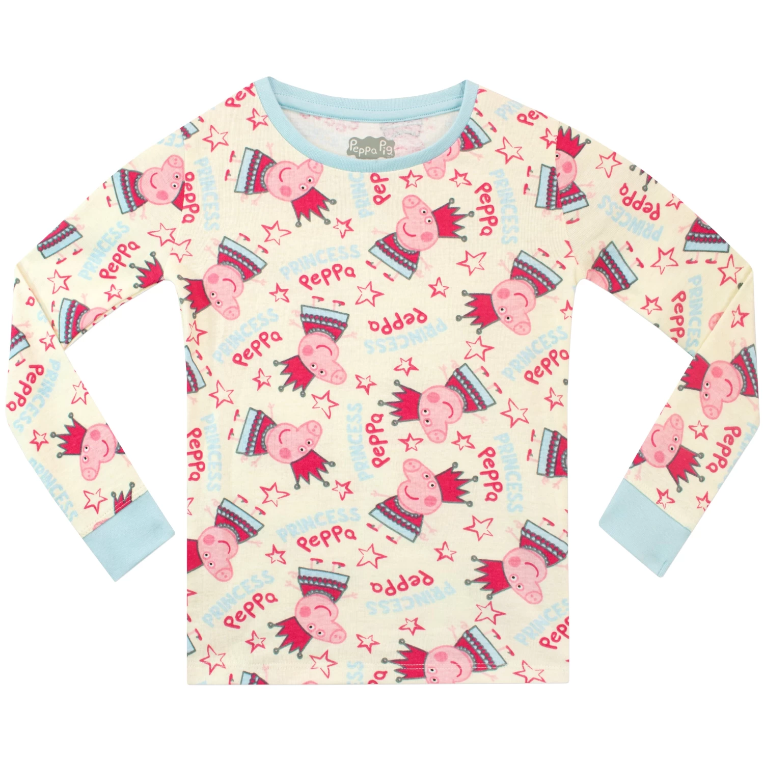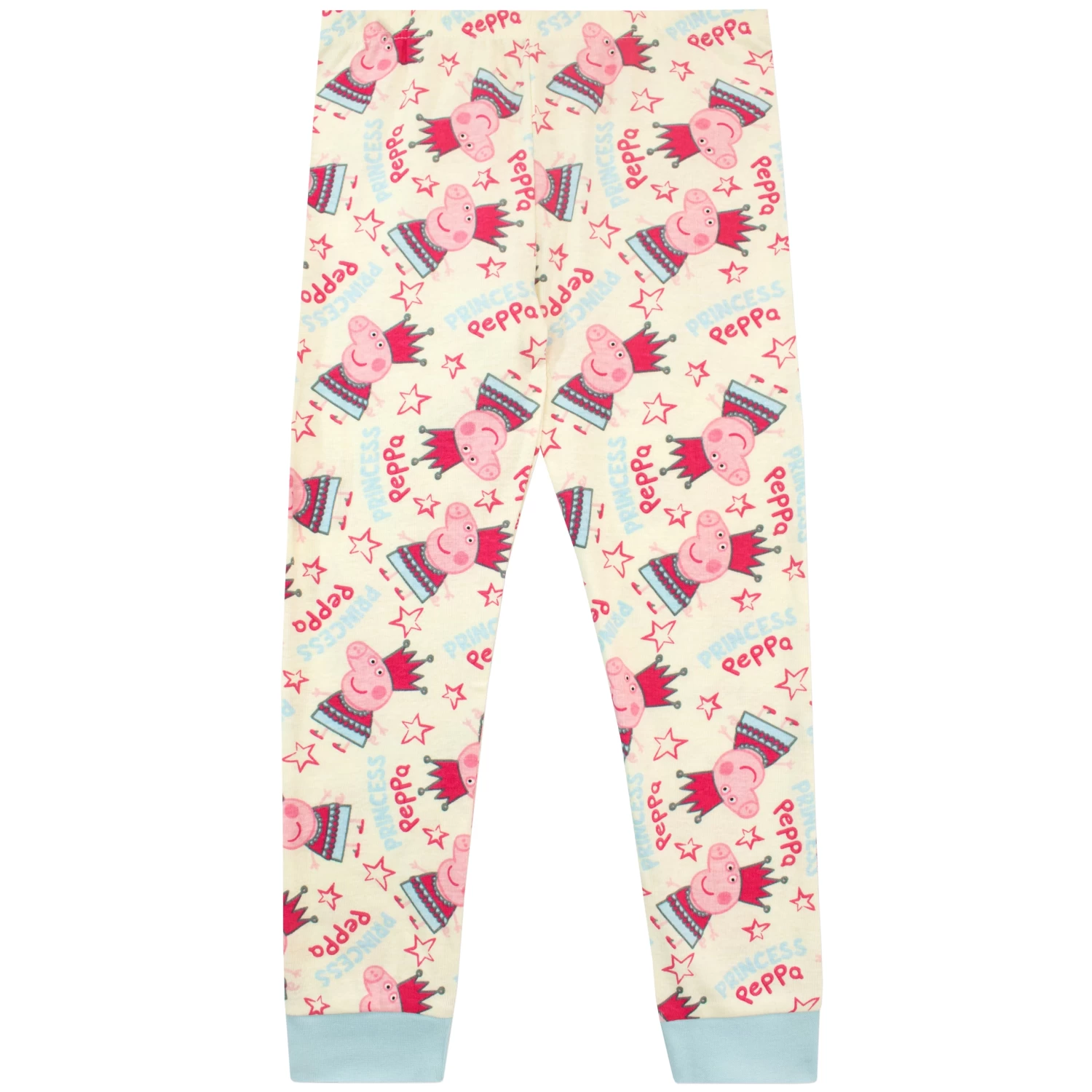 Make way for Princess Peppa! Send your little piglet off to a fairytale kingdom for a night of magical dreams in these royal Peppa Pig jammies! The cream coloured long-sleeve pj top and pyjama bottoms both feature an all-over print of Peppa wearing a crown, among stars and the words ‘Princess Peppa’, and have light blue cuffs on the wrists and ankles. To keep your princess cosy at night, these soft cotton pyjamas are designed in a snug fit, but for a bit of extra room we recommend ordering a size up. After a great night’s sleep in this cute PJs, they’ll be ready to rule over their kingdom for another day!