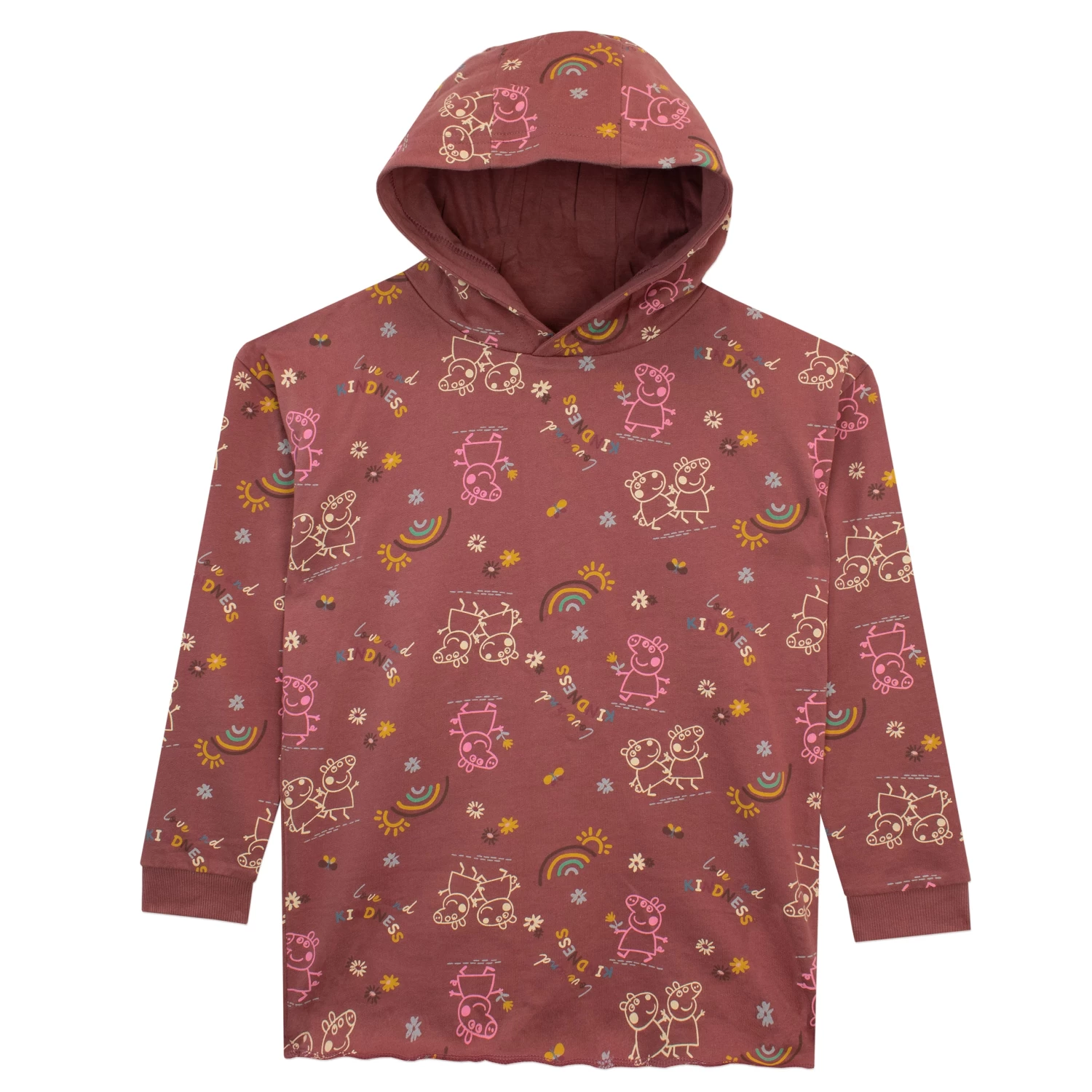 Get your little piglet ready for some fun adventures with Peppa Pig and Suzy Sheep with this cute hooded sweatshirt! This blush red hoodie features an all-over print of Peppa and Suzy among flowers and rainbows and the slogan ‘Love and Kindness’. There’s no comfier way for your Peppa fan to watch their fave cartoon than in this cute hoodie!
