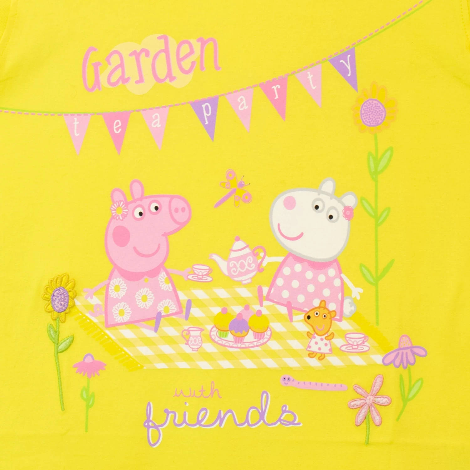 Invite Peppa Pig along for a tea party with friends in this gorgeous outfit! The cute buttercup yellow top features a print of Peppa and Suzy having a picnic tea party, and is detailed with pretty embroidered flowers and frilled sleeves. Paired with comfortable navy leggings that have a Peppa print and an elasticated waist for the perfect fit, this adorable ensemble is the perfect addition to your garden party adventures!