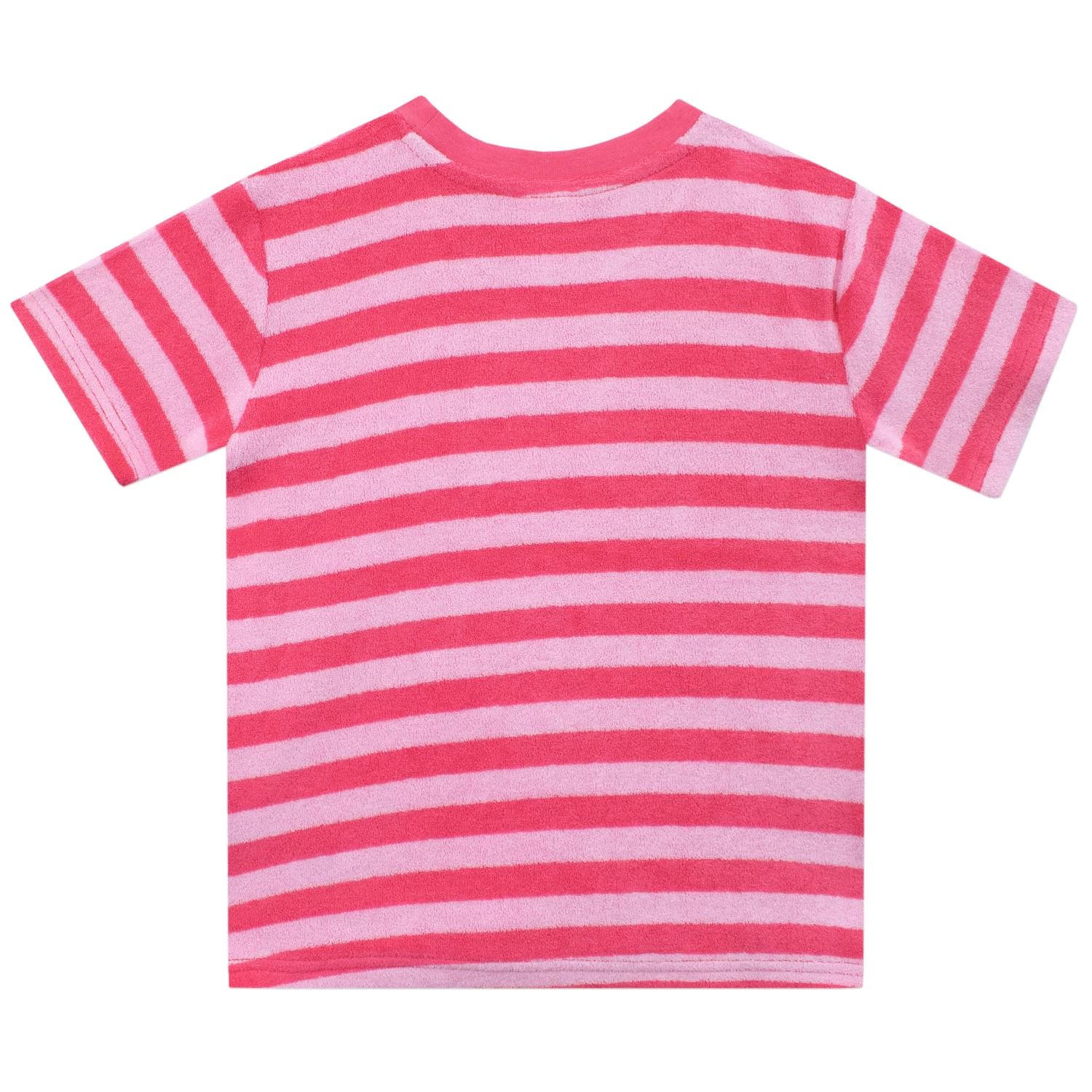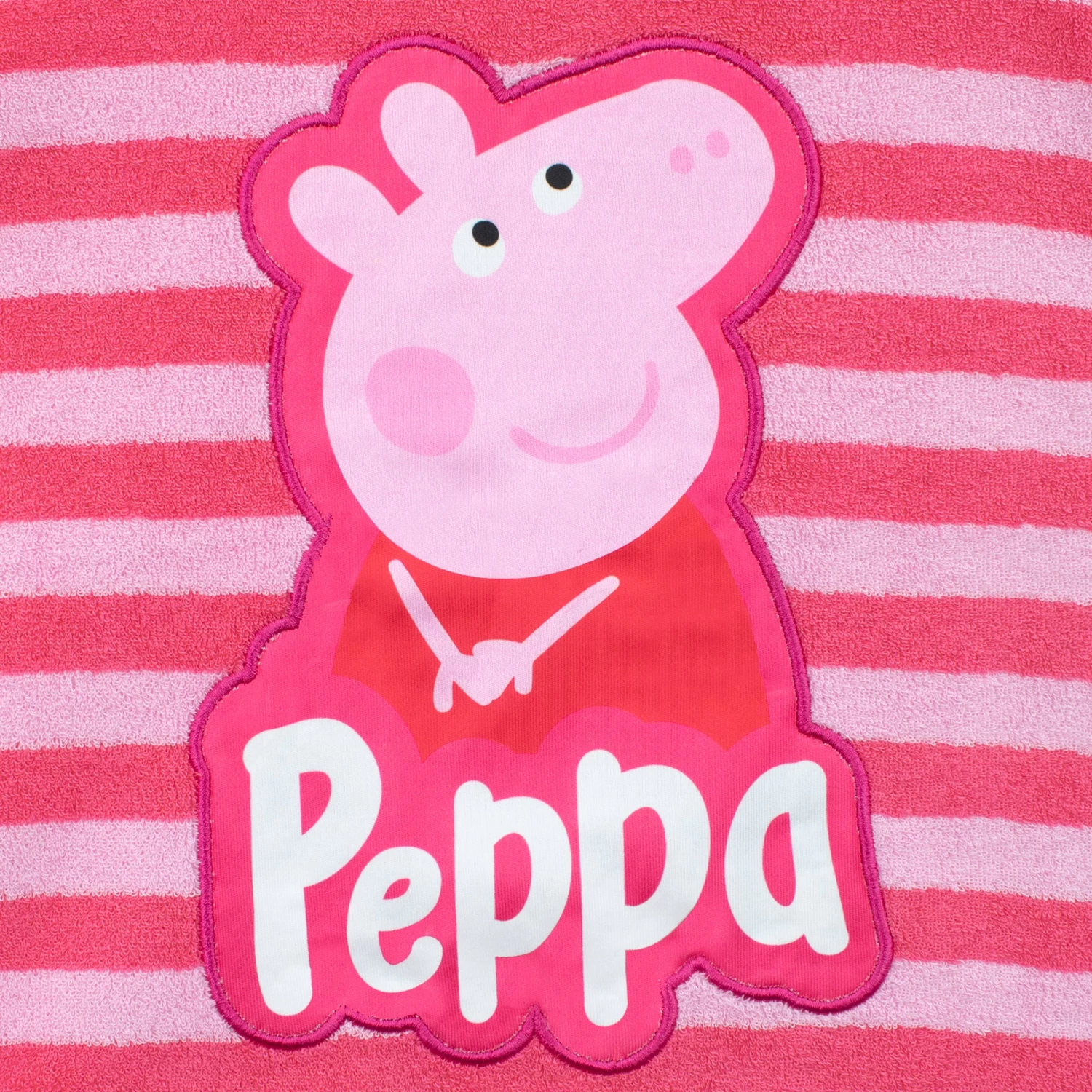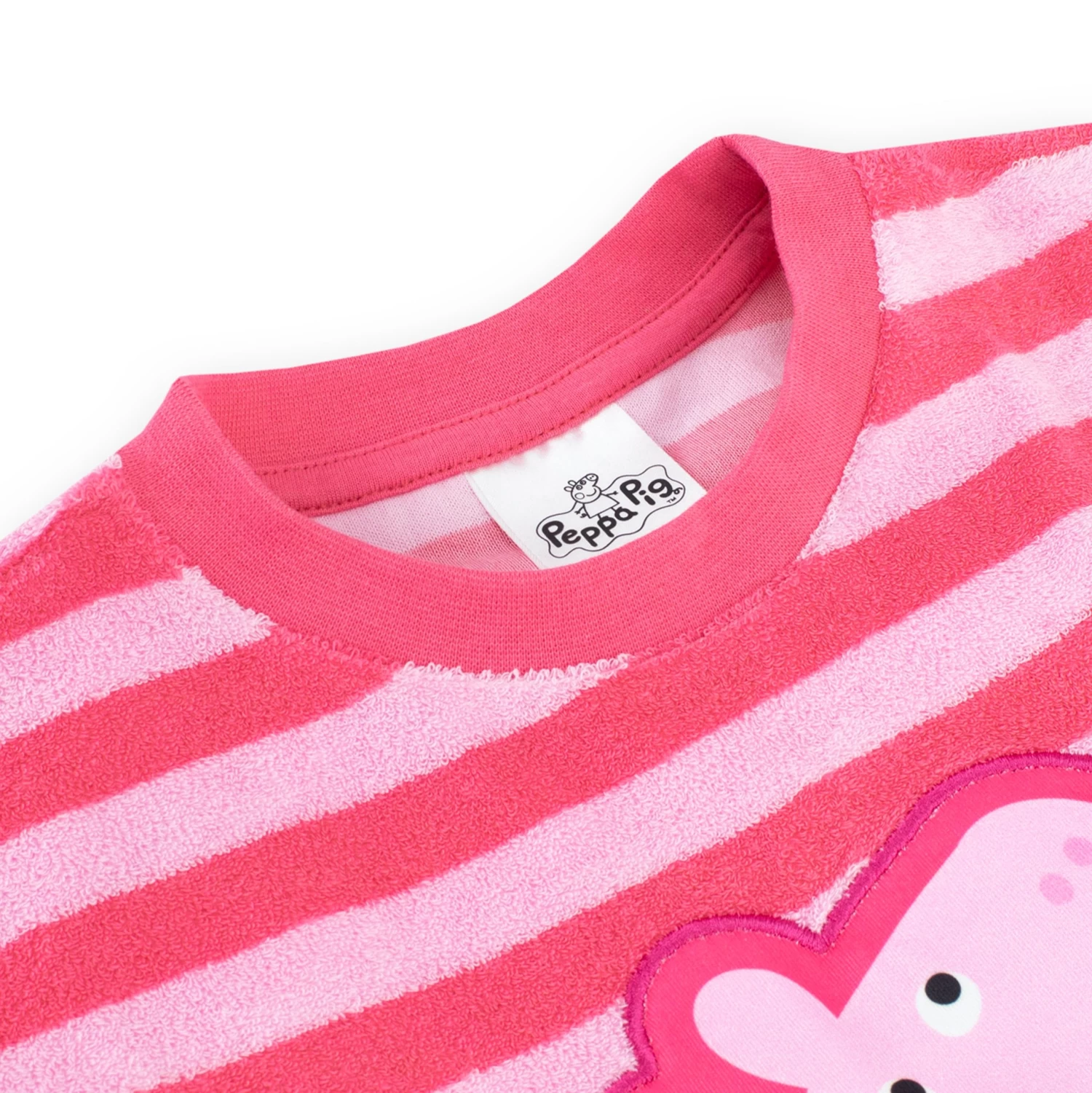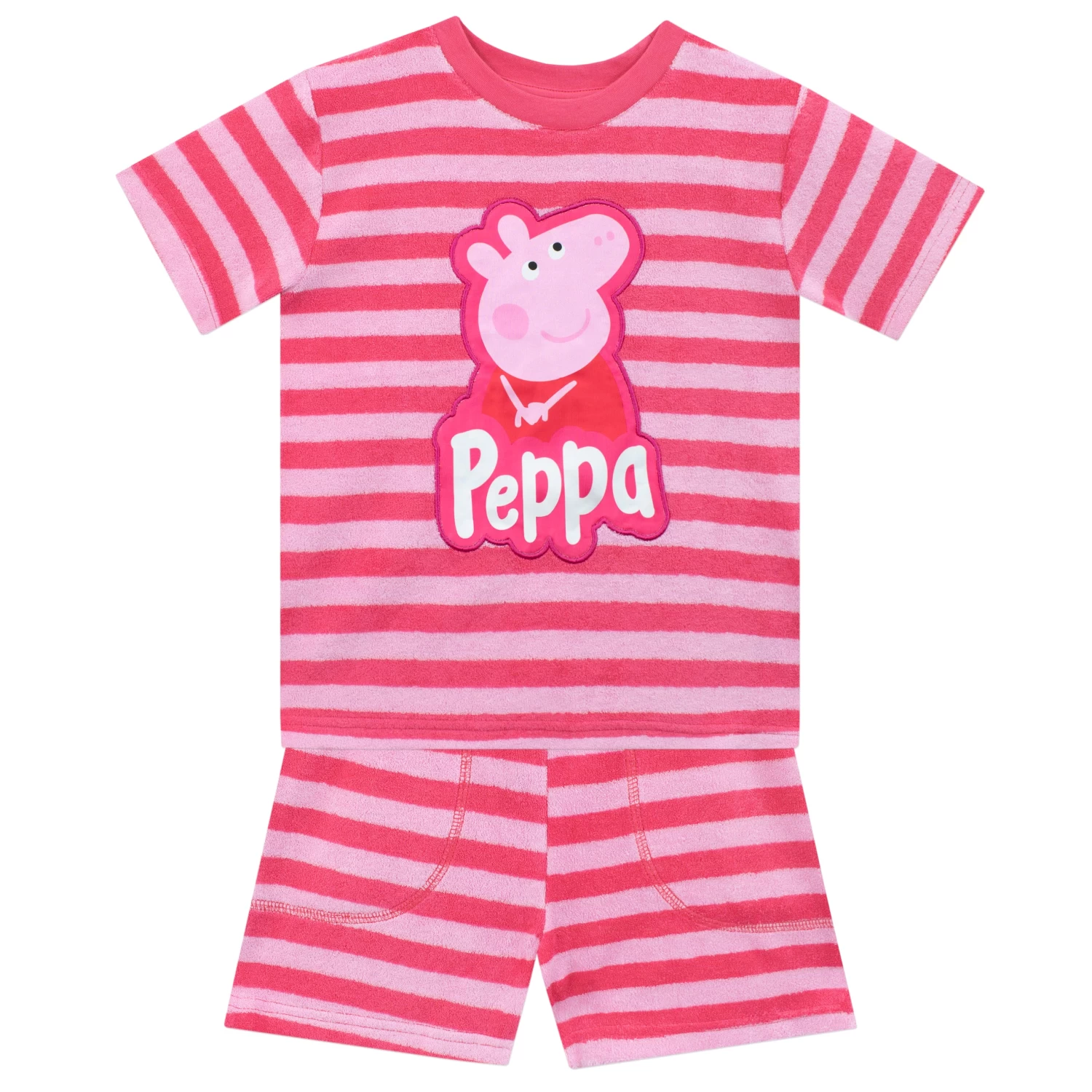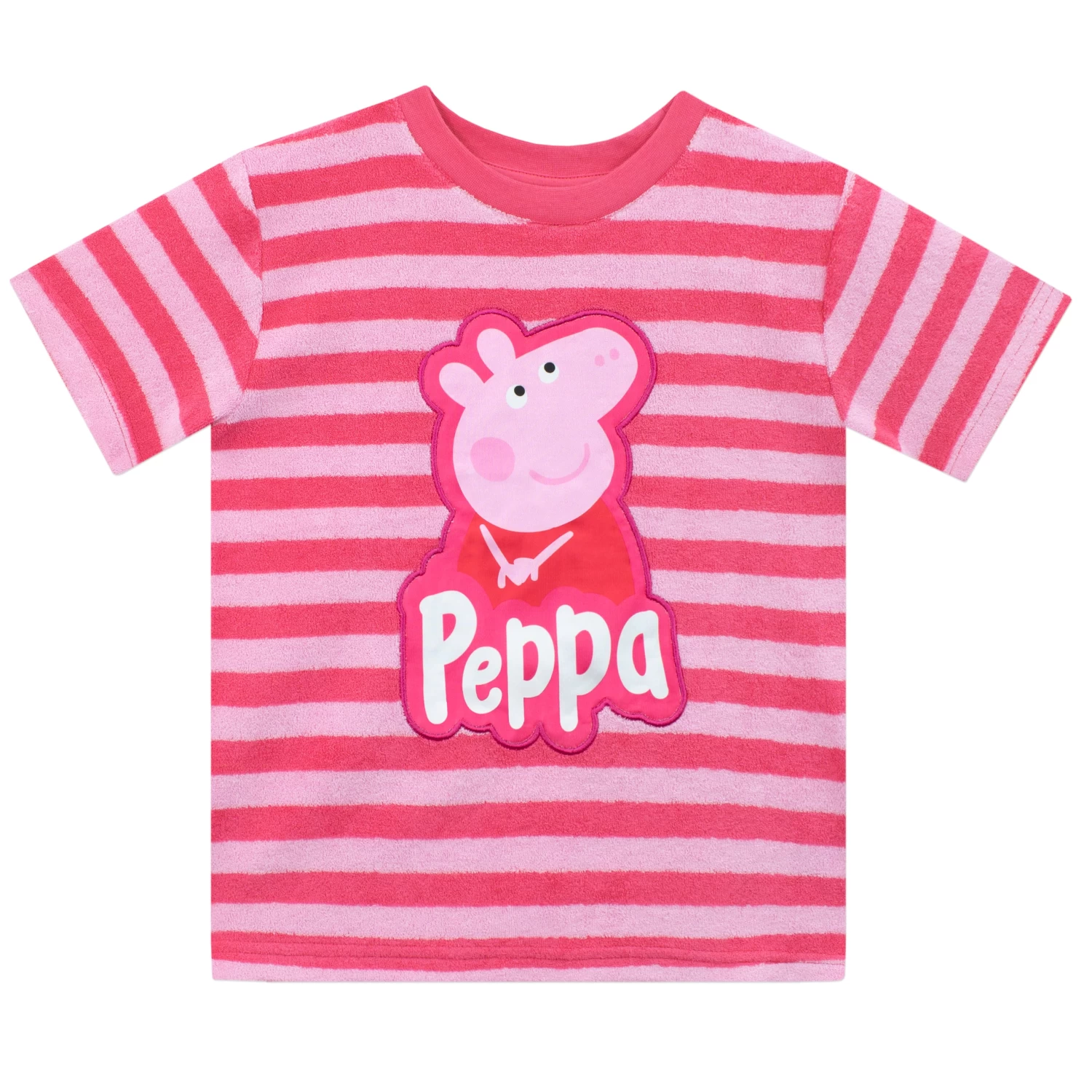 Prepare your little piglet for a splashing day out at the pool or beach with this oink-tastic Peppa Pig set! Made of soft towel material, this outfit set includes a pink stripy t-shirt that features a cute print of Peppa Pig with ‘Peppa’ printed beneath, and matching towel shorts that have an elasticated waistband and two handy pockets. Wear with their favourite Peppa Pig swimwear for a great day of swimming activities with Peppa and friends!