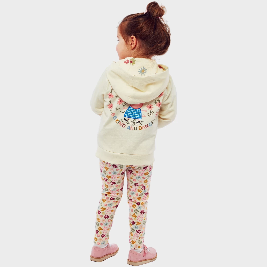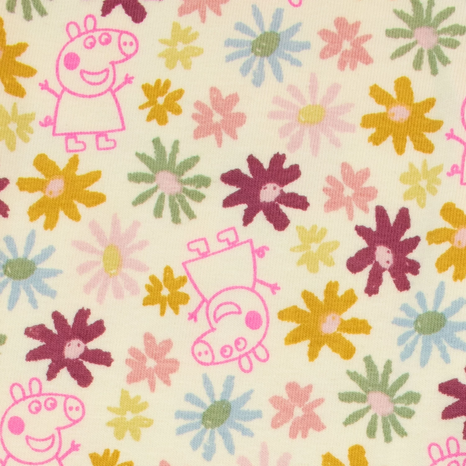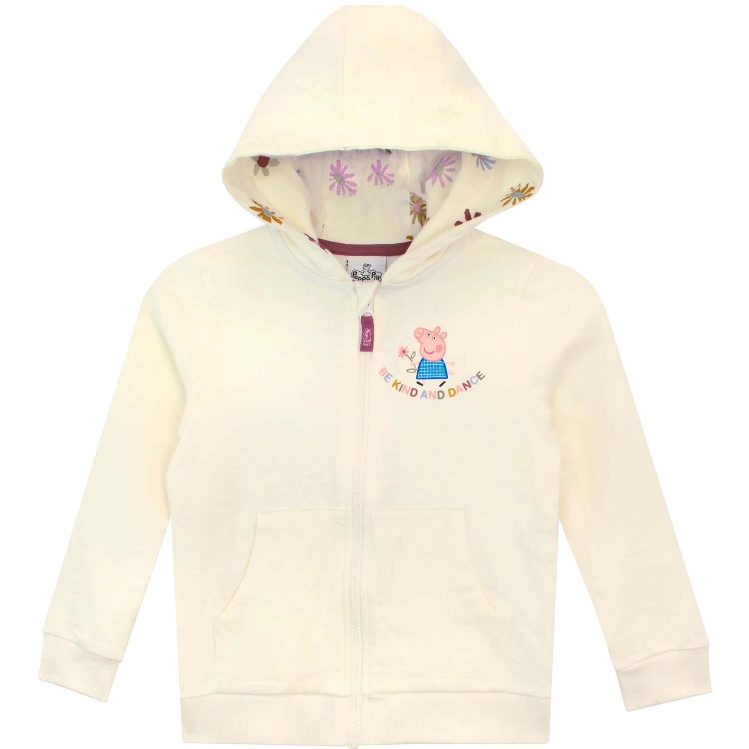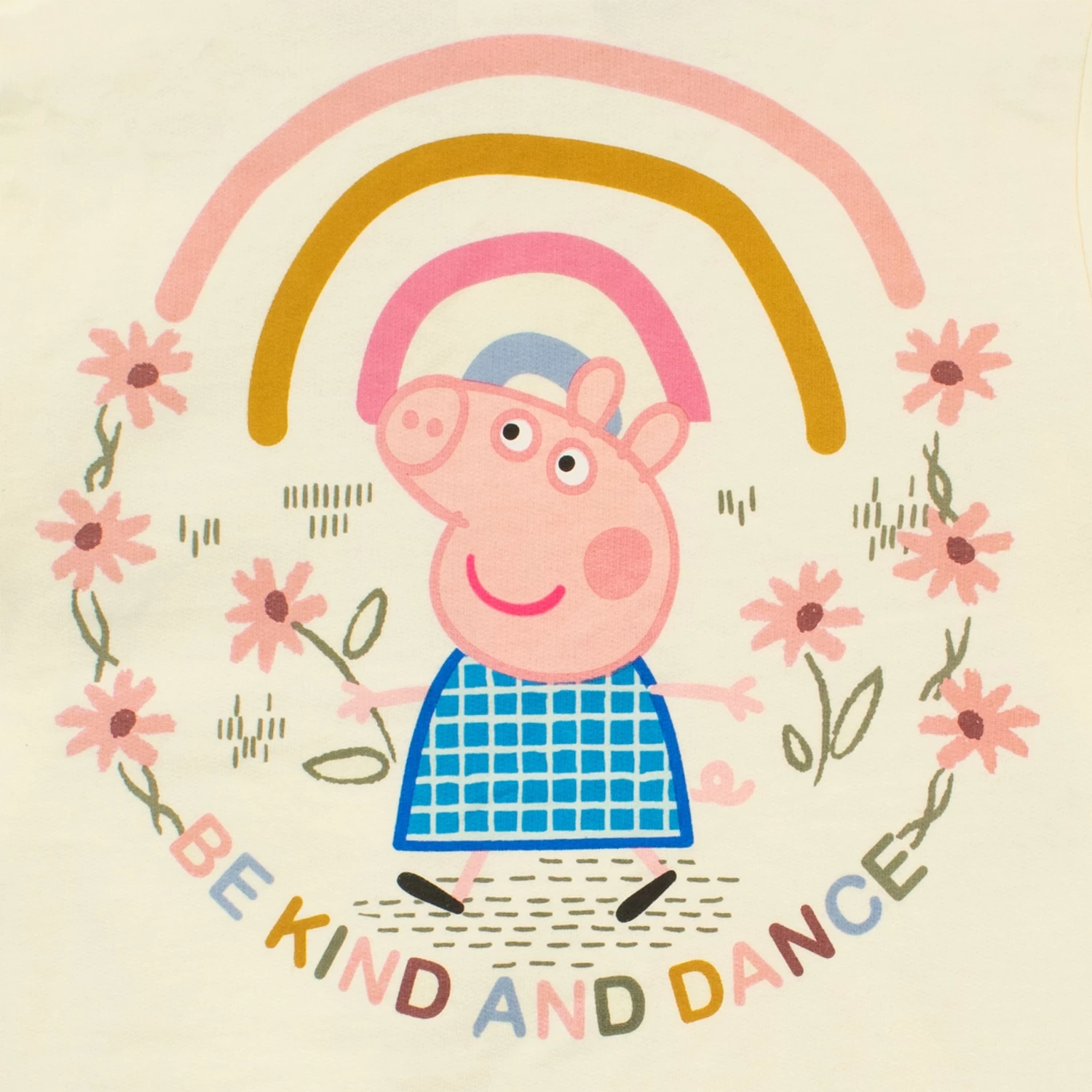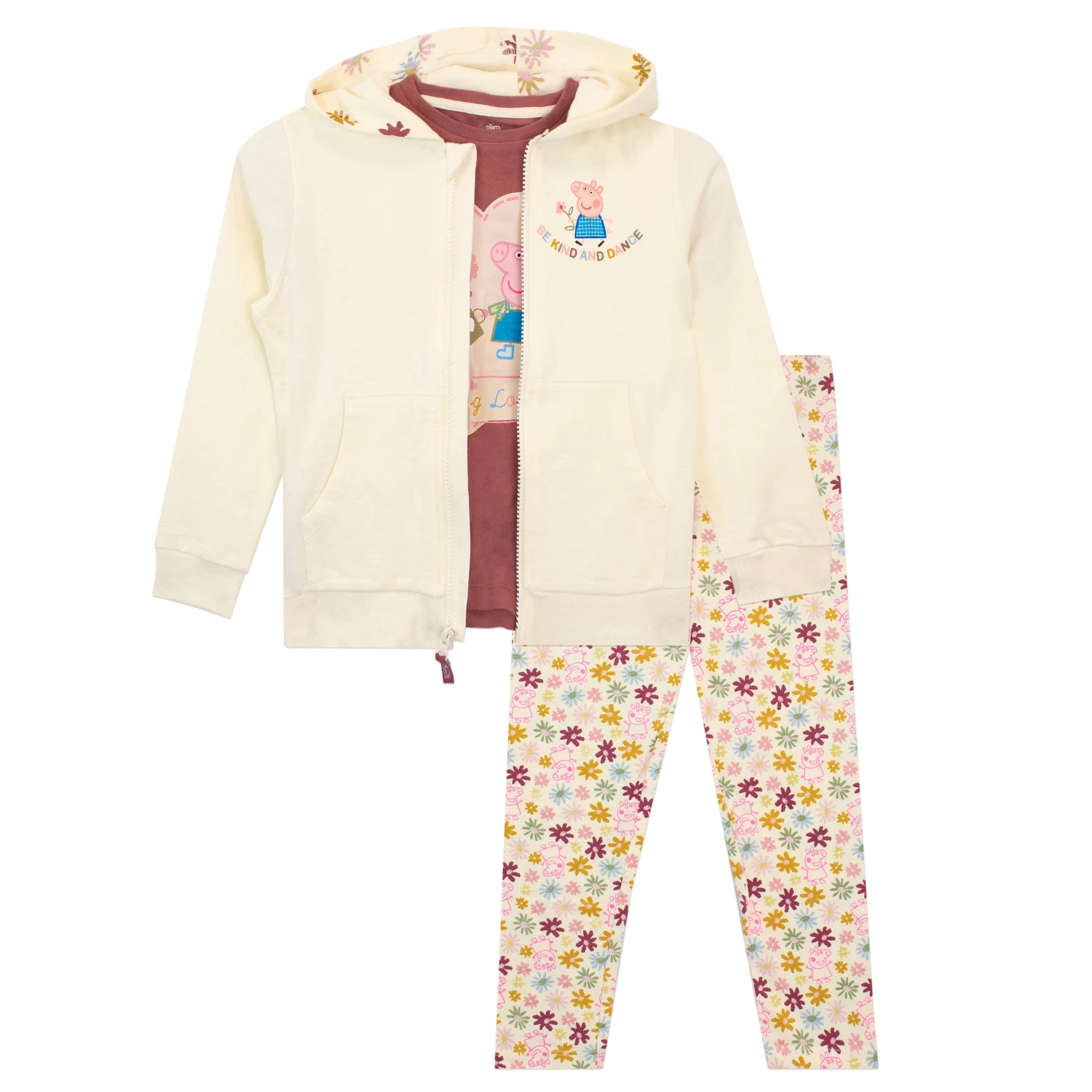 Spread love and kindness with this charming Peppa Pig three-piece outfit! This set includes a zip-up hoodie, top and leggings. The cream hoodie has pockets and a floral lining in the hood, and showcases Peppa on the chest with the slogan ‘Be Kind and Dance’ with the same slogan printed on the back with a large image of Peppa surrounded by flowers. The blush red t-shirt has stylish frills on the sleeves and a print of Peppa against a heart-shaped background, watering flowers with the slogan ‘Growing Love’. The matching leggings are cream with a floral print! Your little piglet will love to wear this cute combo together or separately to create a range of Peppa-licious outfits!