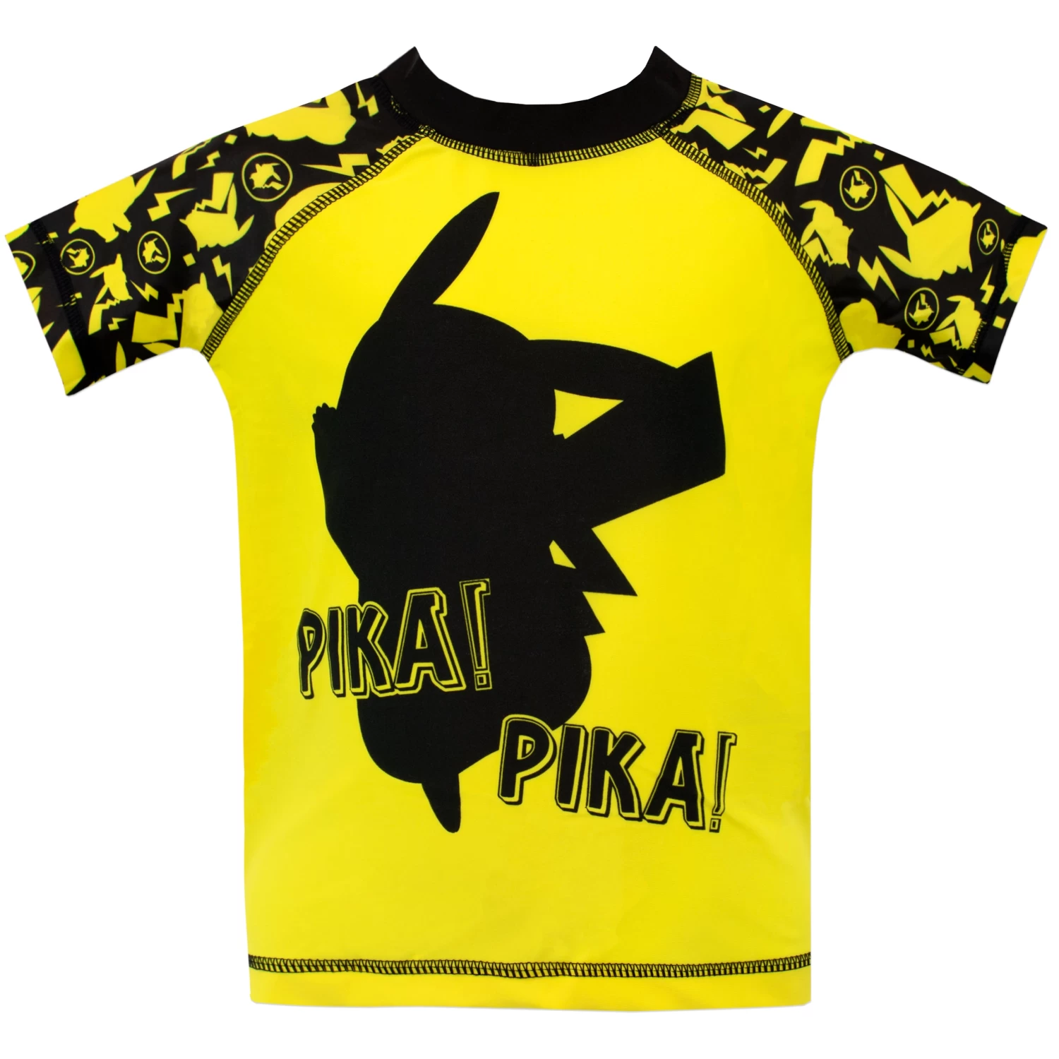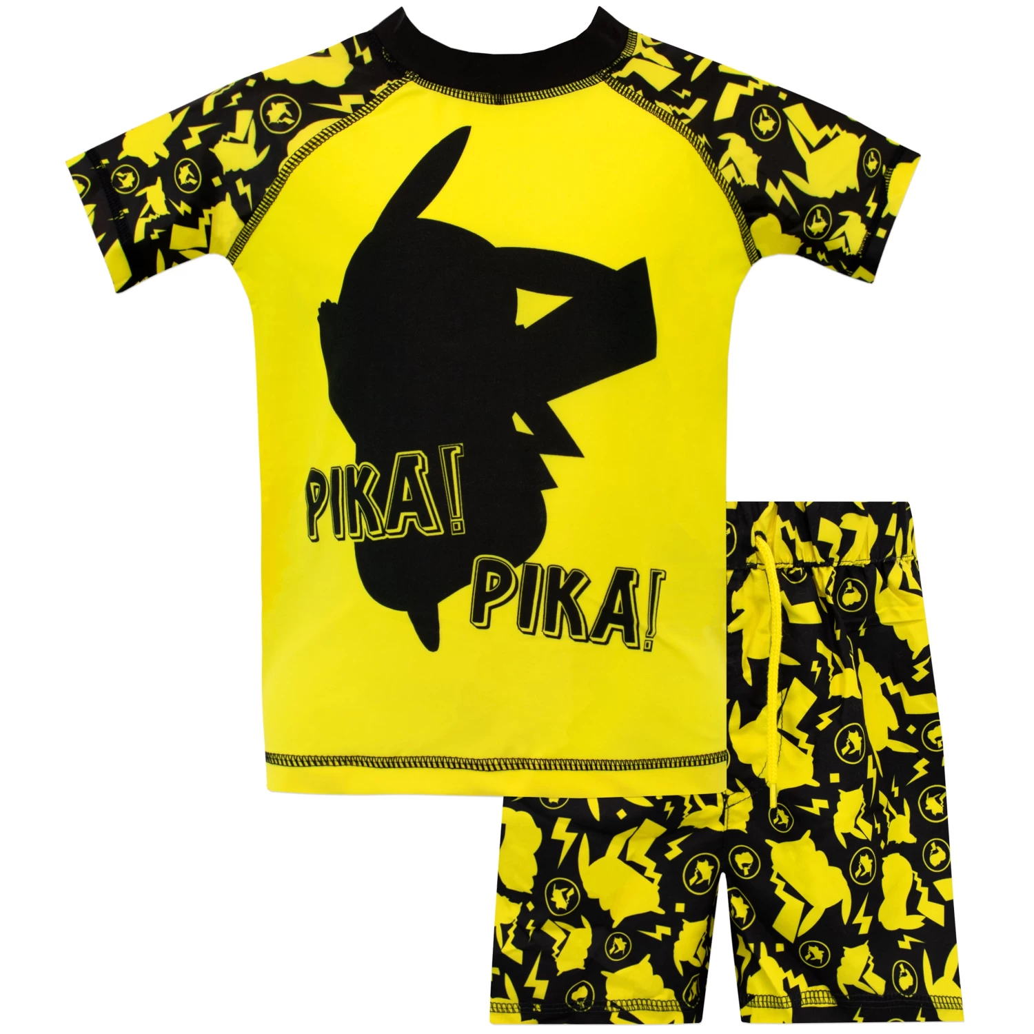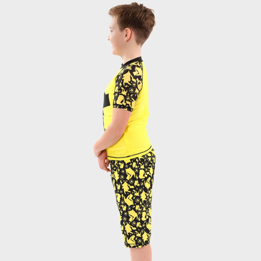 Every Pokemon trainer will love to have this awesome two piece swimsuit as part of their Pokedex! Perfect for catching all the waves, the top features the iconic and most collected Pokemon: Pikachu with the words ‘Pika! Pika!’ against a stand out yellow background. Along with short sleeves and swimming trunks that have a cool all over print of Pikachu’s silhouette, this swimming costume is perfect for collectors!