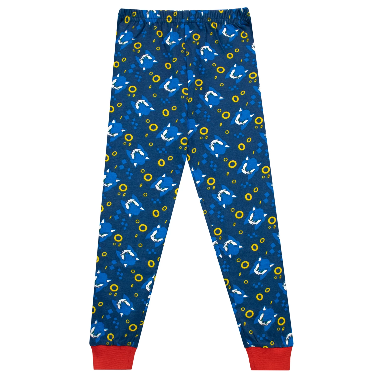 Spin off to bed in these cute Sonic the Hedgehog pyjamas. Featuring a large print of Sonic on this blue pj top with a red contrasting neckline and bold ‘SONIC’ font in white. Paired with a repeated print of Sonic and his gold rings and red cuffed hems for extra comfort. These jammies will have you speeding in your dreams in no time!