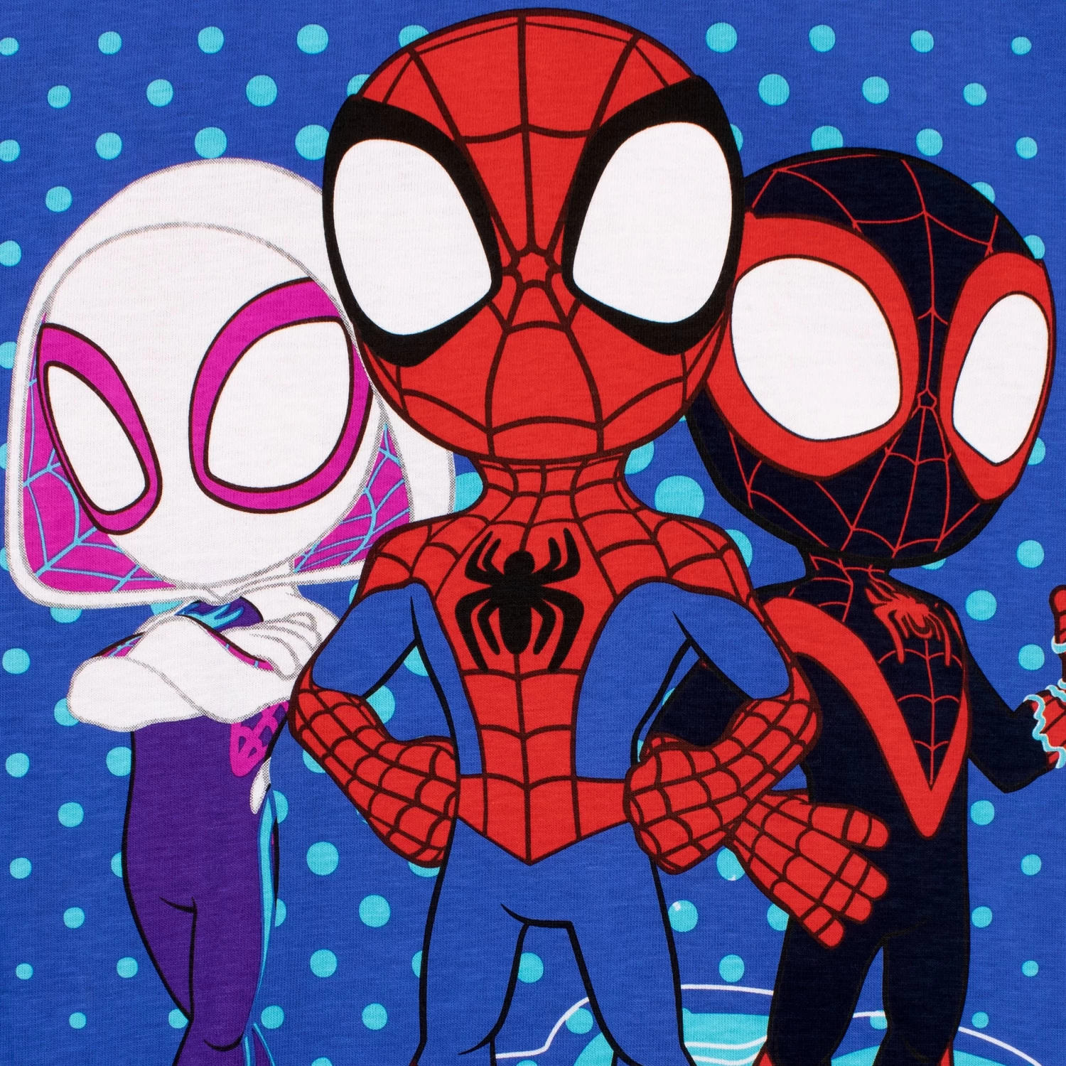 Go Webs Go! Spider-Man has teamed up with Spinn and Spider-Gwen for new adventures, and your superhero fan will dream of joining them for web-slinging adventures with these Spidey and his Amazing Friends pyjamas. The top features Peter Parker, Miles Morales and Gwen Stacy as their heroic alter egos, with the show’s name printed below. The cosy cuffed blue bottoms of the Marvel-lous Spiderman pyjama set showcase an all over print of the iconic spider insignia from Spidey’s super suit, his mask and Spider-Man himself. Marvel fans with love this super sleepwear!