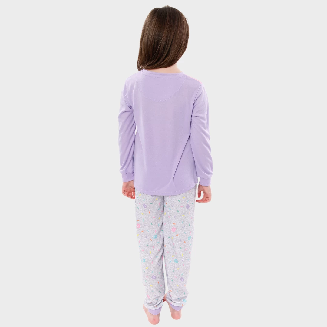 Squishmallow collectors will be able to match their favourite collectables with these Squishmallows pyjamas. Featuing two of the cuddly critters, the top has Fifi the Fox and Lola the Tie-Dye Unicorn snoozing in sleep masks on a rainbow background and ZZZ lettering. The grey bottoms complete the set with a sweet sprinkles design. Purple sleeves and cuffed bottoms will keep them cosy as they dream of the Squishmallow Squad!